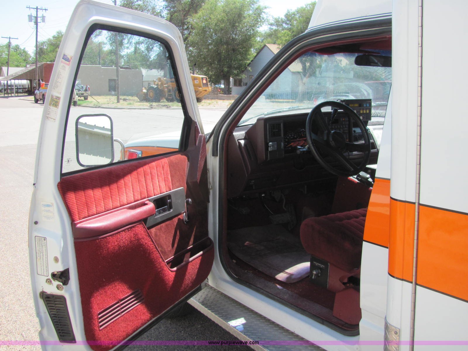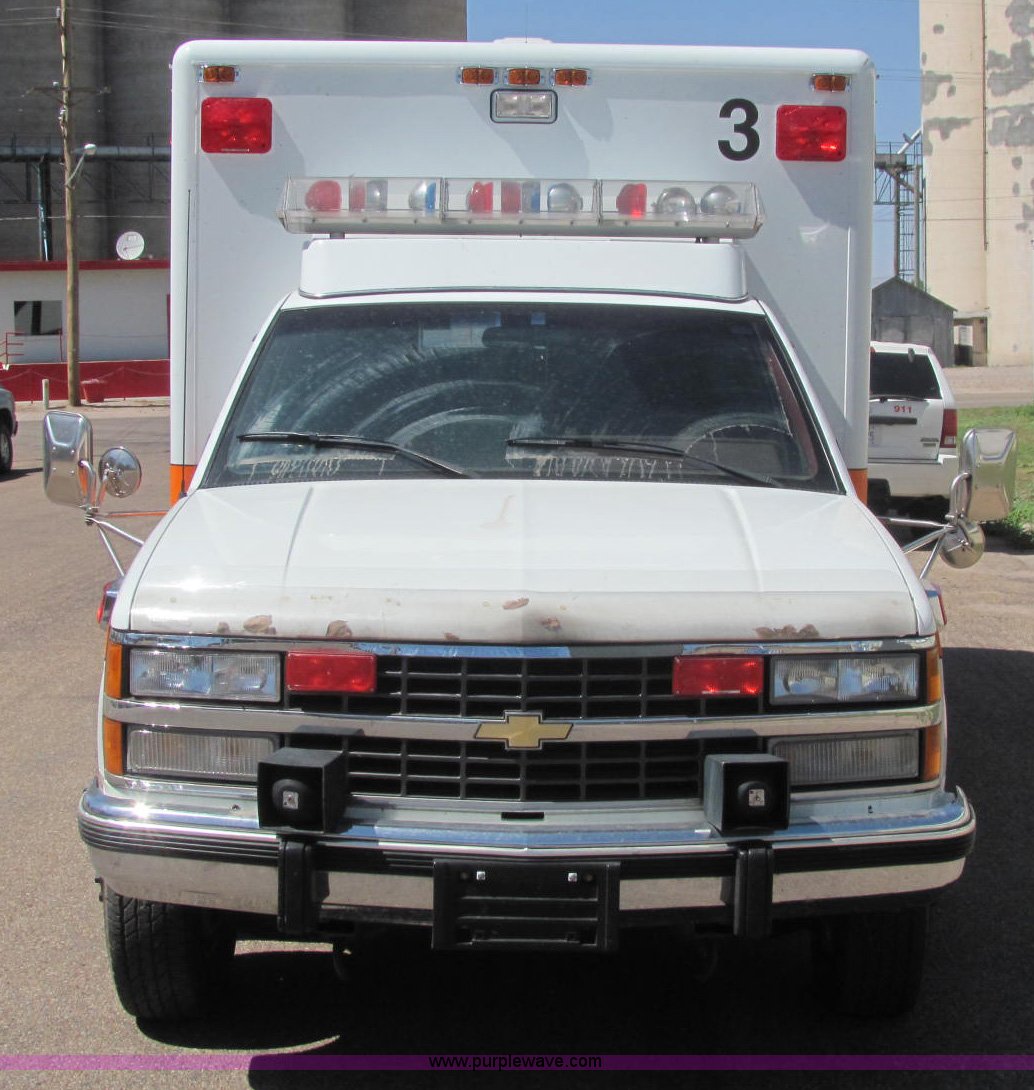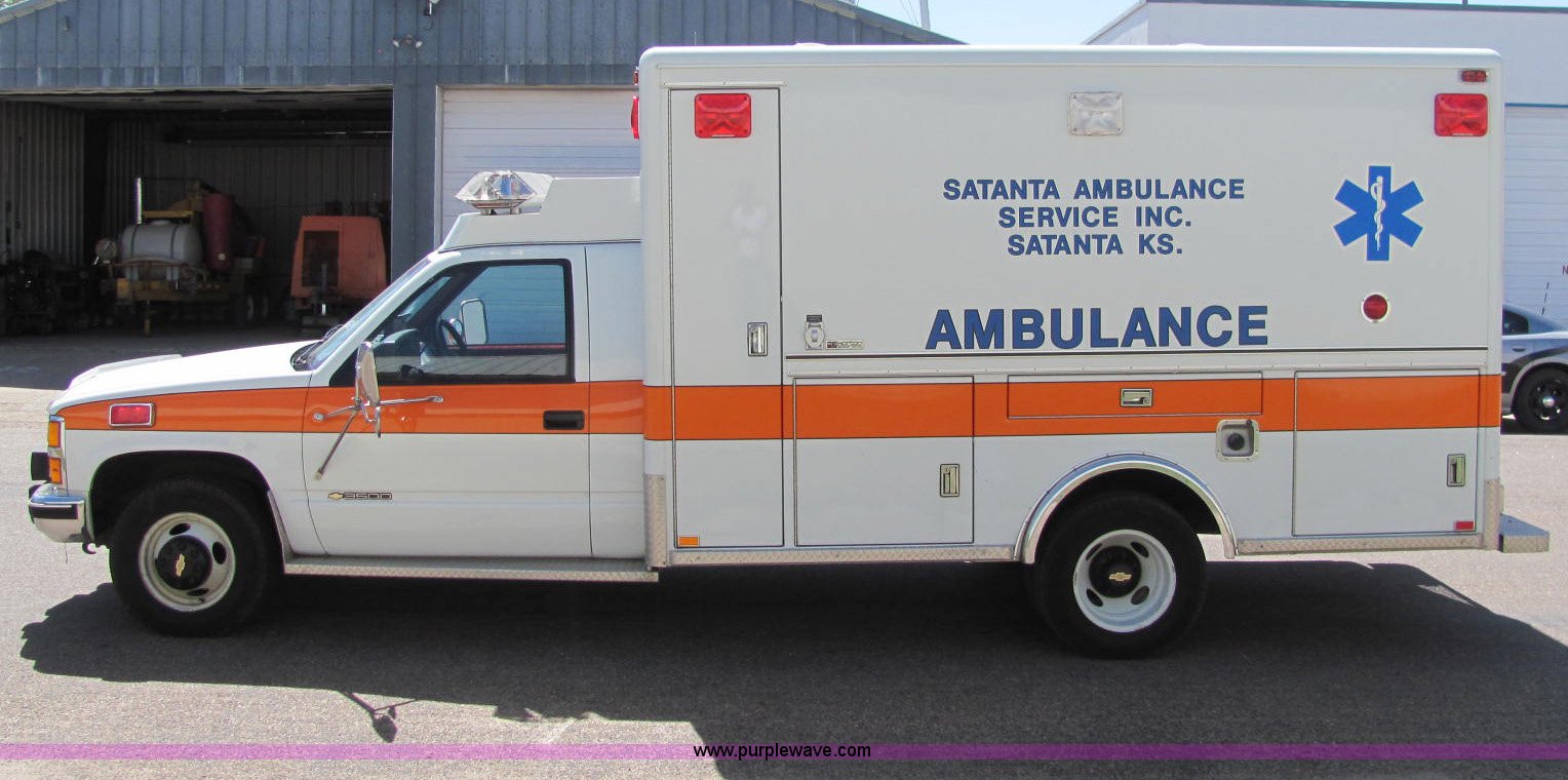 Purple Wave is selling a used Passenger Vehicle in Kansas. This item is a 1992 Chevrolet 3500 ambulance with the following: 39,222 miles on odometer, 7.4L V8 gas engine, Automatic transmission, AC and heat, Tilt, Cruise, AM/FM, Manual windows, Power locks, Cloth interior, S.U.P. SA400 radio system, Federal signal BP100 siren system, Code 3 emergency lights, Spot light, Tow hooks, Horton Emergency utility bed, Vinyl padded interior, 120V interior/exterior outlets, Oxygen hookups, Interior/exterior storage, Child's seat, Stretcher, 225/75R16 tires