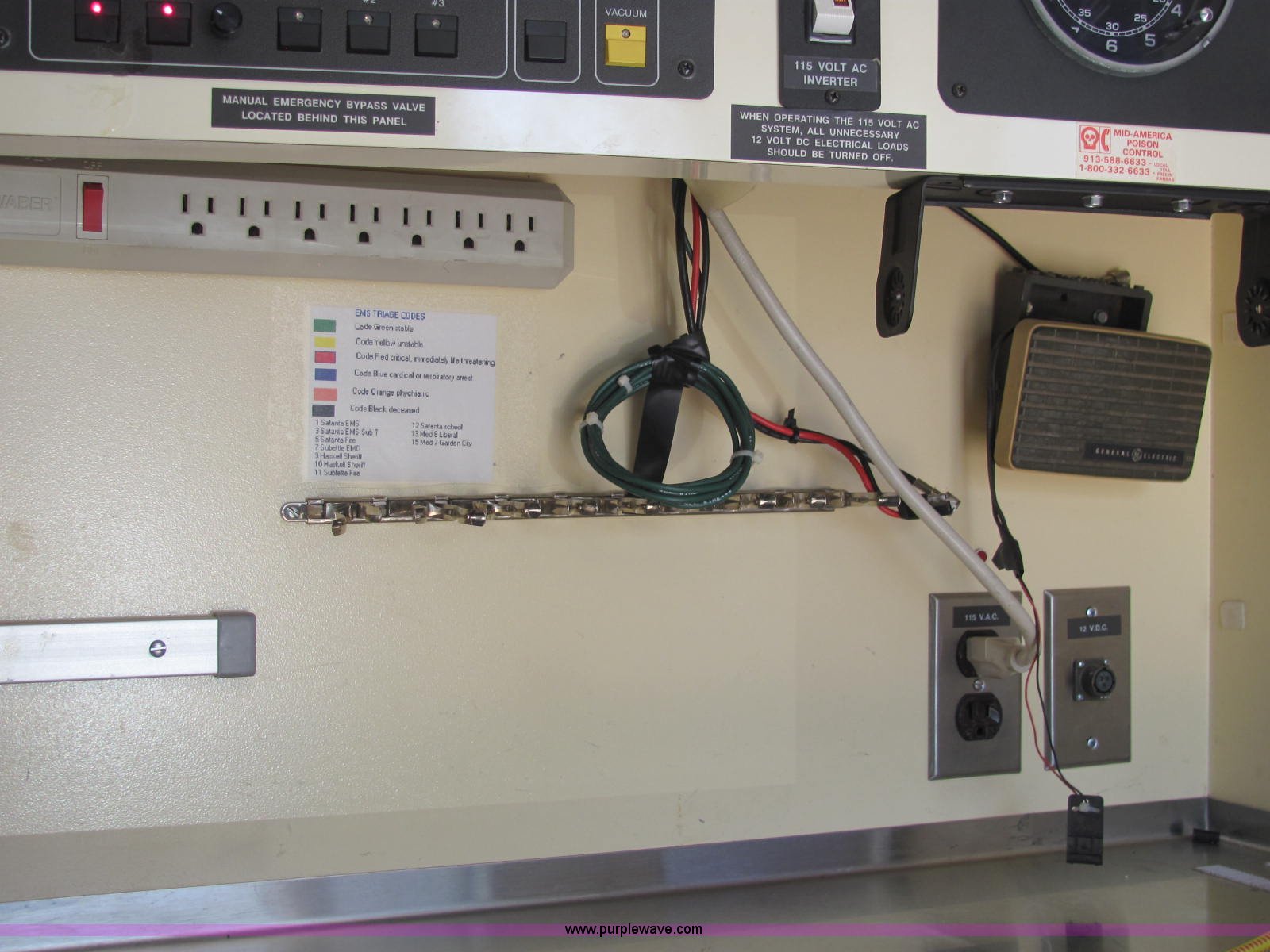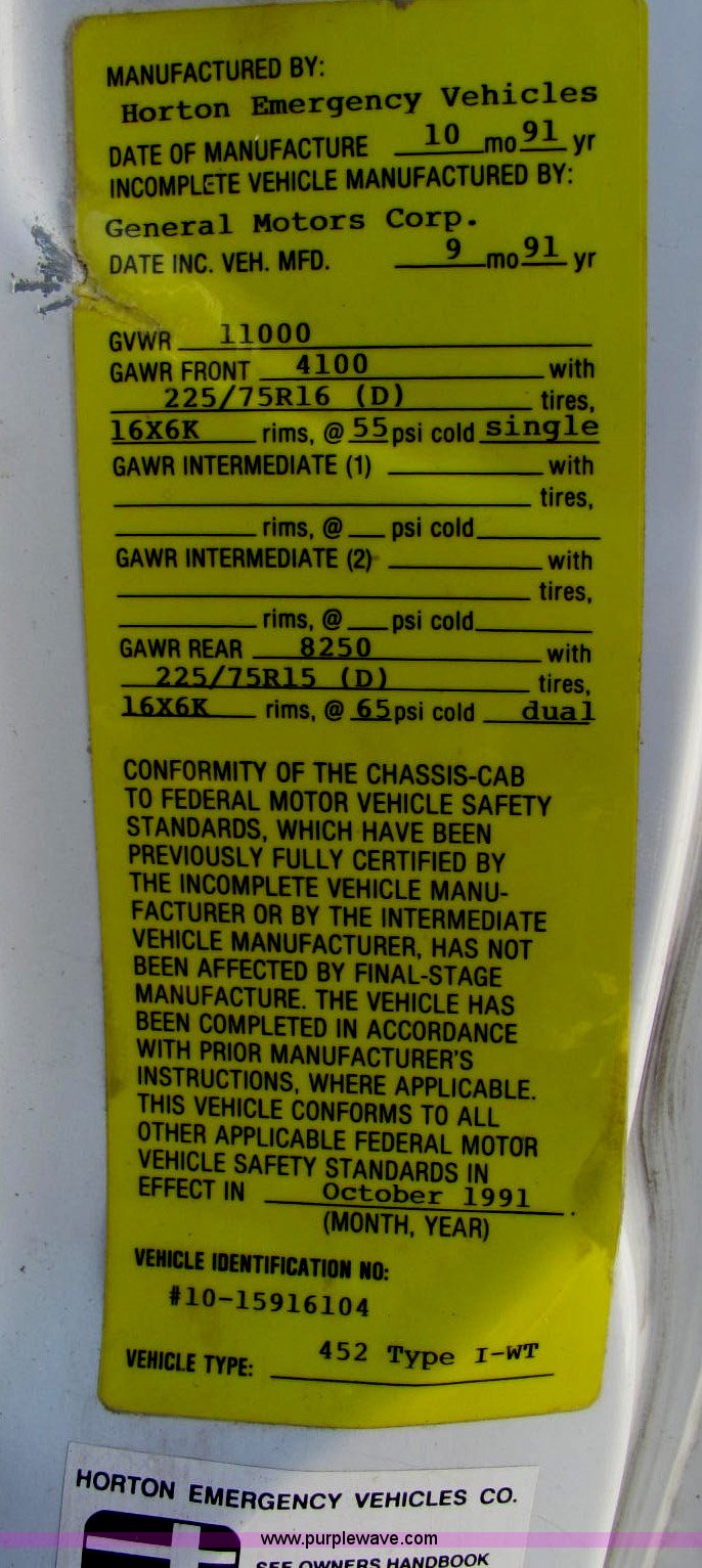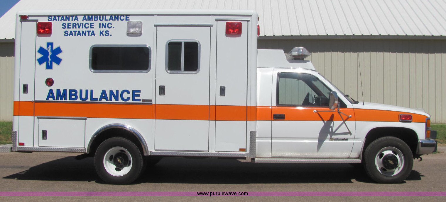 Purple Wave is selling a used Passenger Vehicle in Kansas. This item is a 1992 Chevrolet 3500 ambulance with the following: 39,222 miles on odometer, 7.4L V8 gas engine, Automatic transmission, AC and heat, Tilt, Cruise, AM/FM, Manual windows, Power locks, Cloth interior, S.U.P. SA400 radio system, Federal signal BP100 siren system, Code 3 emergency lights, Spot light, Tow hooks, Horton Emergency utility bed, Vinyl padded interior, 120V interior/exterior outlets, Oxygen hookups, Interior/exterior storage, Child's seat, Stretcher, 225/75R16 tires
