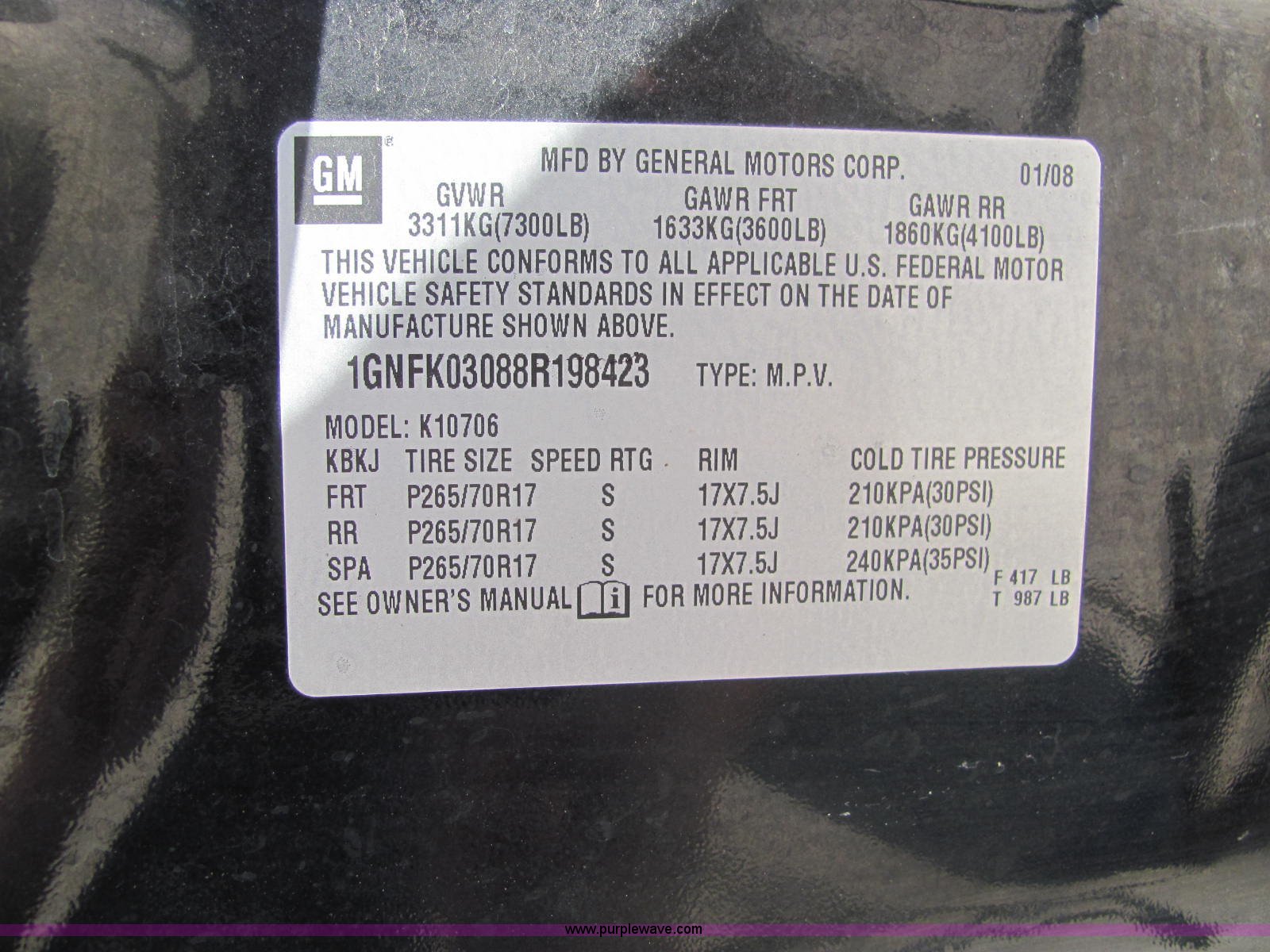 Purple Wave is selling a used Passenger Vehicle in Kansas. This item is a 2008 Chevrolet Tahoe LS SUV with the following: 115,211 miles on odometer, 5.3L V8 SFI gas engine, Flex-fuel E85, Automatic transmission, Four wheel drive, AC and heat, Tilt, Cruise, AM/FM/CD, Power windows, locks, mirrors, and seats, Cloth interior front, Vinyl interior rear, Spotlight, Receiver hitch, Trailer wiring, Michelin LTX265/70R17 tires, Less than 10,000 miles, Cracked windshield