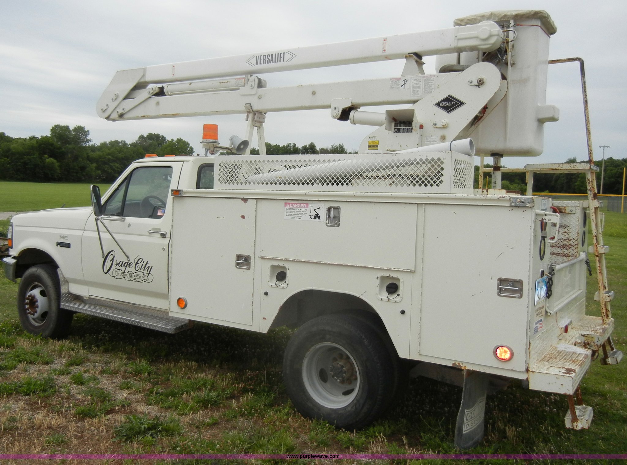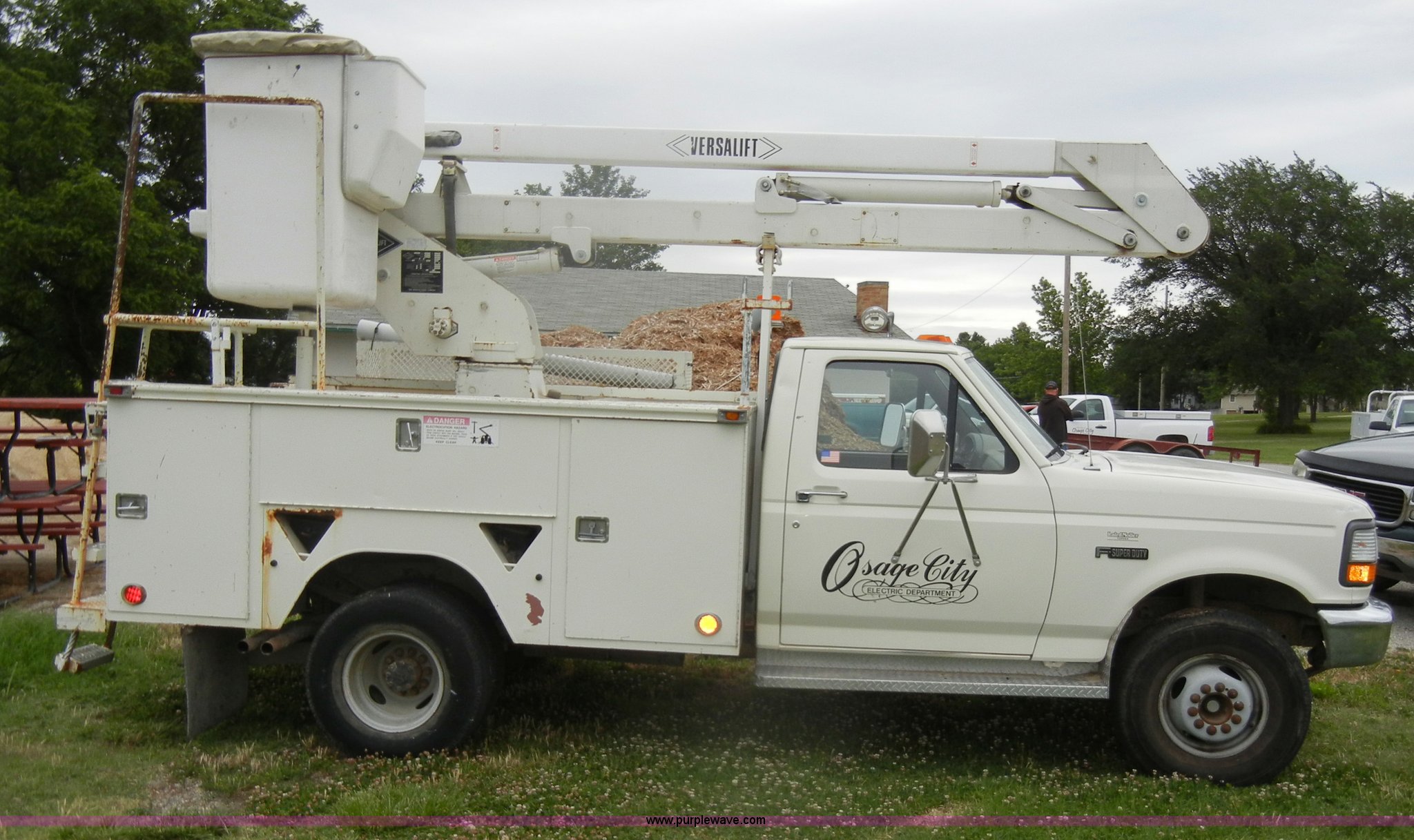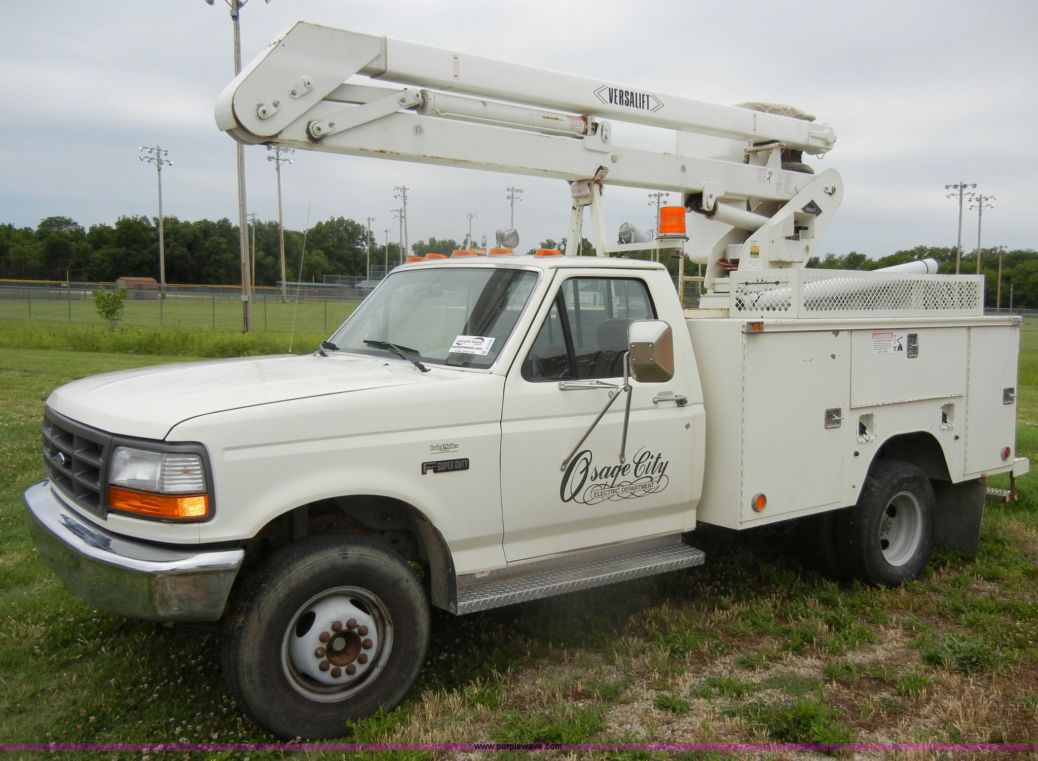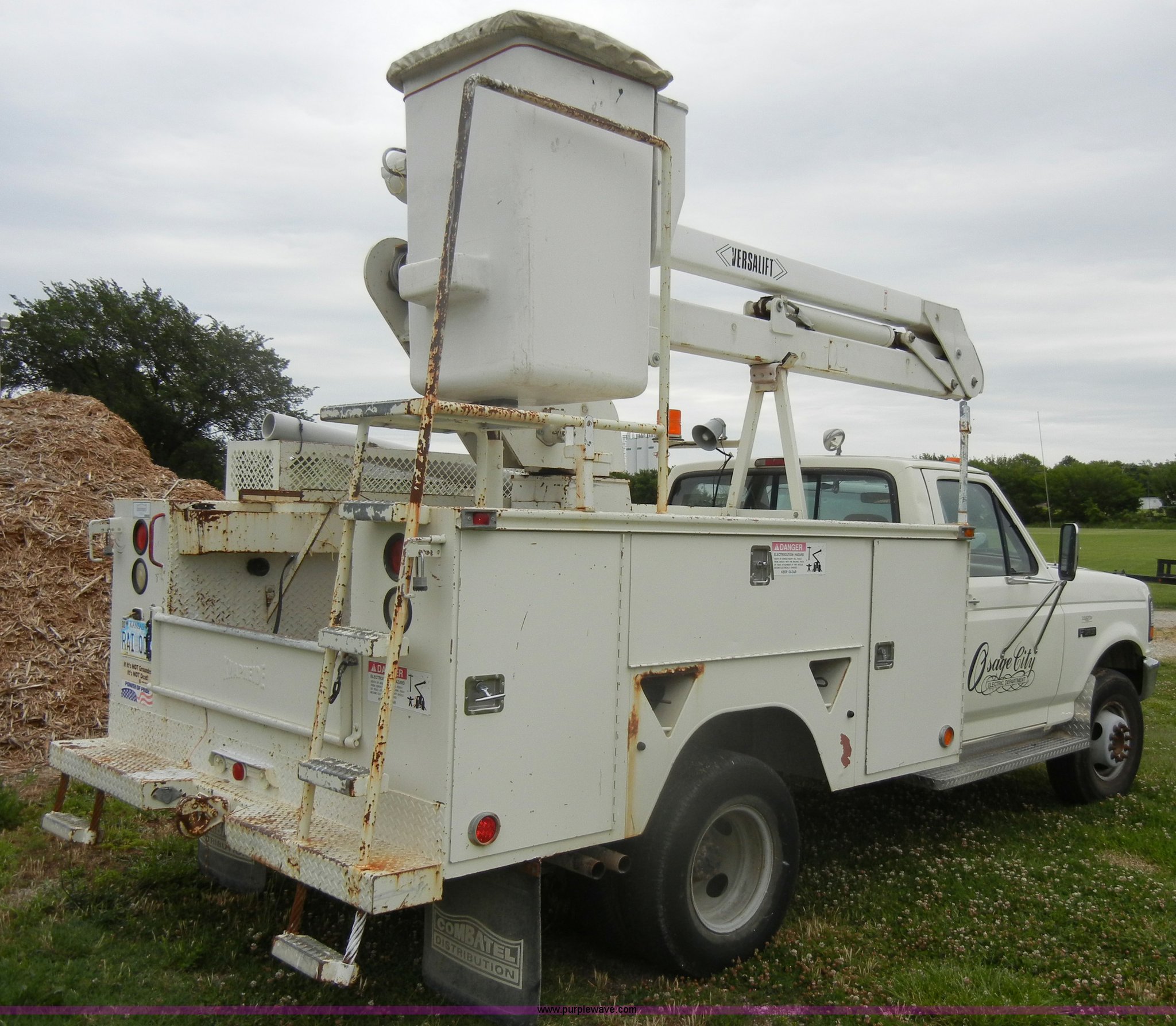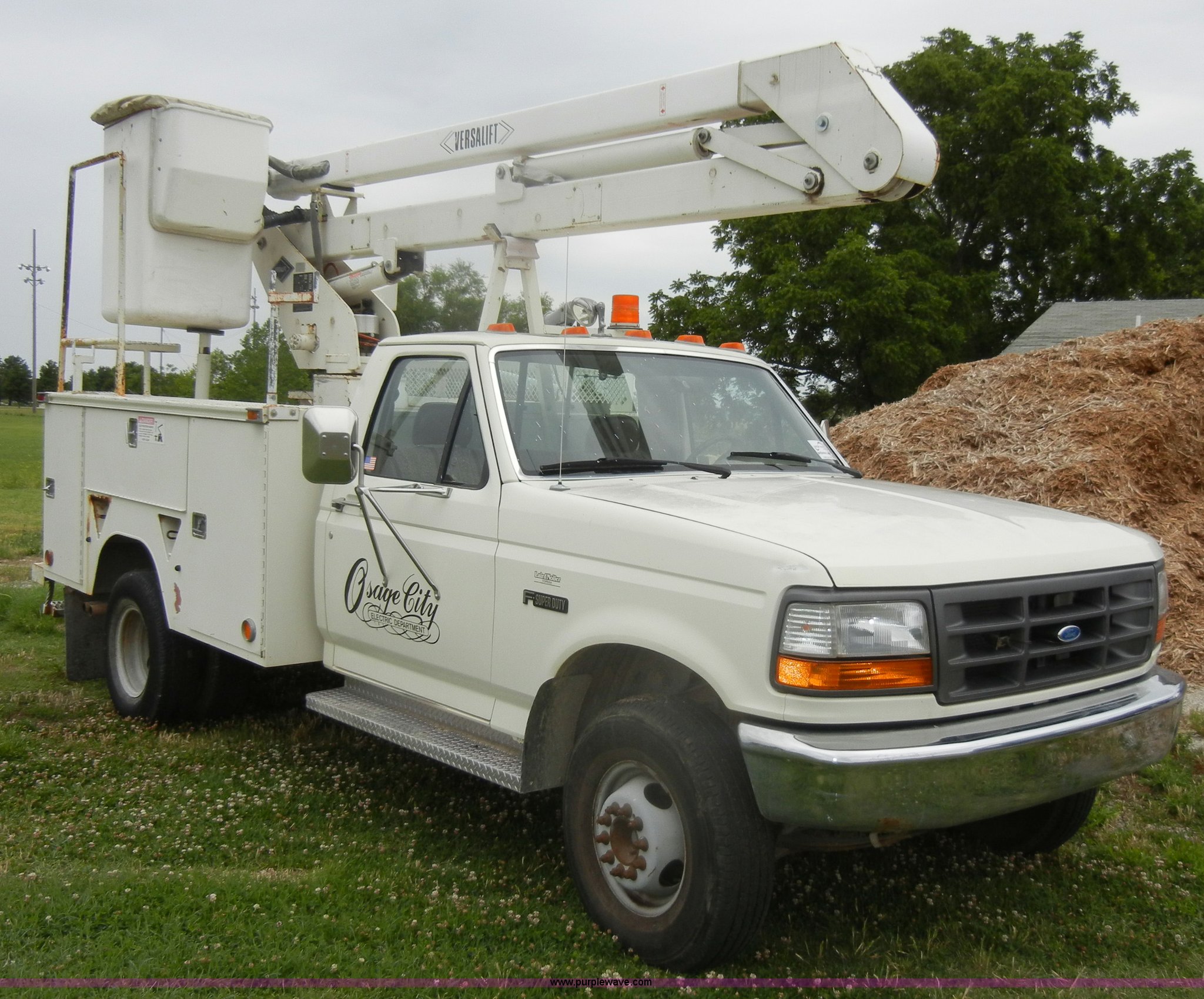1994 Ford F450 Super Duty crane truck. 33,141 miles on odometer, 7.5L V8 EFI gas engine, Five speed manual transmission, AC and heat, AM/FM, Manual windows and locks, Rear sliding window, Vinyl interior, Side steps, Knapheide utility bed Model 6108-50DB, Serial 731241-688625, 1994 Versalift crane 5,074 hours on meter, Model V032PI, Serial K9473, 300 lb platform capacity, 32' platform height, Insulated boom, Dual fuel tanks, Pintle hitch, Trailer wiring, 235/85R16 tires Rear duals, Interior/exterior cosmetic damage, Paint peeling, Dents and scratches. 1FDLF47G0REA18063. City of Osage Parks Department. 704 S 2nd Street. Osage City, KS 66523