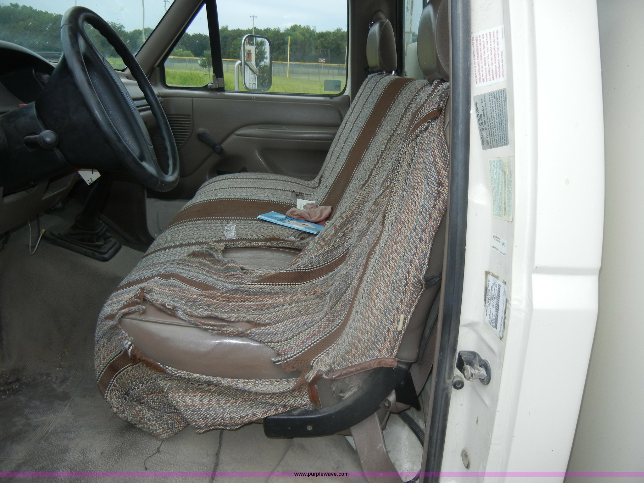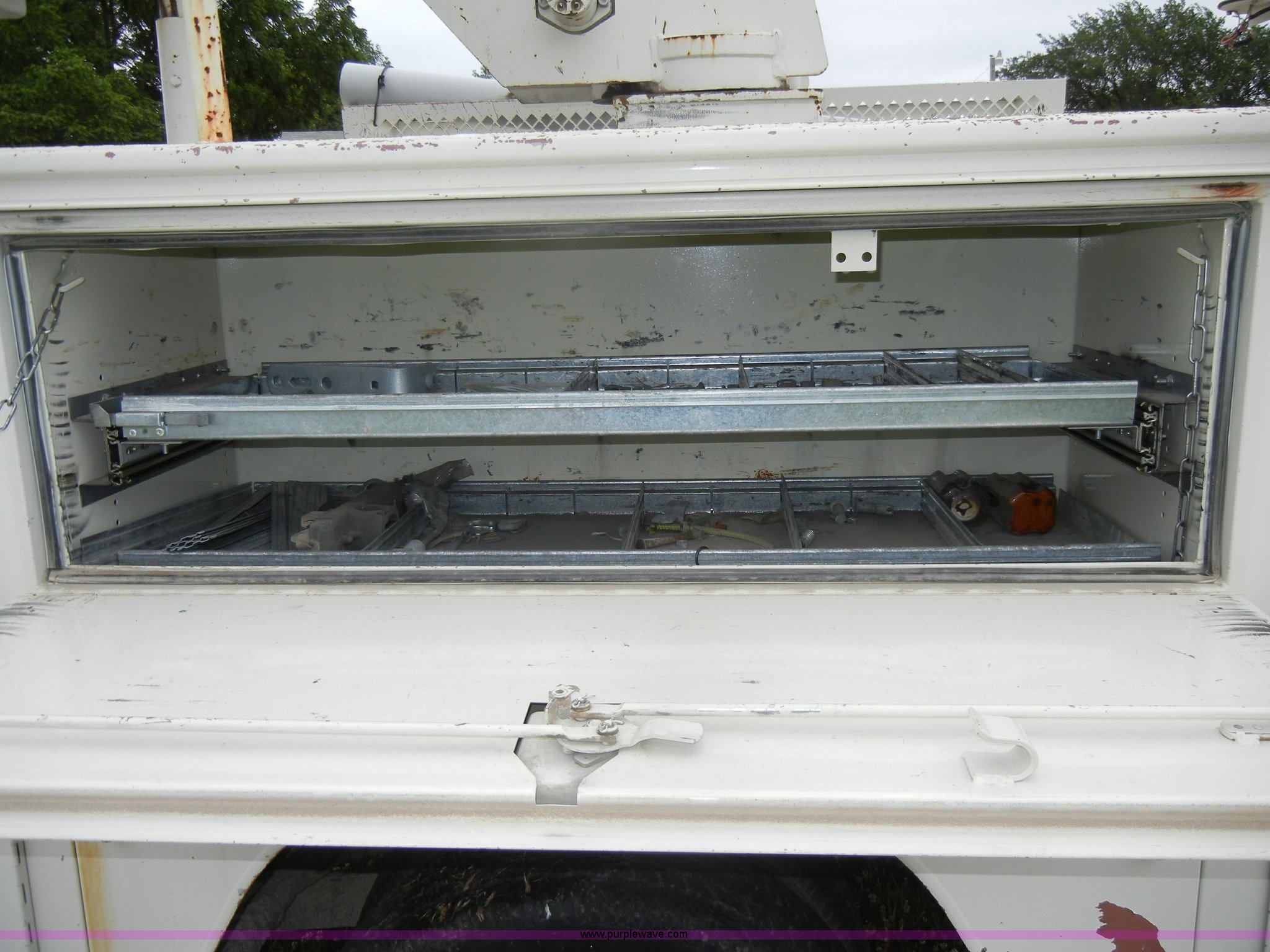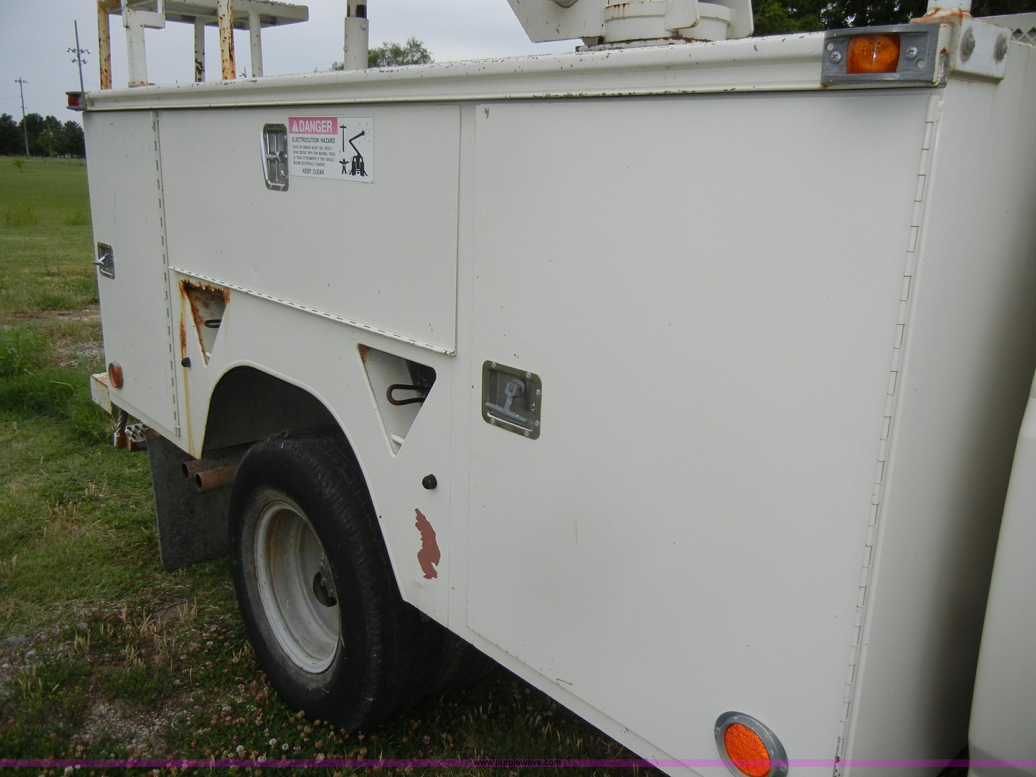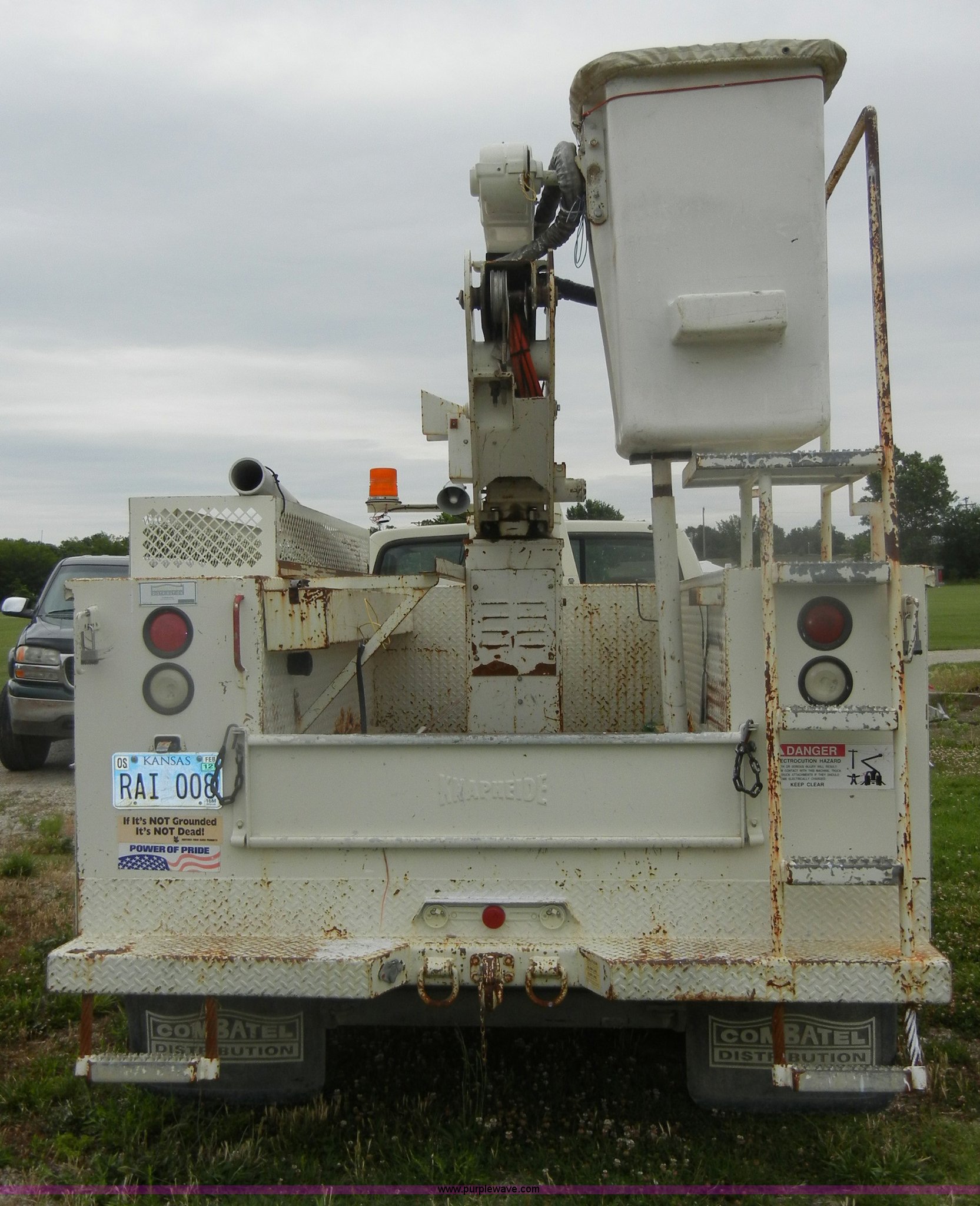 Purple Wave is selling a used Bucket Truck in Kansas. This item is a 1994 Ford F450 Super Duty crane truck with the following: 33,141 miles on odometer, 7.5L V8 EFI gas engine, Five speed manual transmission, AC and heat, AM/FM, Manual windows and locks, Rear sliding window, Vinyl interior, Side steps, Knapheide utility bed, Model 6108-50DB, Serial 731241-688625, 1994 Versalift crane, 5,074 hours on meter, Model V032PI, Serial K9473, 300 lb platform capacity, 32' platform height, Insulated boom, Dual fuel tanks, Pintle hitch, Trailer wiring, 235/85R16 tires, Rear duals, Interior/exterior cosmetic damage, Paint peeling, Dents and scratches
