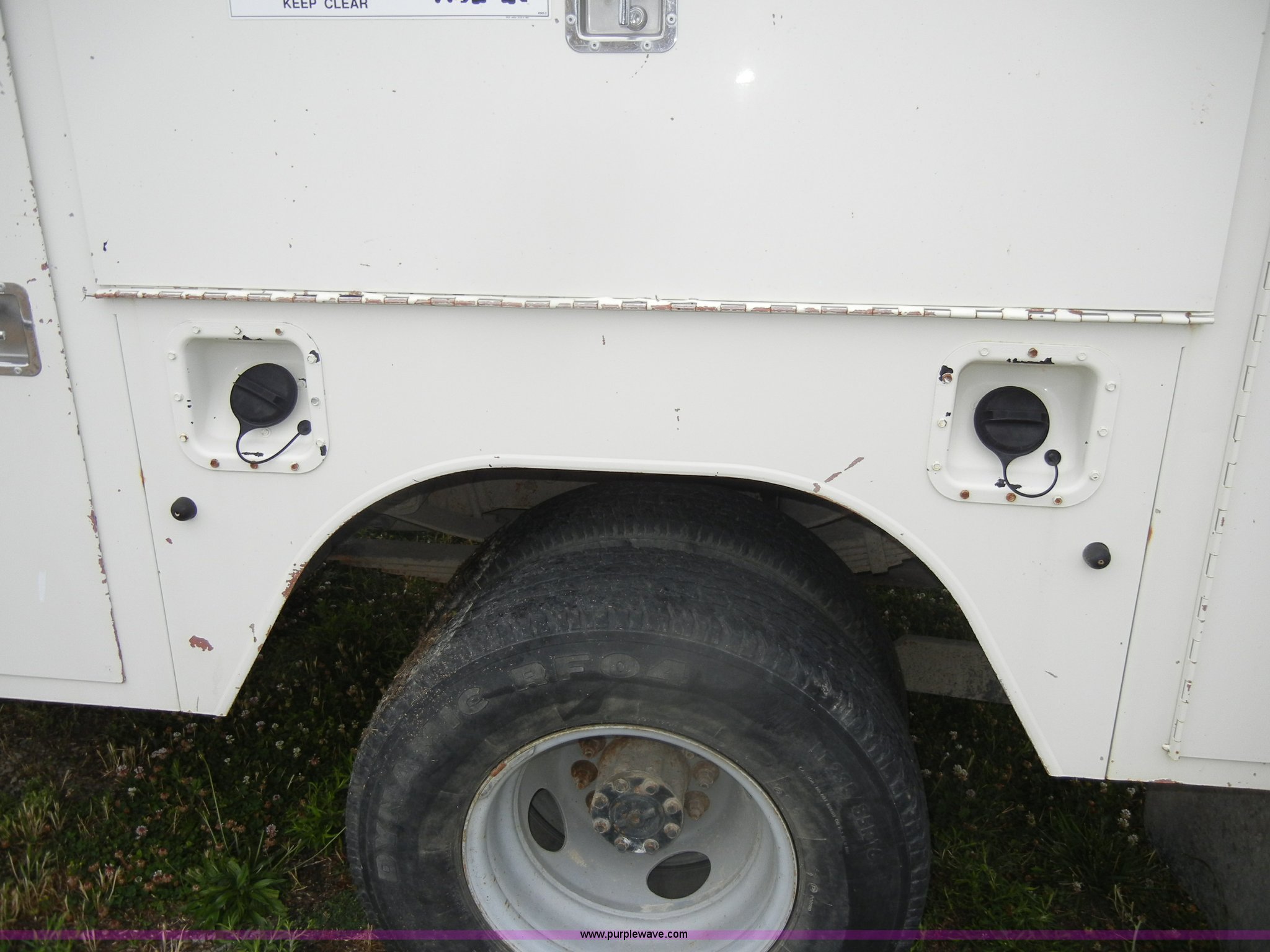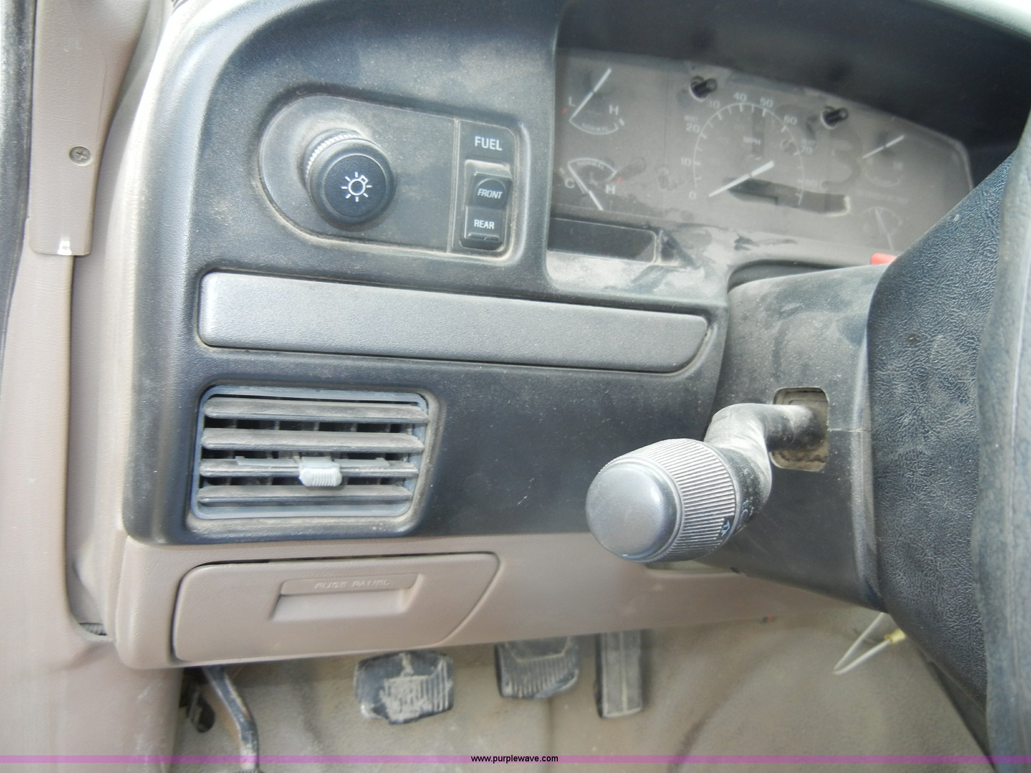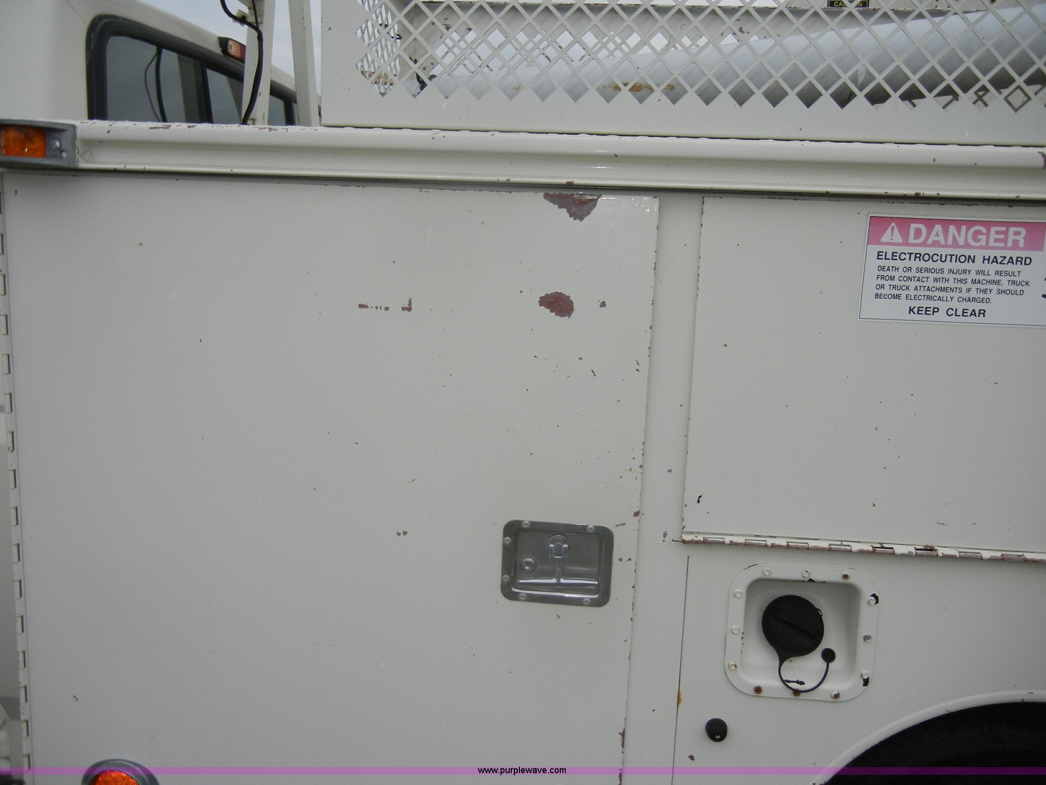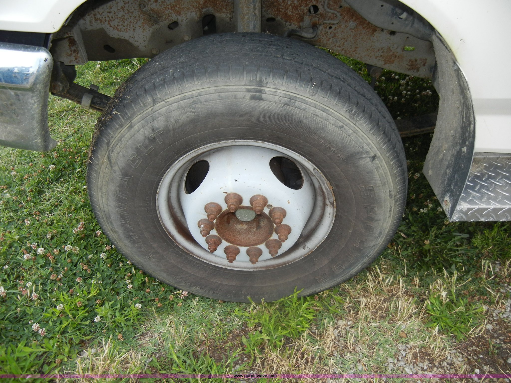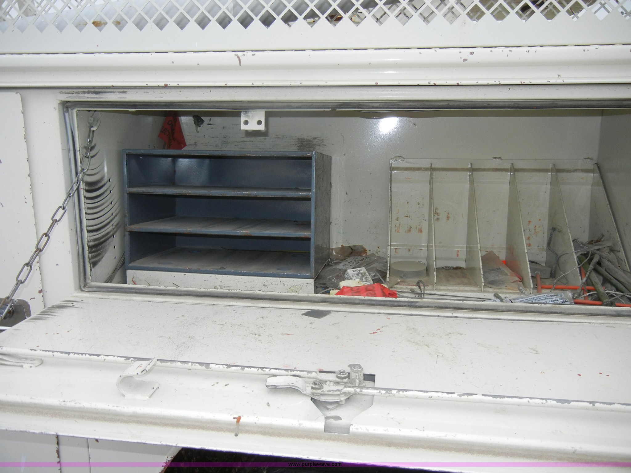 Purple Wave is selling a used Bucket Truck in Kansas. This item is a 1994 Ford F450 Super Duty crane truck with the following: 33,141 miles on odometer, 7.5L V8 EFI gas engine, Five speed manual transmission, AC and heat, AM/FM, Manual windows and locks, Rear sliding window, Vinyl interior, Side steps, Knapheide utility bed, Model 6108-50DB, Serial 731241-688625, 1994 Versalift crane, 5,074 hours on meter, Model V032PI, Serial K9473, 300 lb platform capacity, 32' platform height, Insulated boom, Dual fuel tanks, Pintle hitch, Trailer wiring, 235/85R16 tires, Rear duals, Interior/exterior cosmetic damage, Paint peeling, Dents and scratches