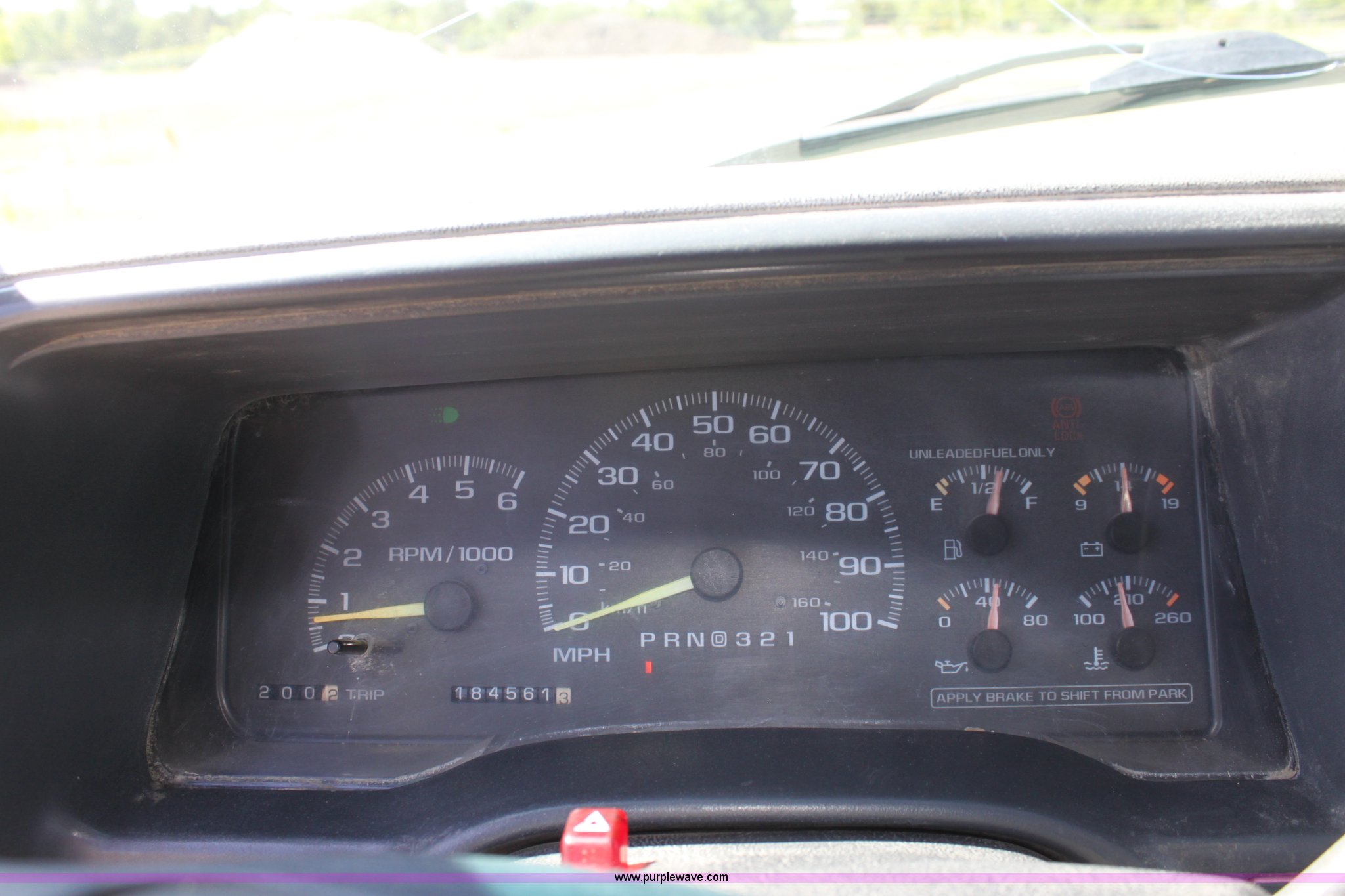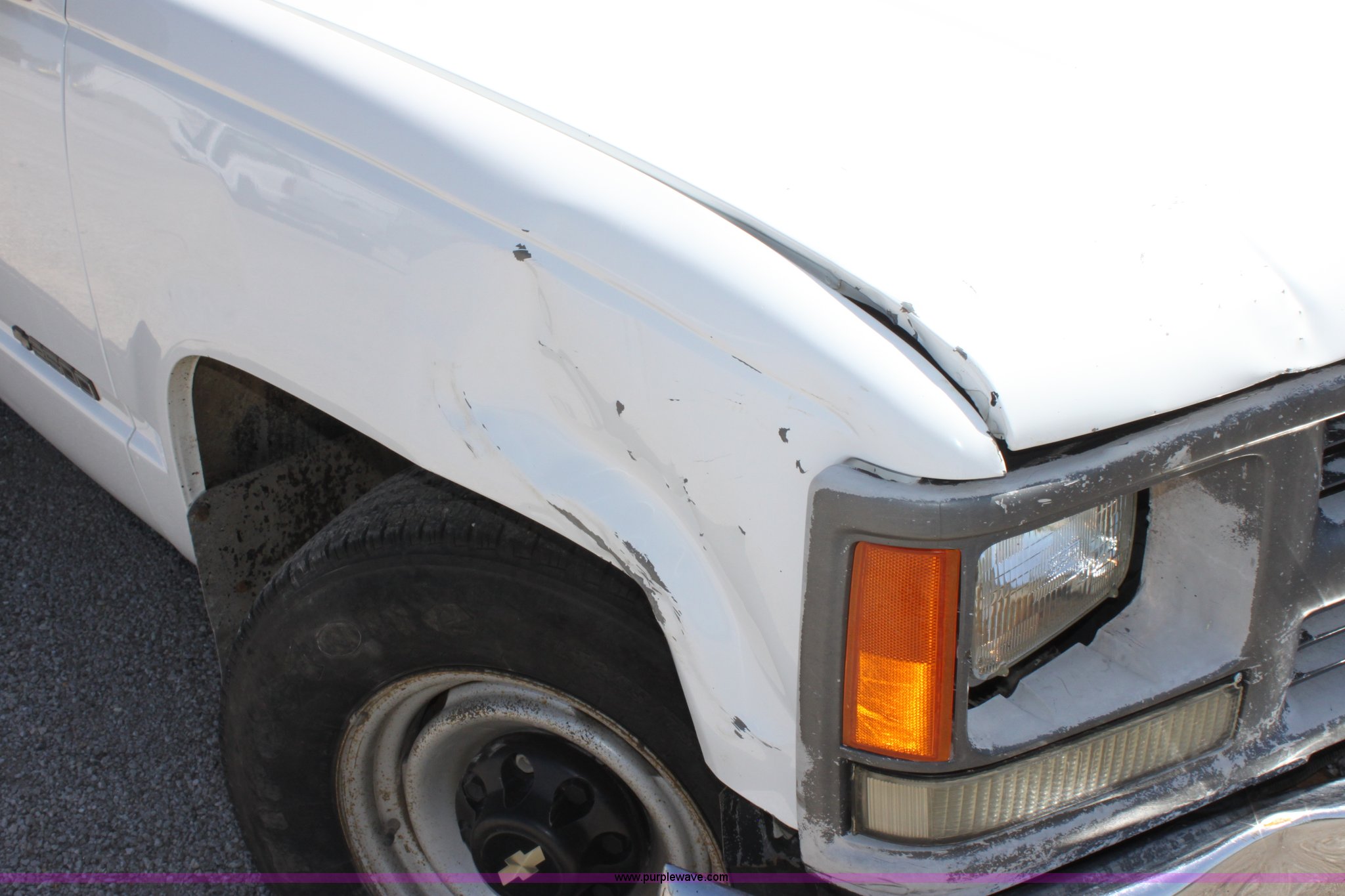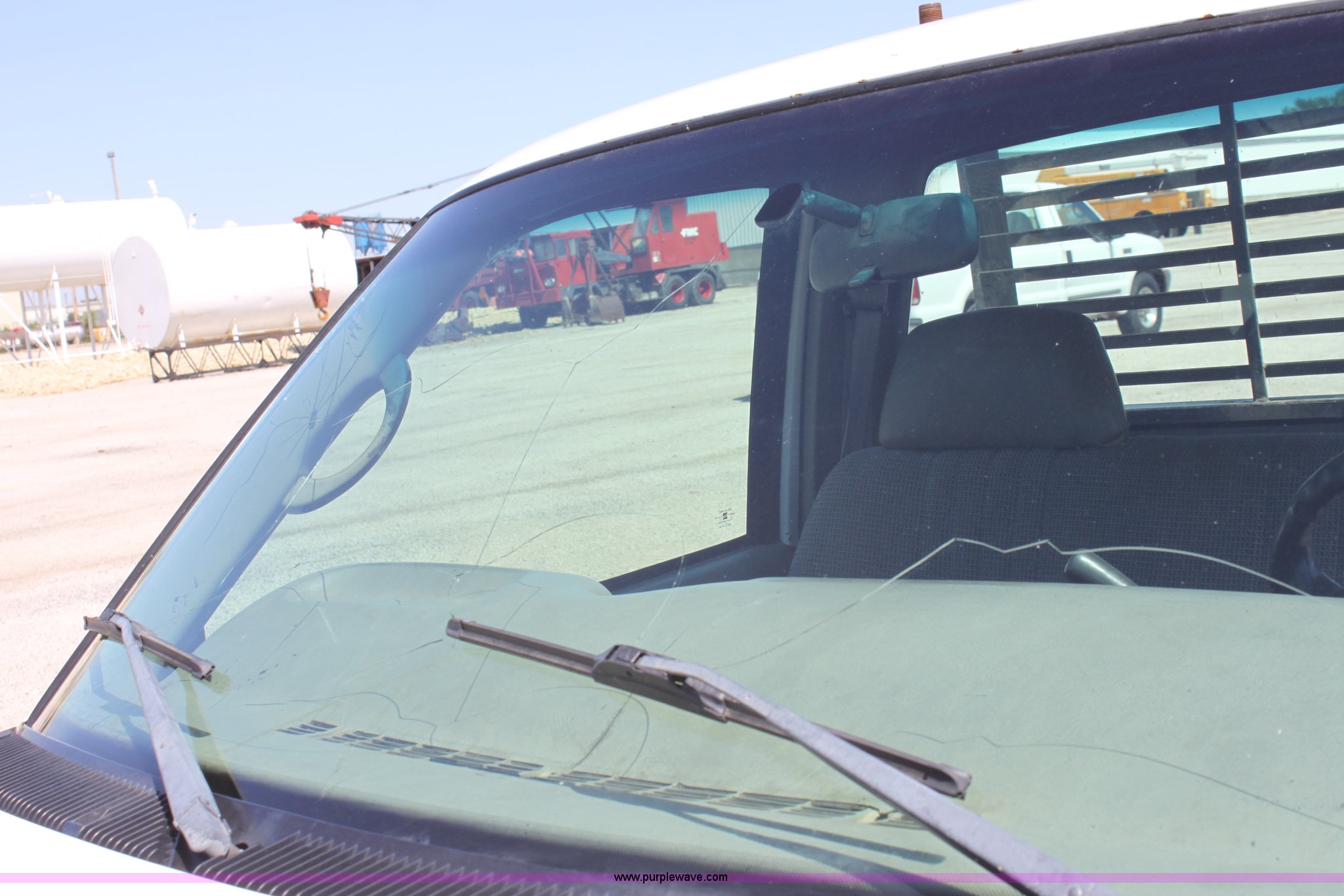 Purple Wave is selling a used Passenger Vehicle in Kansas. This item is a 1998 Chevrolet Cheyenne 2500 flatbed pickup truck with the following: 184,561 miles on odometer, 5.7L V8 OHV 16V gas engine, Automatic transmission, AC and heat, Tilt, Cruise, AM/FM/CD, Manual windows and locks, Cloth seats, Vinyl floor, Flatbed, Goosneck turnover ball, 245/75R16 tires, Interior cosmetic damage, Cracked windshield, Passenger front fender dented, Hood dented, Front bumper dented