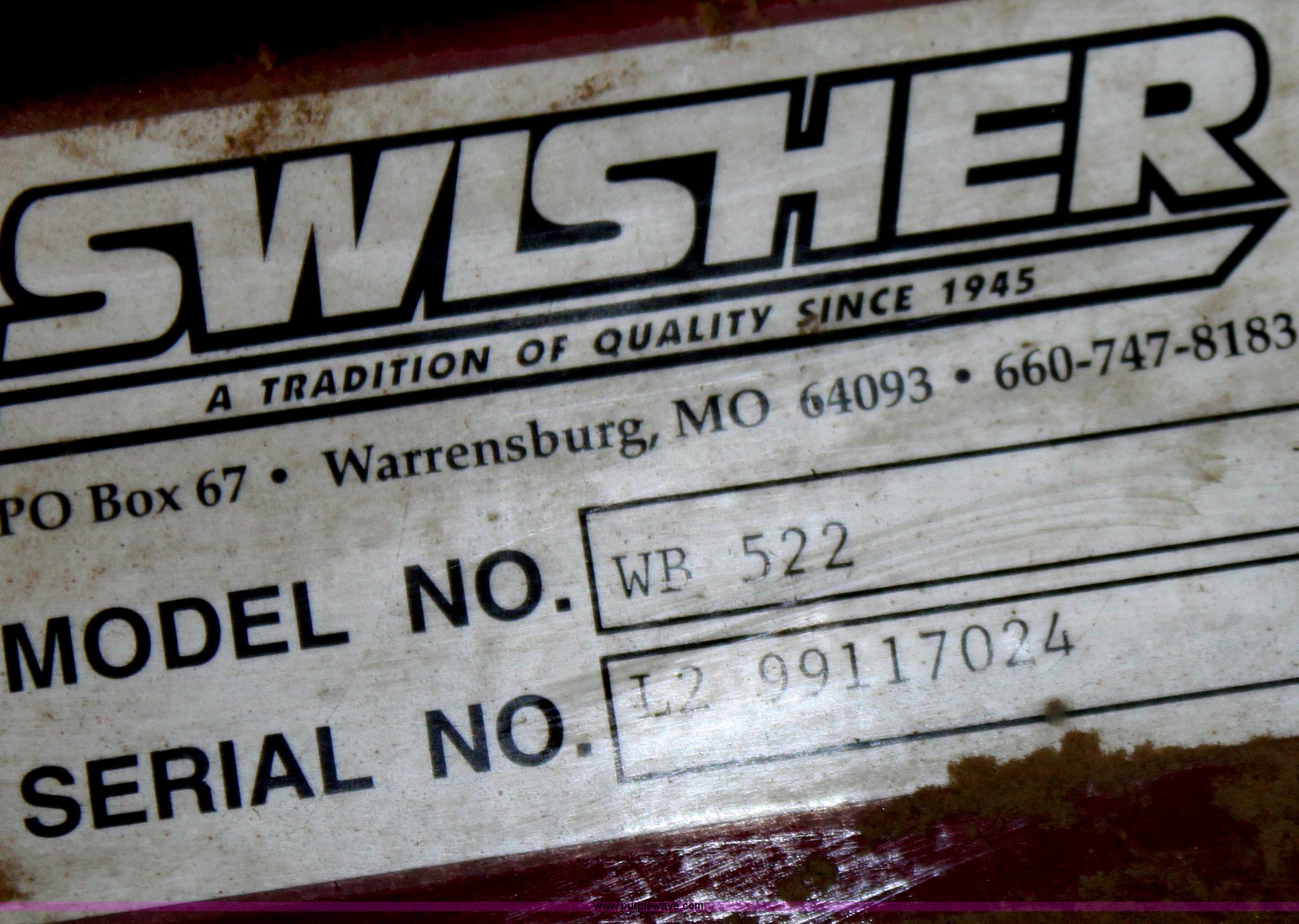 Purple Wave is selling a used Lawn and Garden in Kansas. This item is a Swisher Trim-Max WB522 trimmer with the following: Tecumseh 5.0 HP gas engine, Serial L299117024