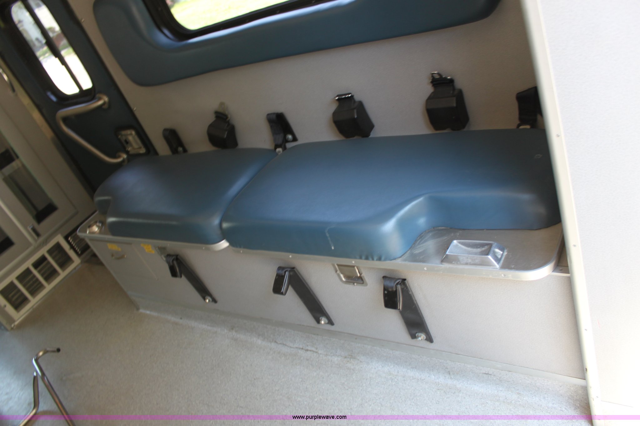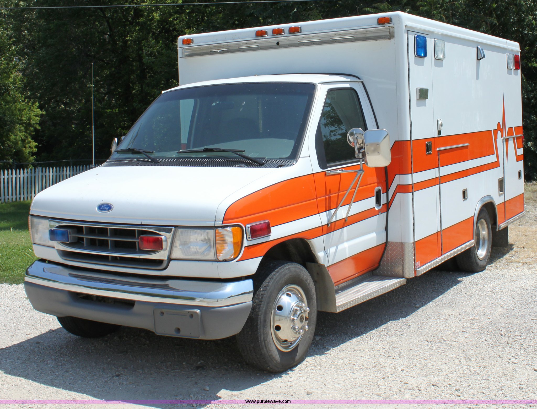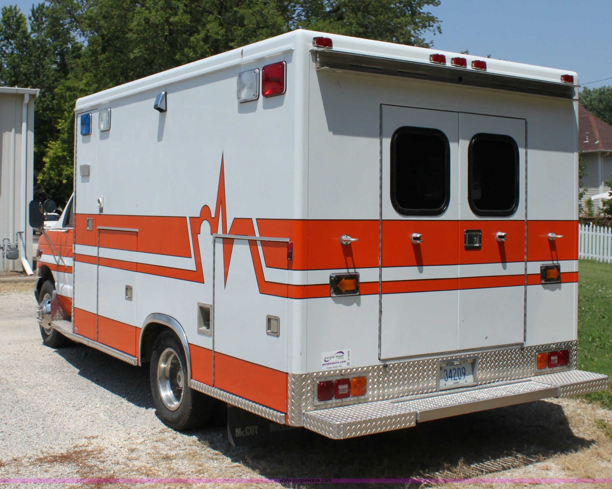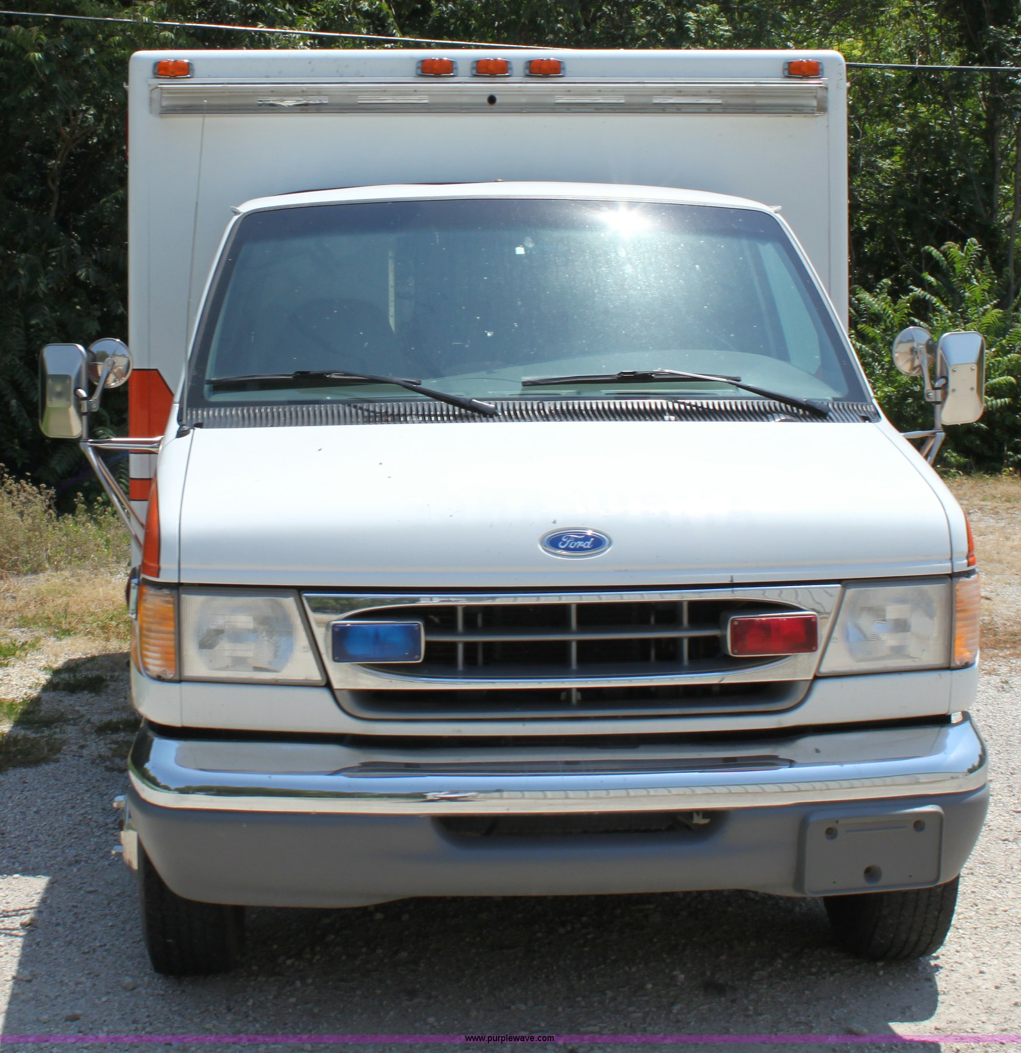 Purple Wave is selling a used Passenger Vehicle in Kansas. This item is a 1997 Ford E350 ambulance with the following: 121,293 miles on odometer, 4,333 hours on meter, 7.3L V8 turbo diesel engine, Automatic transmission, AC and heat, Tilt, Cruise, AM/FM, Power windows and locks, Cloth interior, Rear AC and heat controls, McCoy Miller light and siren controls, Back-up alarm, 110/125V exterior outlet, (3) oxygen connections, (2) rear 115V outlets, Rear interior lighting, 225/75R16 tires