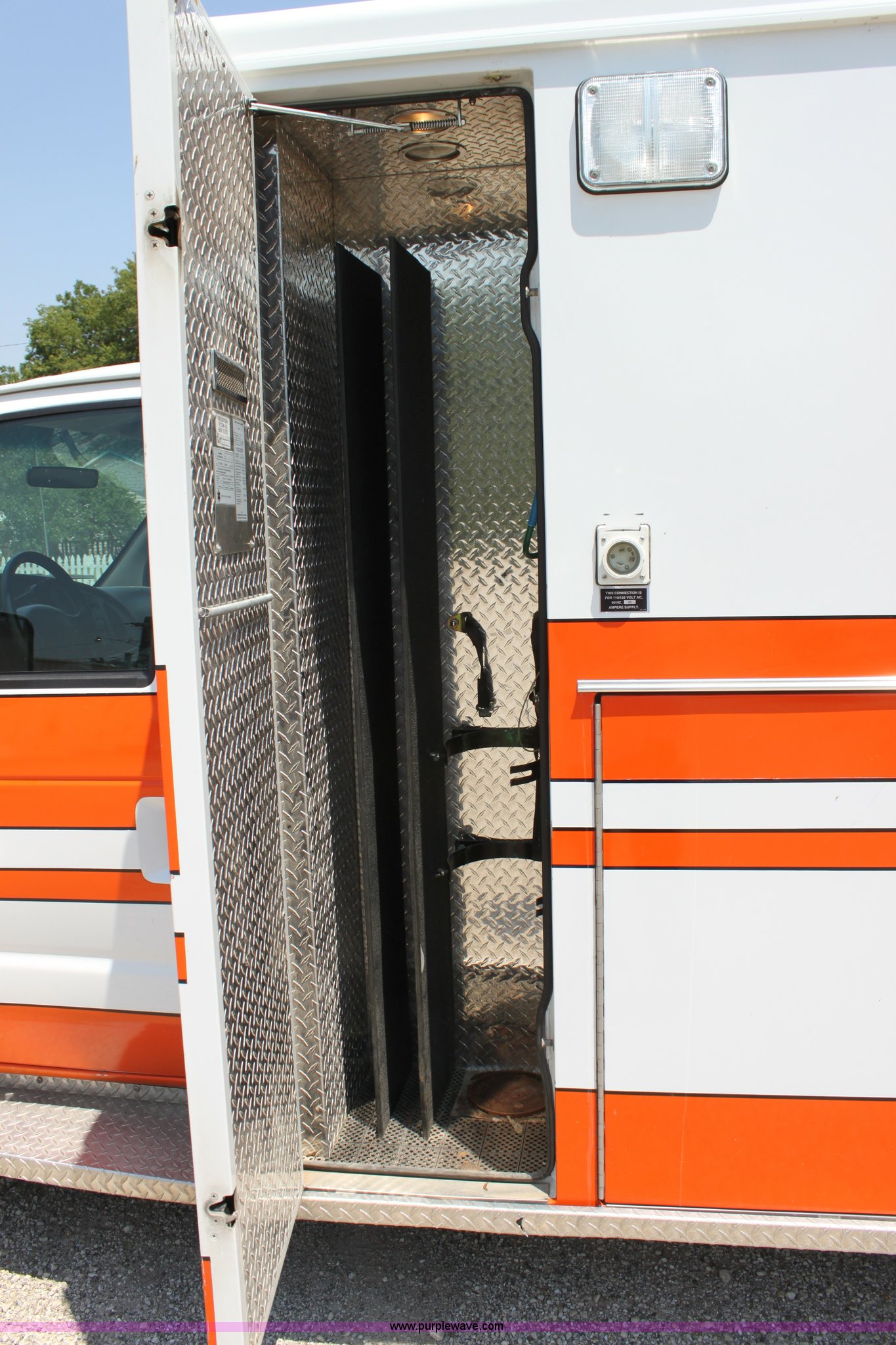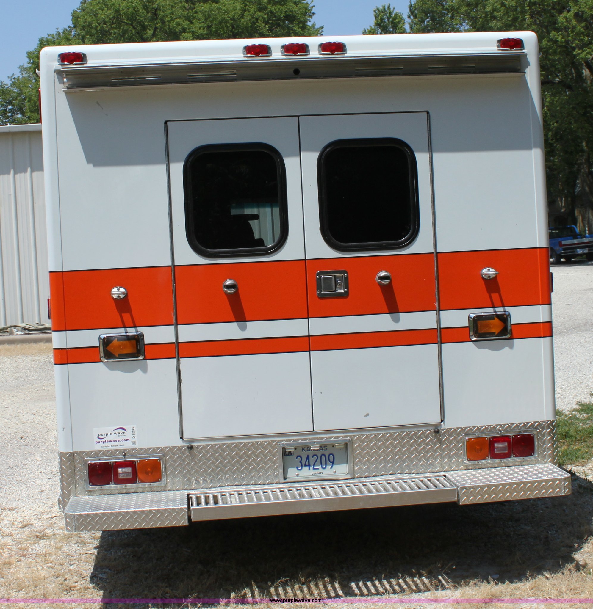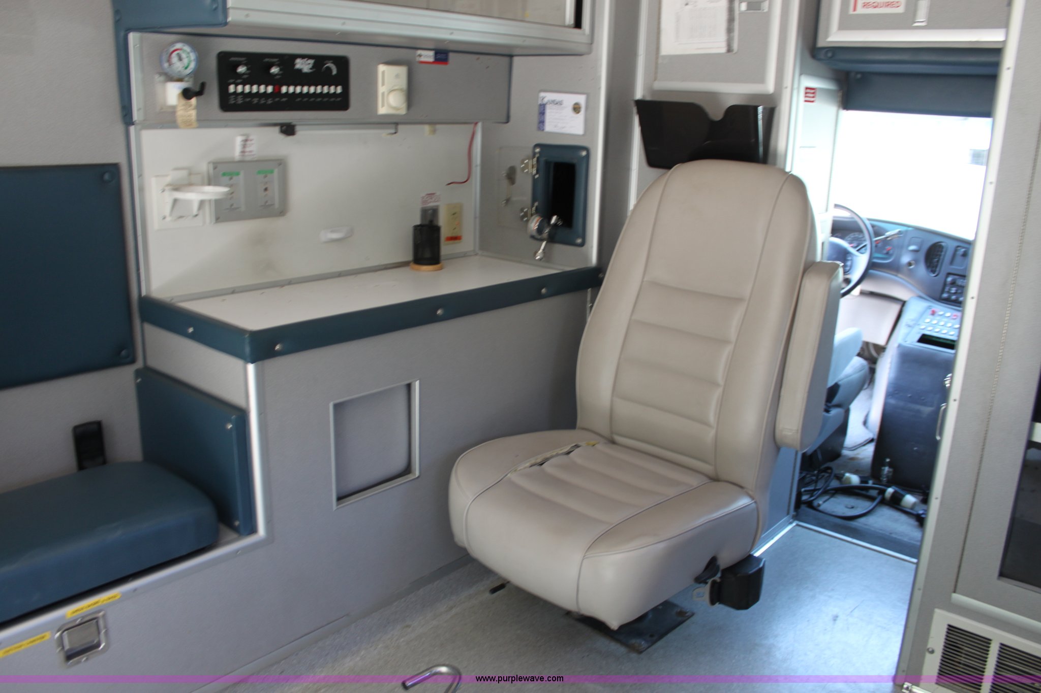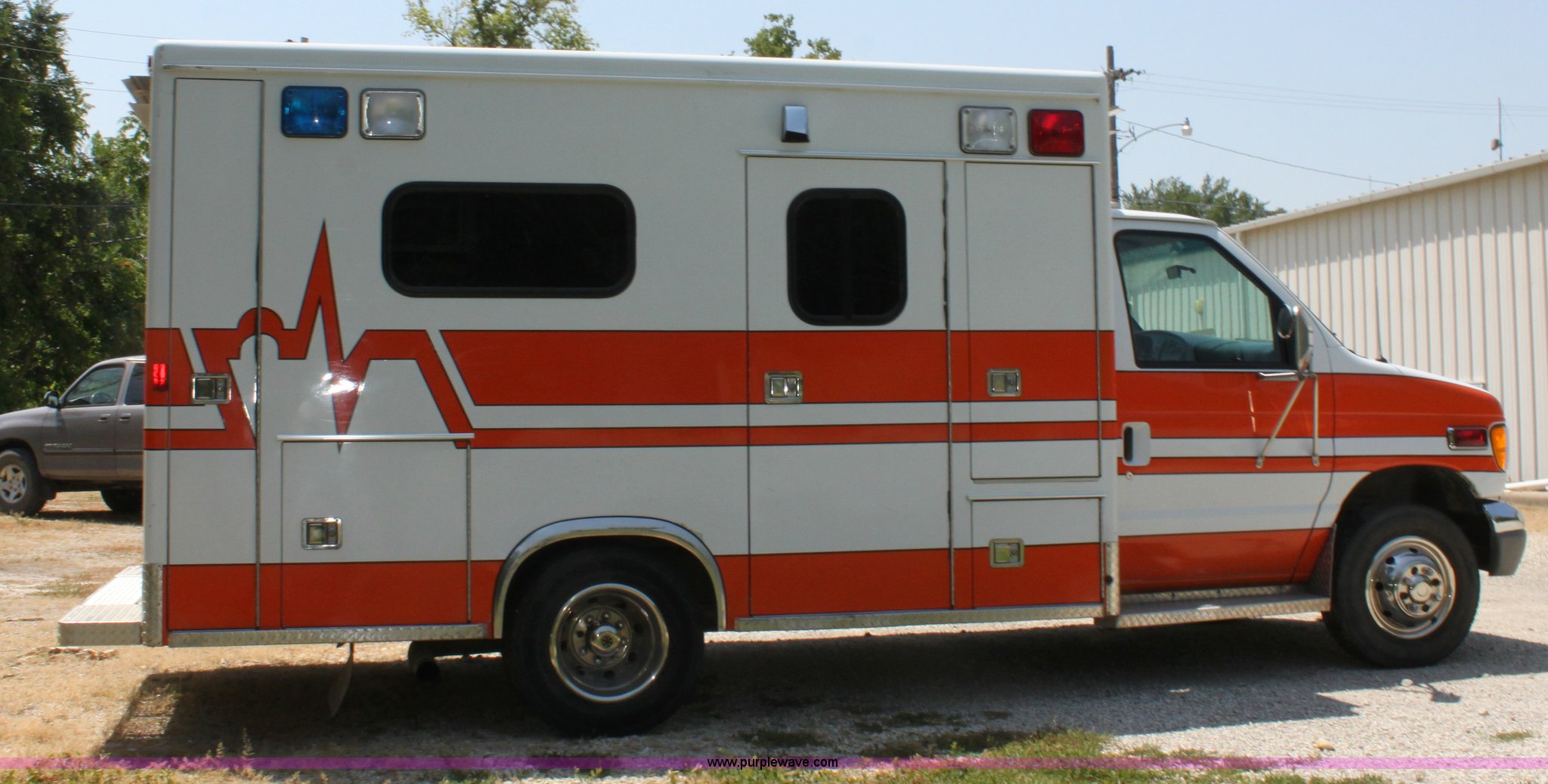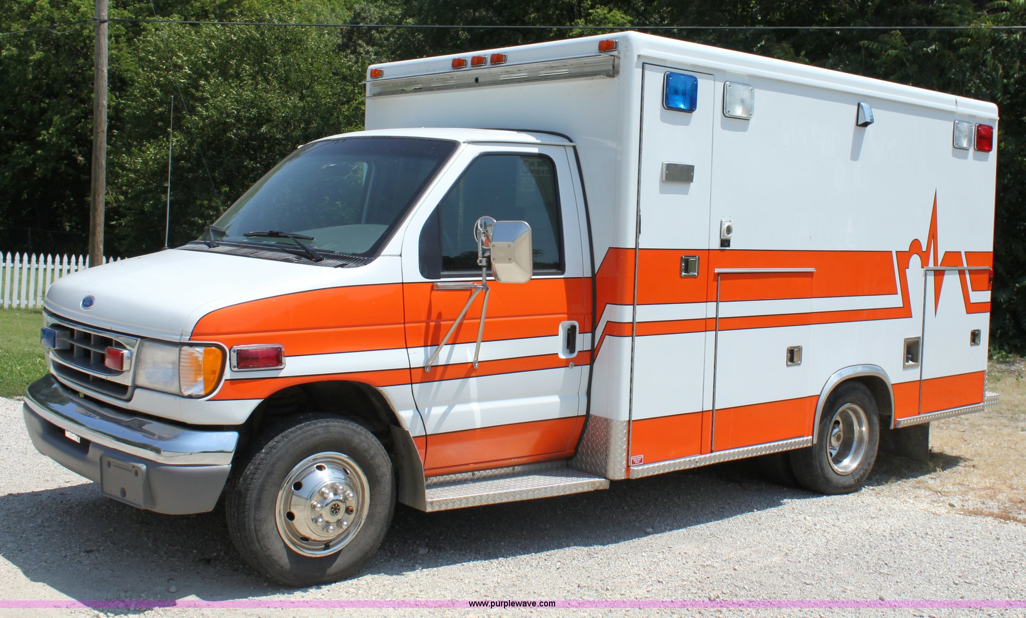 Purple Wave is selling a used Passenger Vehicle in Kansas. This item is a 1997 Ford E350 ambulance with the following: 121,293 miles on odometer, 4,333 hours on meter, 7.3L V8 turbo diesel engine, Automatic transmission, AC and heat, Tilt, Cruise, AM/FM, Power windows and locks, Cloth interior, Rear AC and heat controls, McCoy Miller light and siren controls, Back-up alarm, 110/125V exterior outlet, (3) oxygen connections, (2) rear 115V outlets, Rear interior lighting, 225/75R16 tires