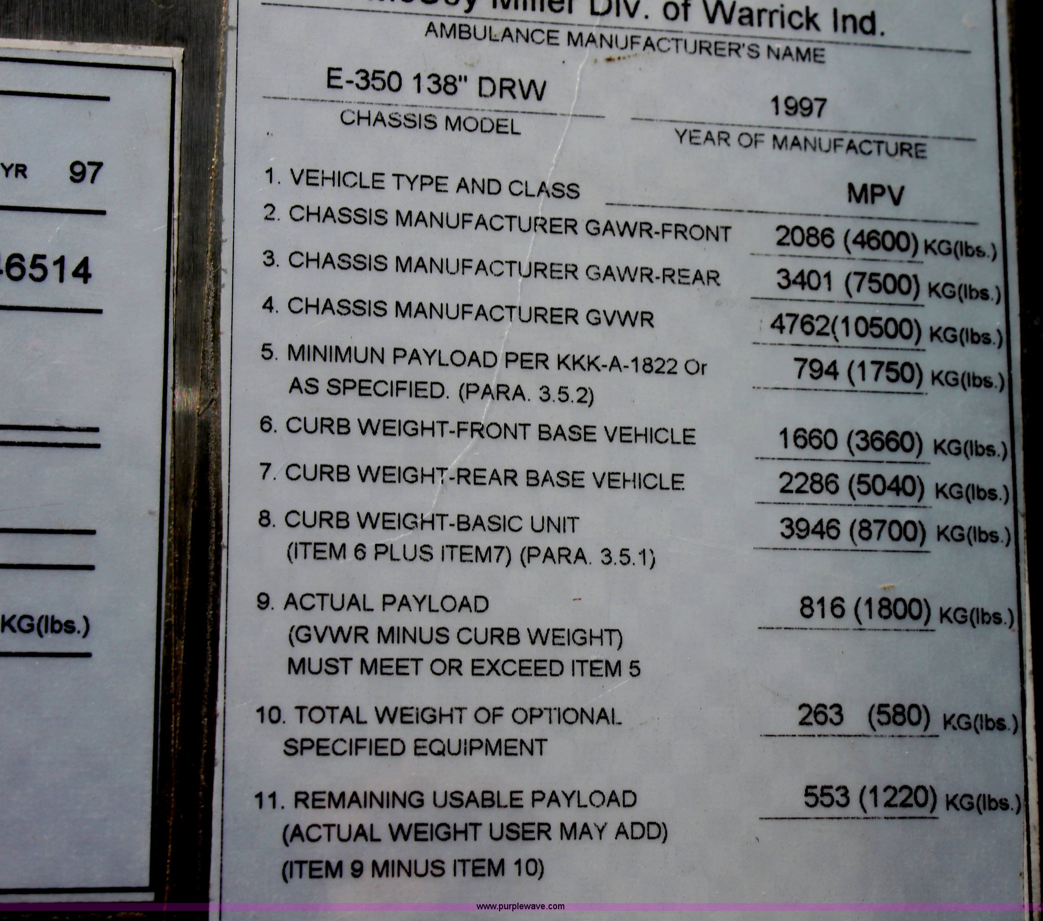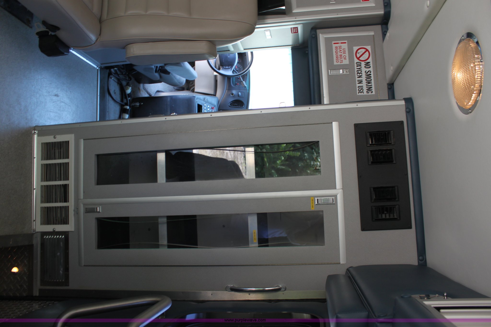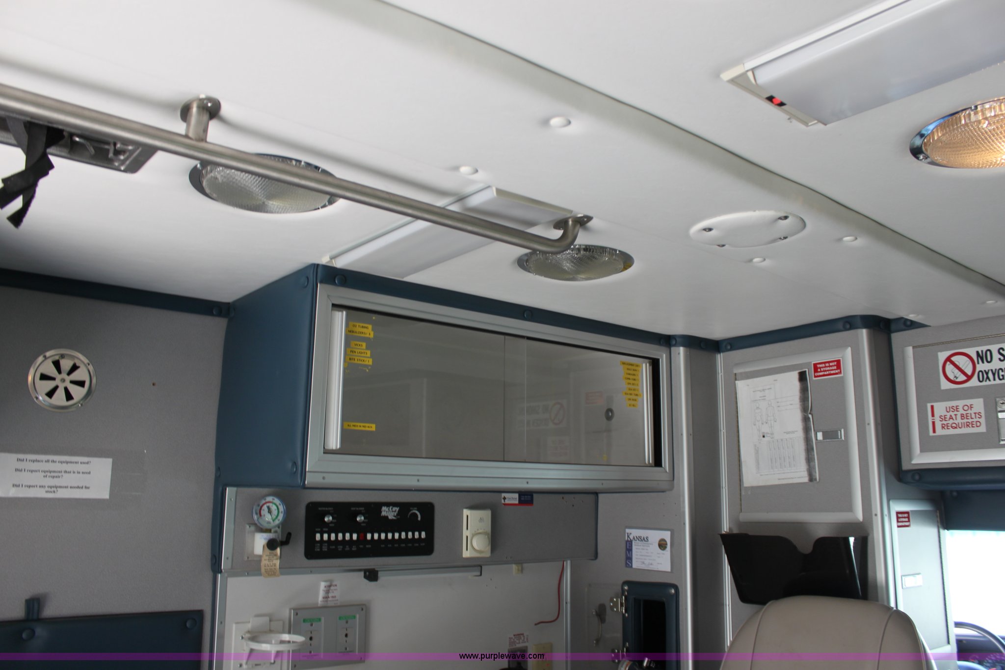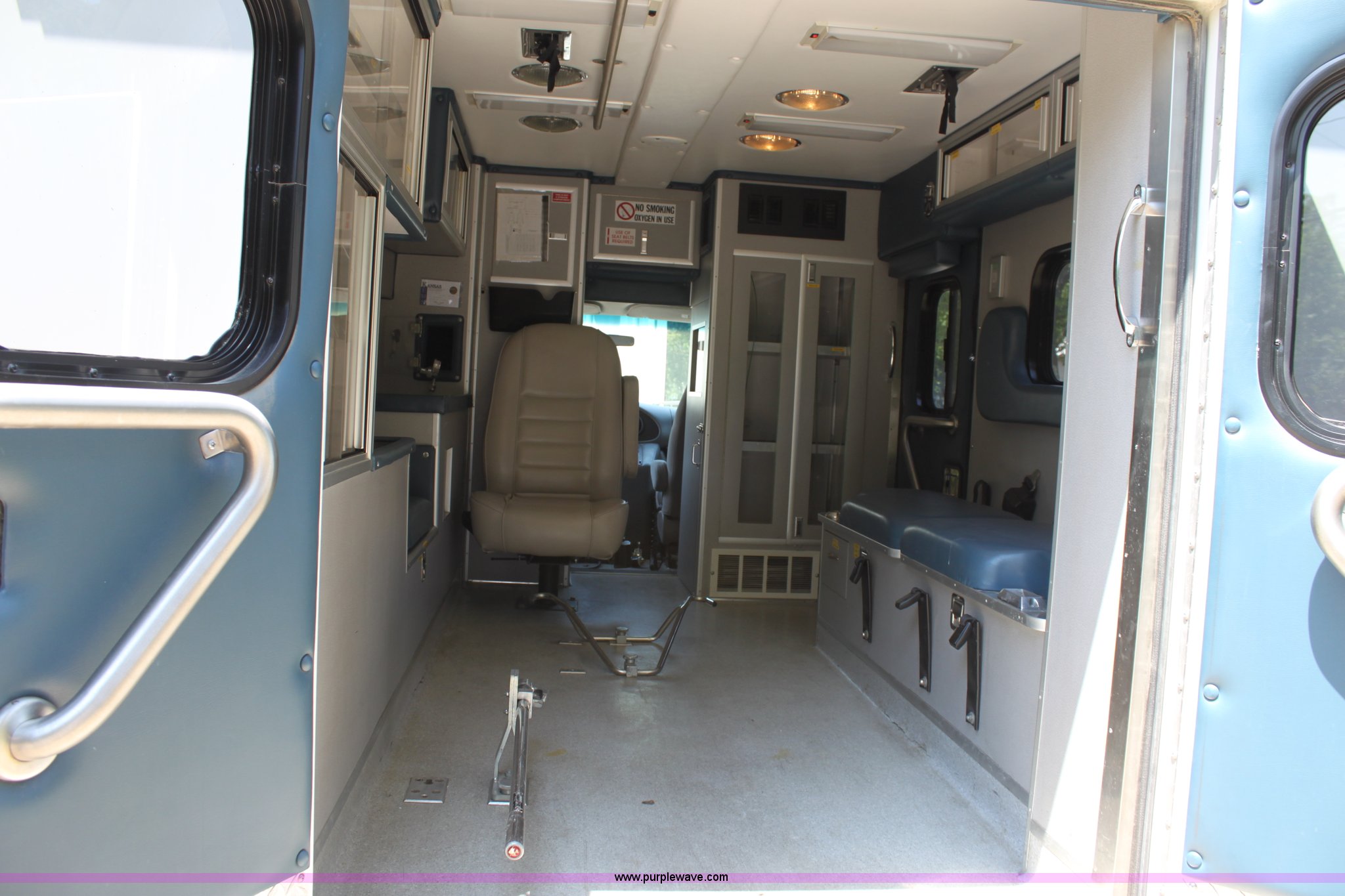Purple Wave is selling a used Passenger Vehicle in Kansas. This item is a 1997 Ford E350 ambulance with the following: 121,293 miles on odometer, 4,333 hours on meter, 7.3L V8 turbo diesel engine, Automatic transmission, AC and heat, Tilt, Cruise, AM/FM, Power windows and locks, Cloth interior, Rear AC and heat controls, McCoy Miller light and siren controls, Back-up alarm, 110/125V exterior outlet, (3) oxygen connections, (2) rear 115V outlets, Rear interior lighting, 225/75R16 tires