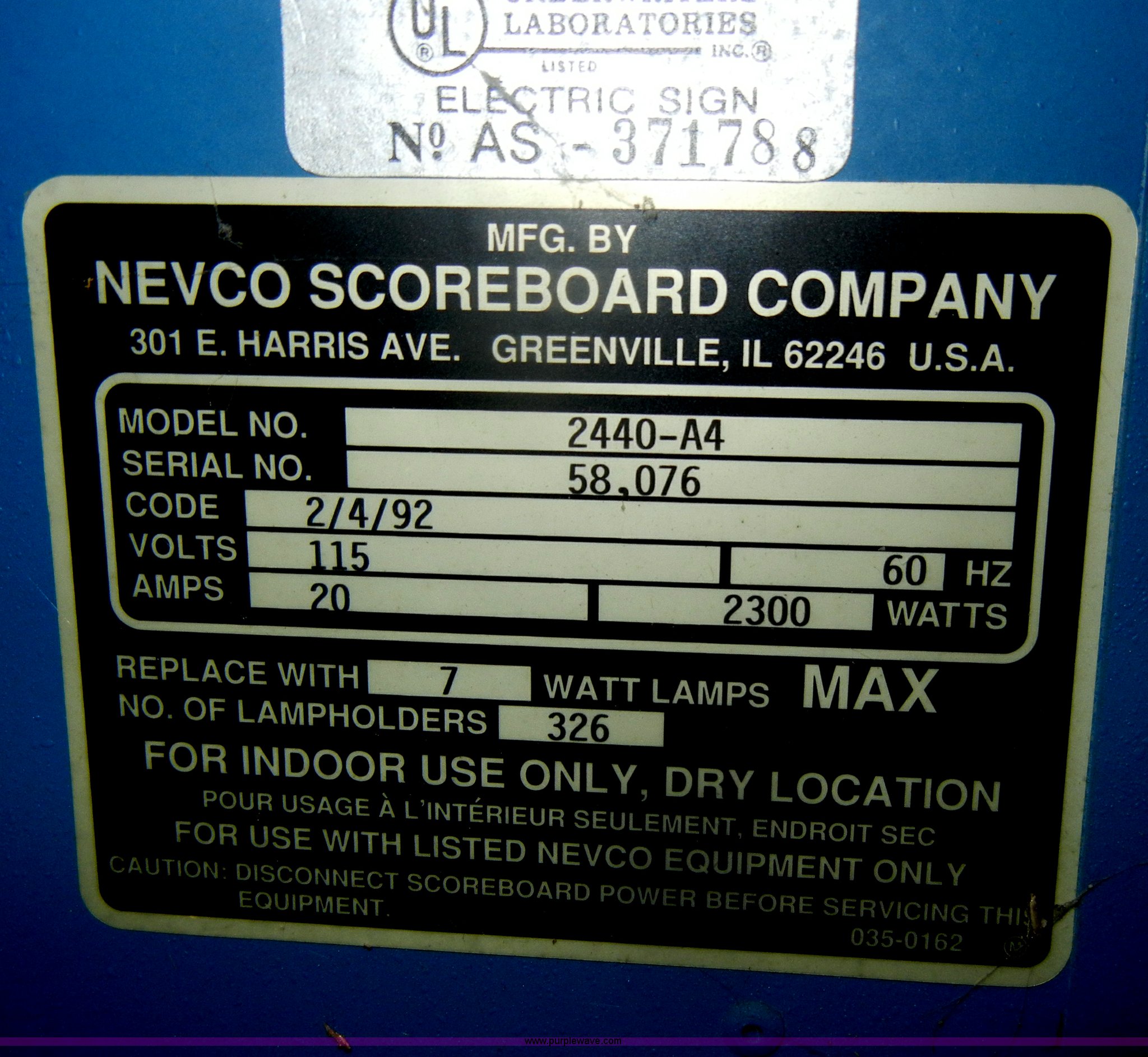 Purple Wave is selling a used Sporting Goods in Kansas. This item is a Nevco scoreboard with the following: 12' x 5' x 8", Cosmetic damage, Model 2440-A4, Serial 58.076