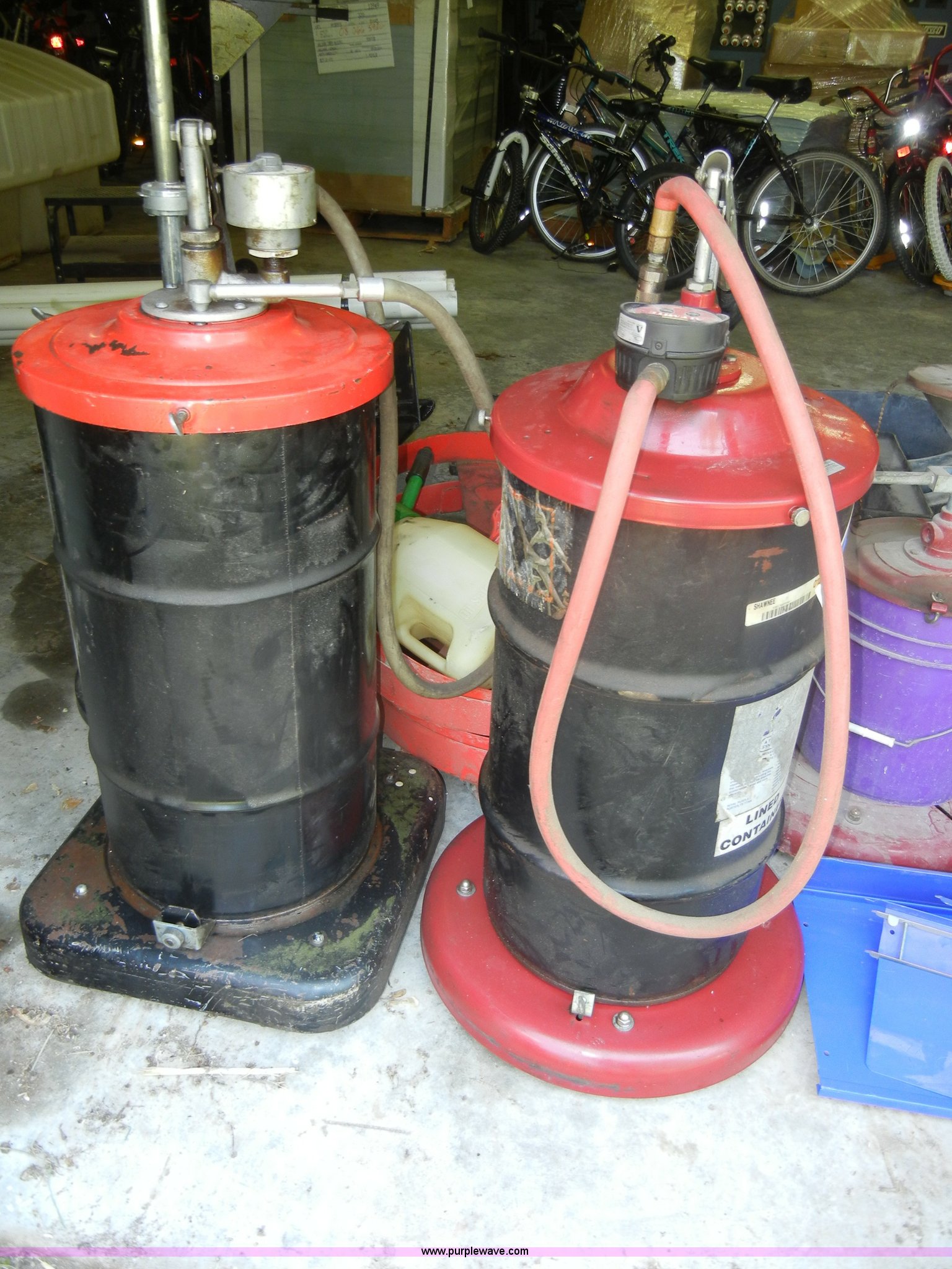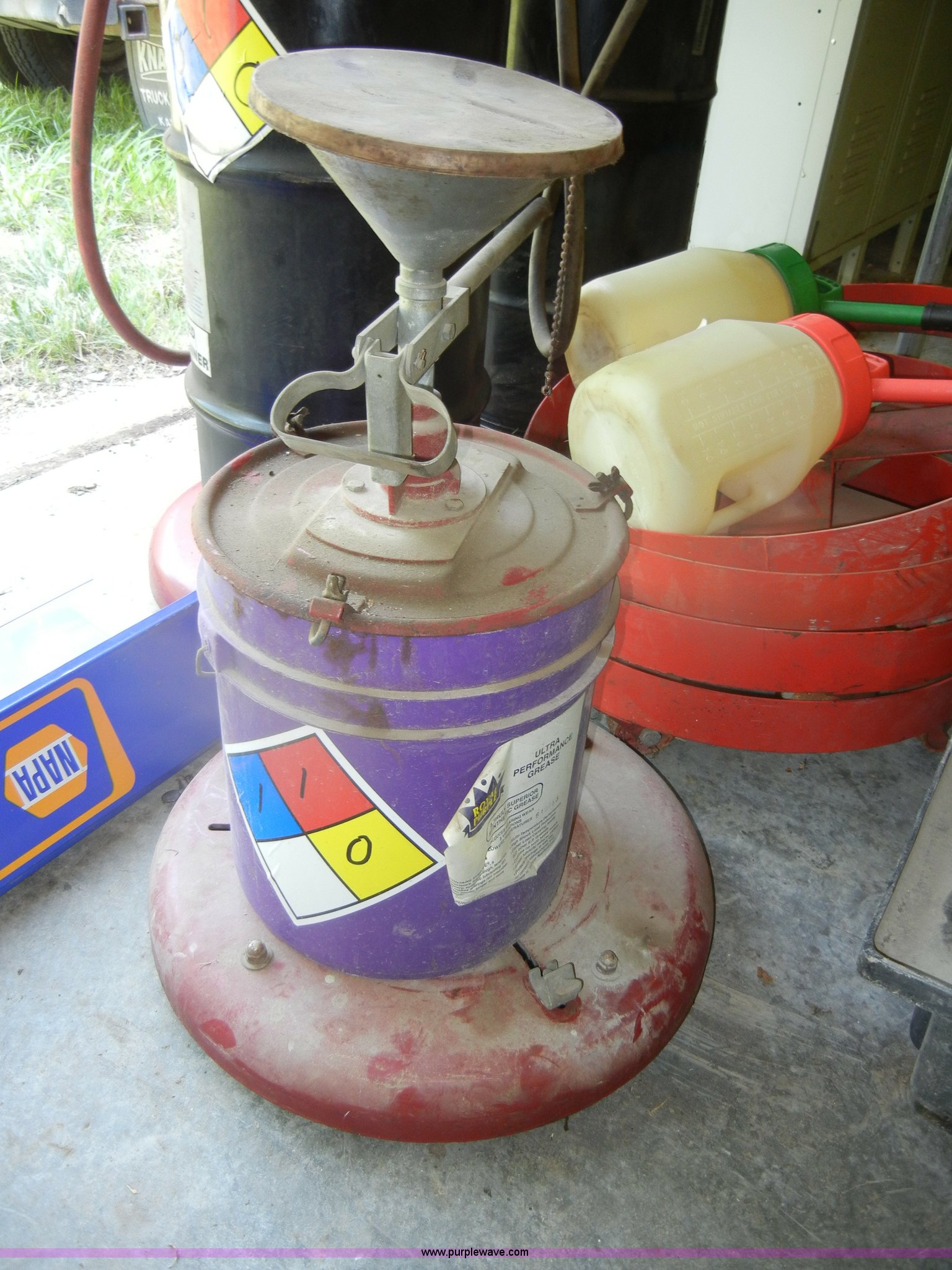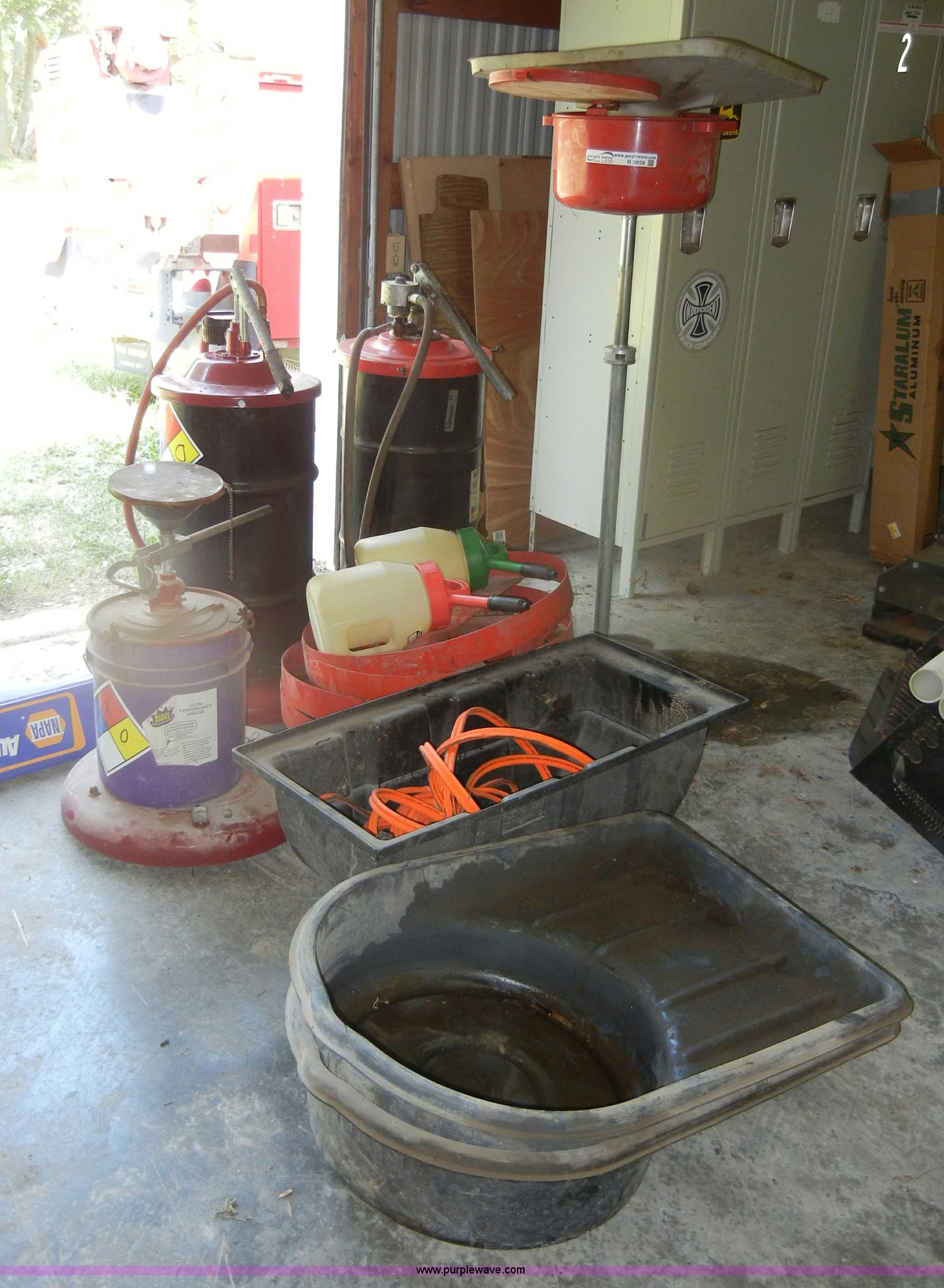 Purple Wave is selling a used Automotive Parts or Acces. in Kansas. This item is a Assorted automotive supplies with the following: Book display shelf, (4) 55 gallon drum casters, Grease pump, Transmission and grease barrels with pumps, Empty, Jumper cables, Plus more