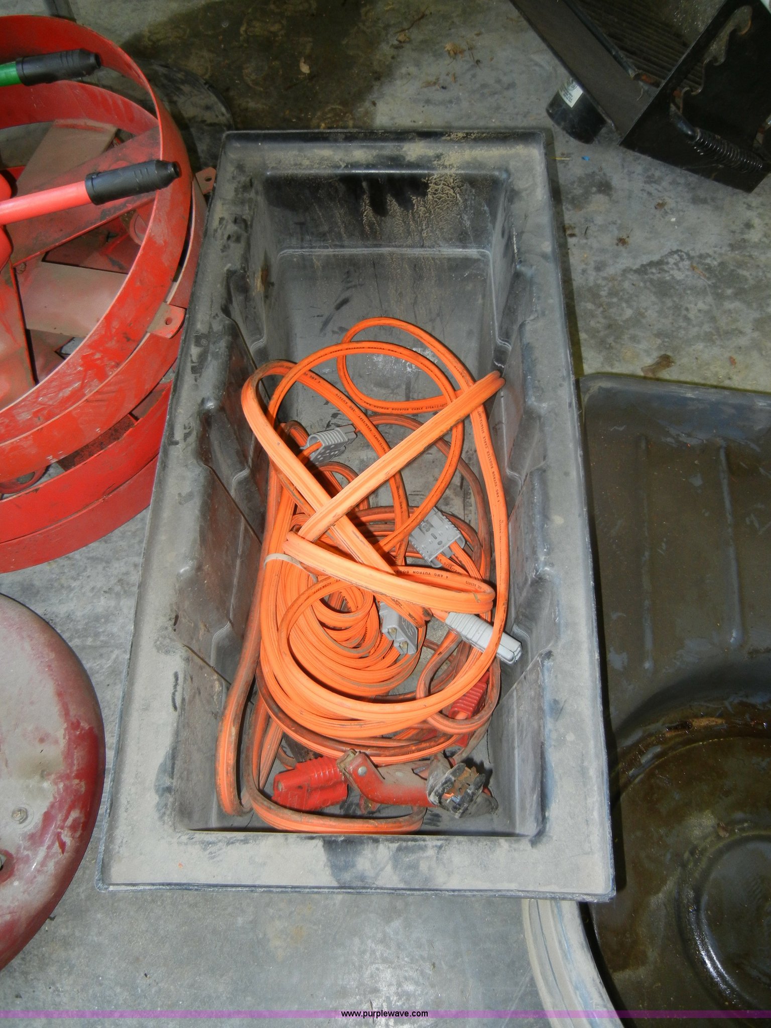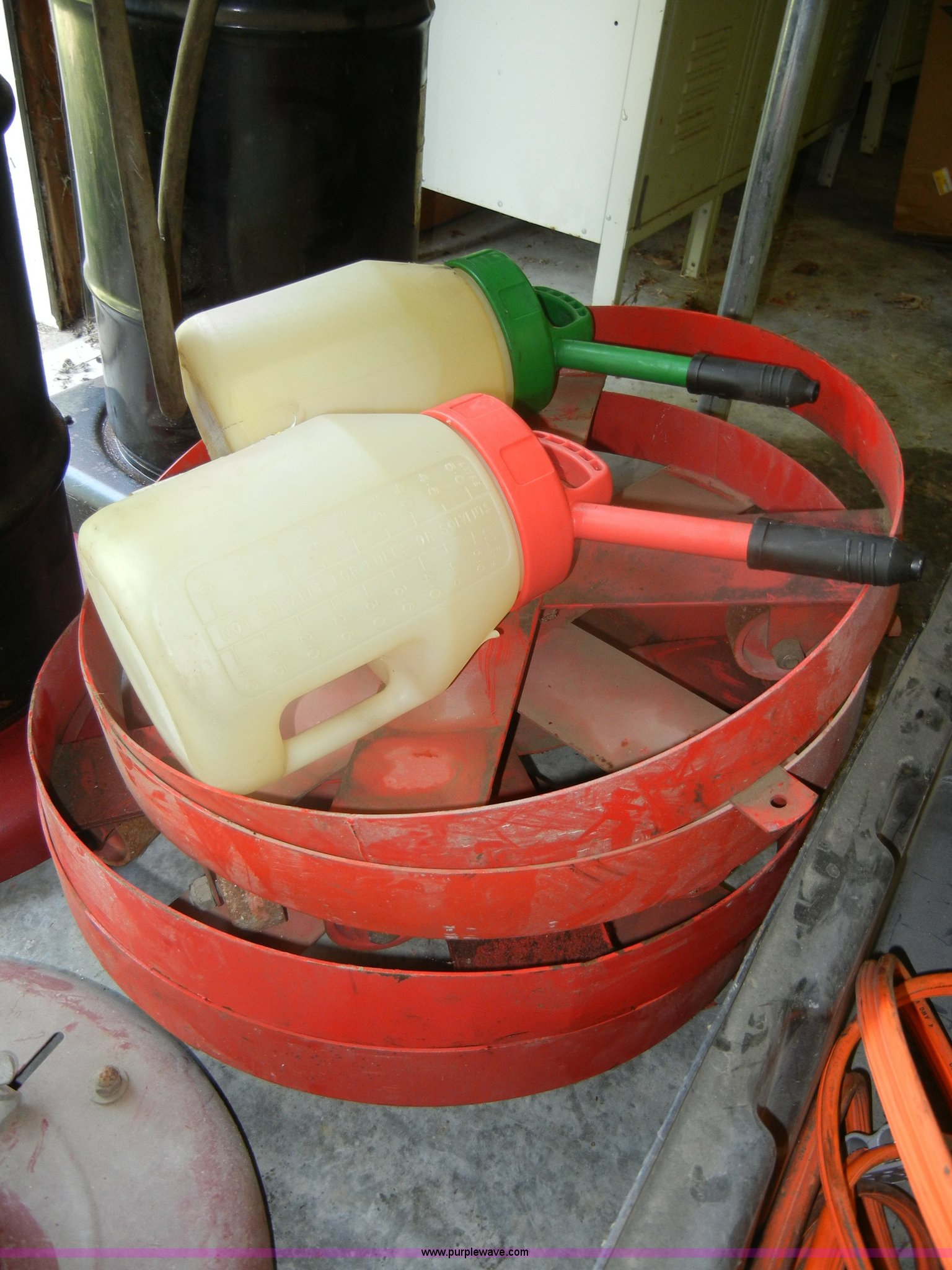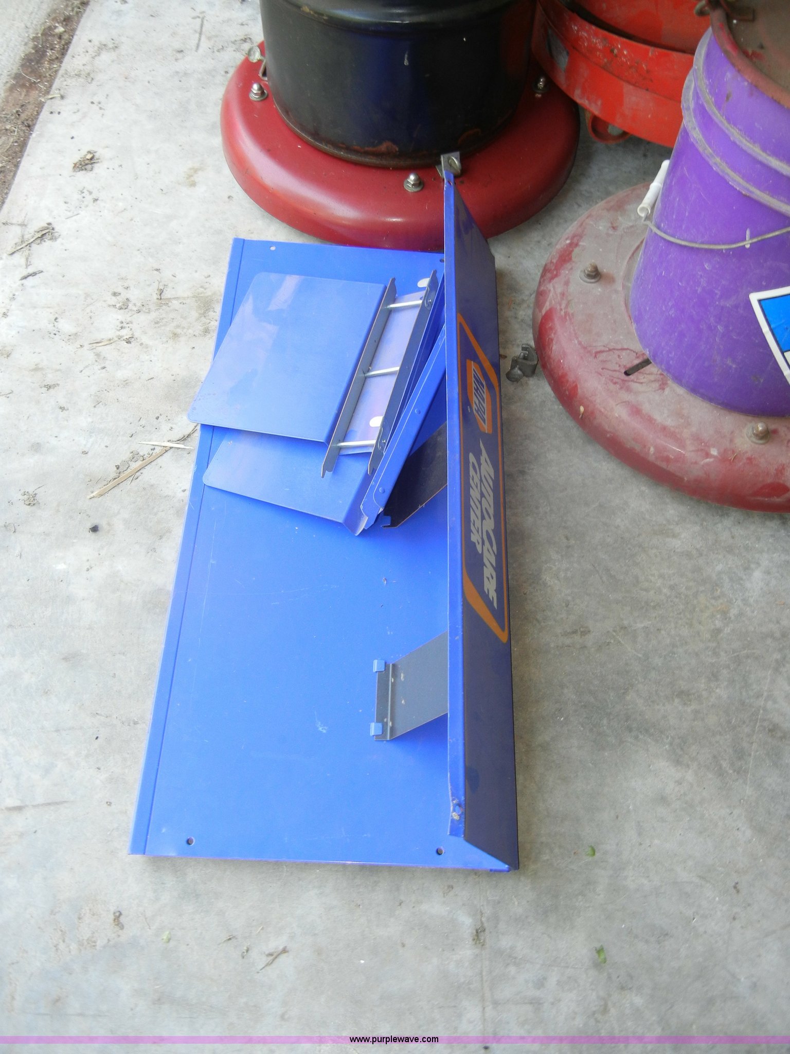 Purple Wave is selling a used Automotive Parts or Acces. in Kansas. This item is a Assorted automotive supplies with the following: Book display shelf, (4) 55 gallon drum casters, Grease pump, Transmission and grease barrels with pumps, Empty, Jumper cables, Plus more
