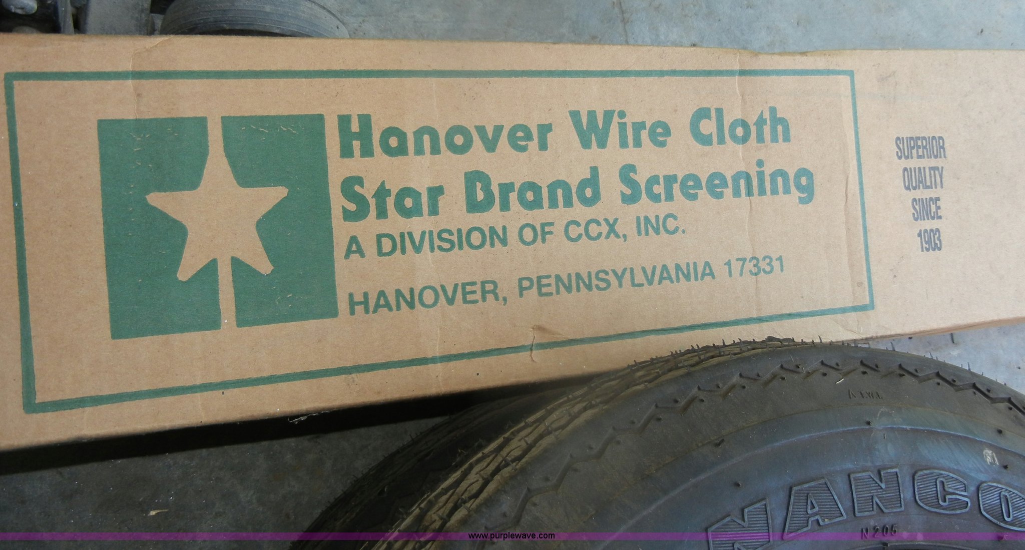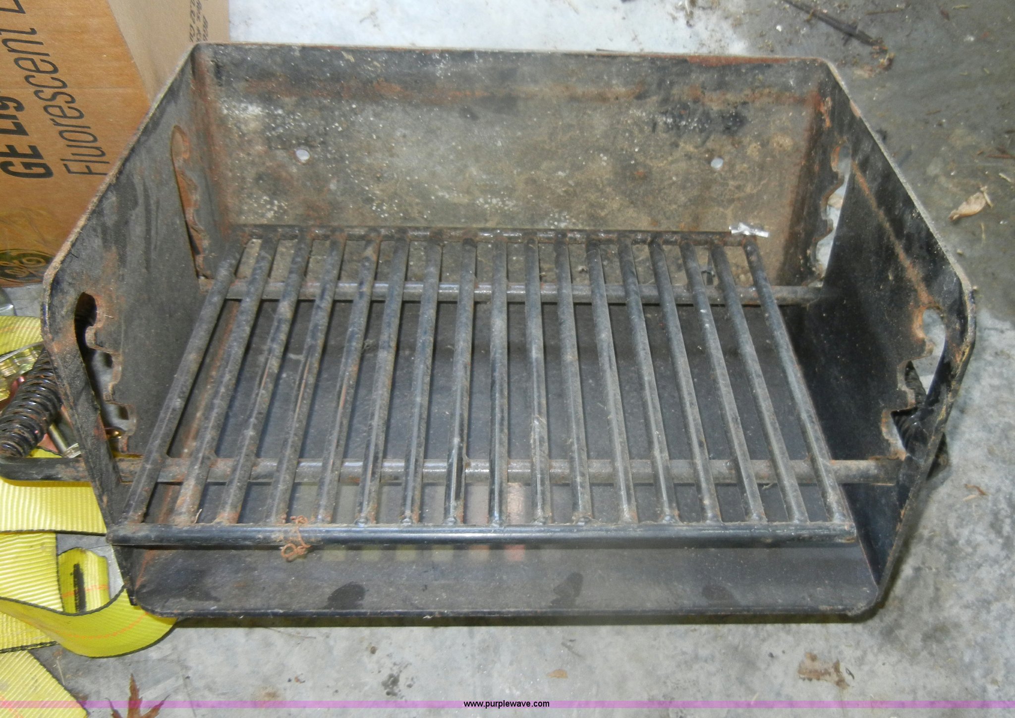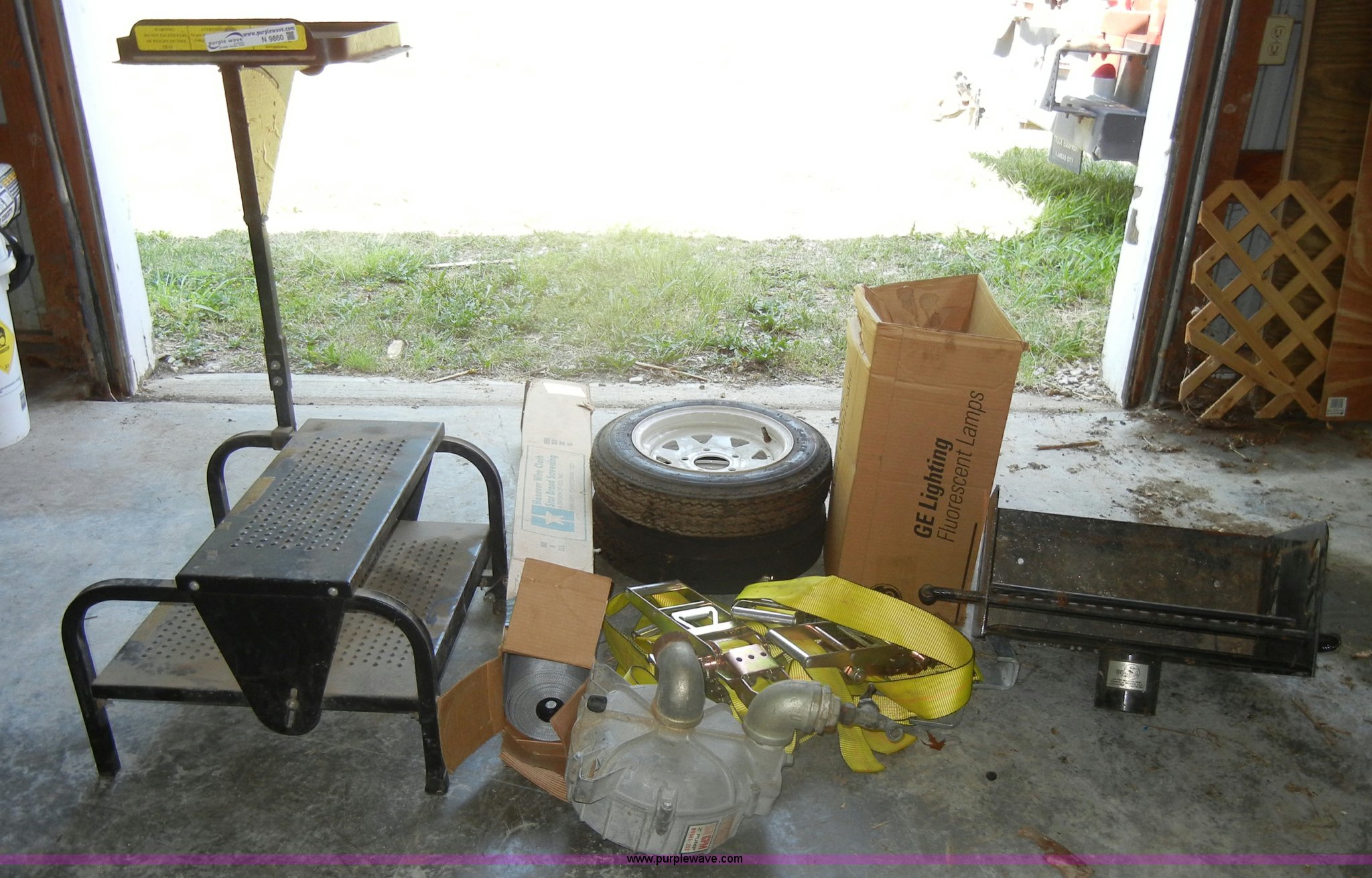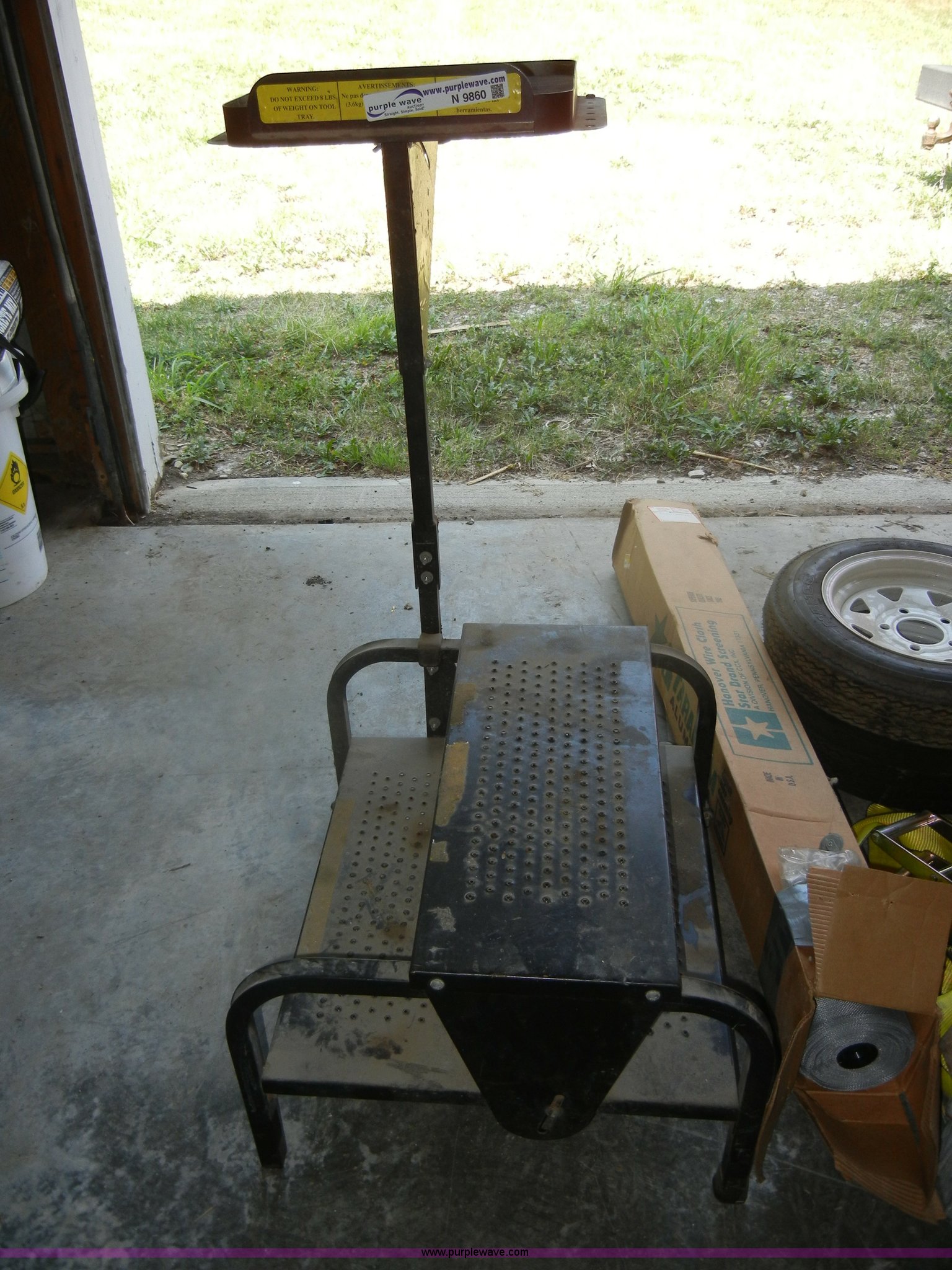 Purple Wave is selling a used Tools in Kansas. This item is a Assorted equipment with the following: Iron Mountain Forge grill top, Straps, 2" pump, Screen wire, Box of nails, Rolling work/tool cart, (2) 4.80-12 tires with rims