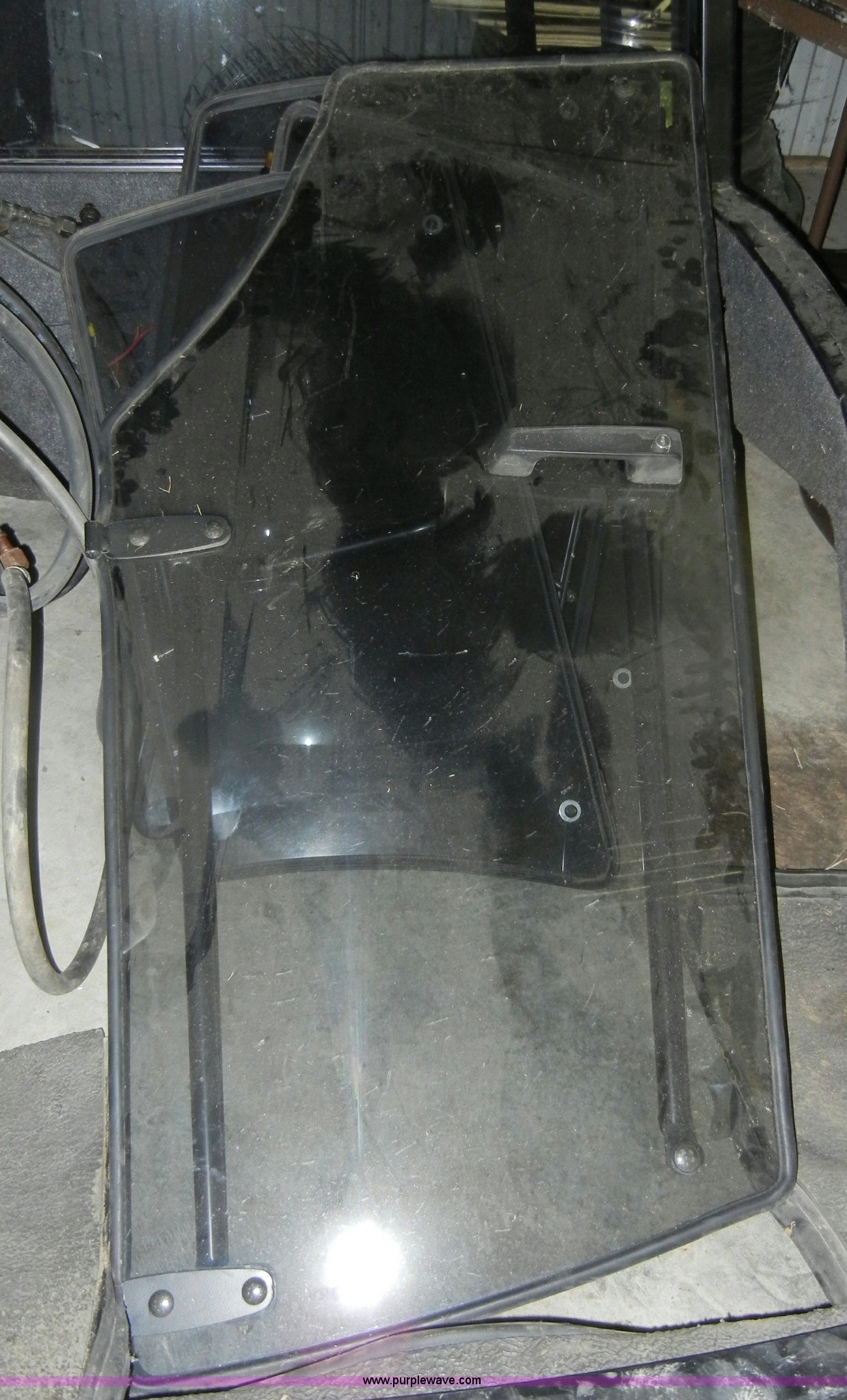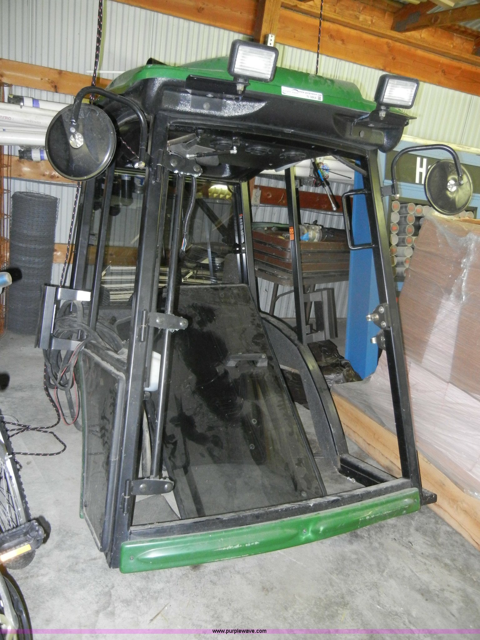 Purple Wave is selling a used Lawn and Garden in Kansas. This item is a John Deere WAM turbo enclosure with the following: Wide Area Mower enclosure, AC and heat system, AM/FM radio, Exterior mirrors, Front glass broken, All other glass included