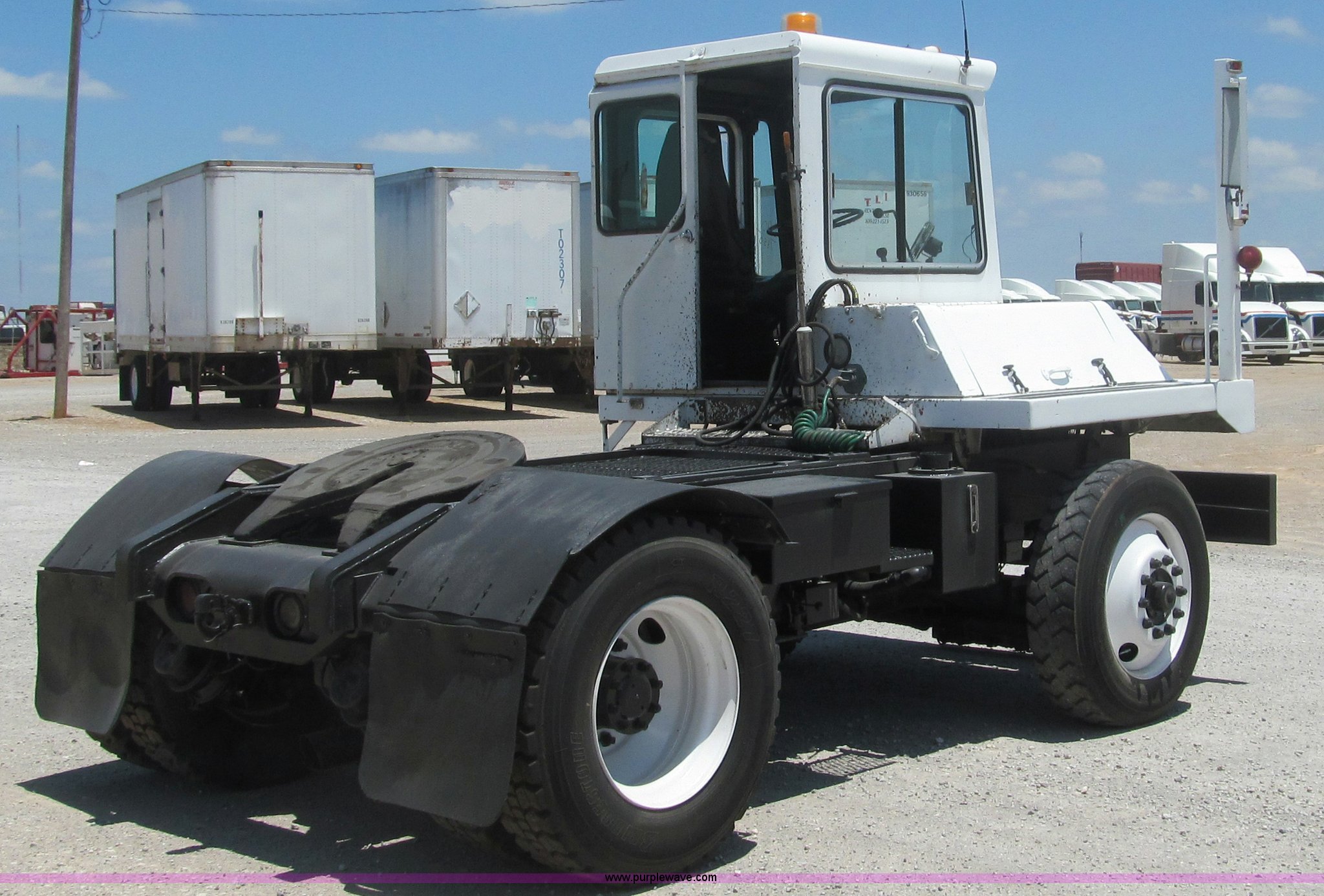 Purple Wave is selling a used Yard Truck in Oklahoma. This item is a 1990 Capacity TJ4000 yard truck with the following: 2,446 miles on odometer, Six cylinder diesel engine, 160 HP, Automatic transmission, Wet kit, Hydraulic full range fifth wheel hitch, Quick disconnect fifth wheel, Steel deck plate, Bridgestone 28575R24.5 tires, GVWR 39,000 lbs