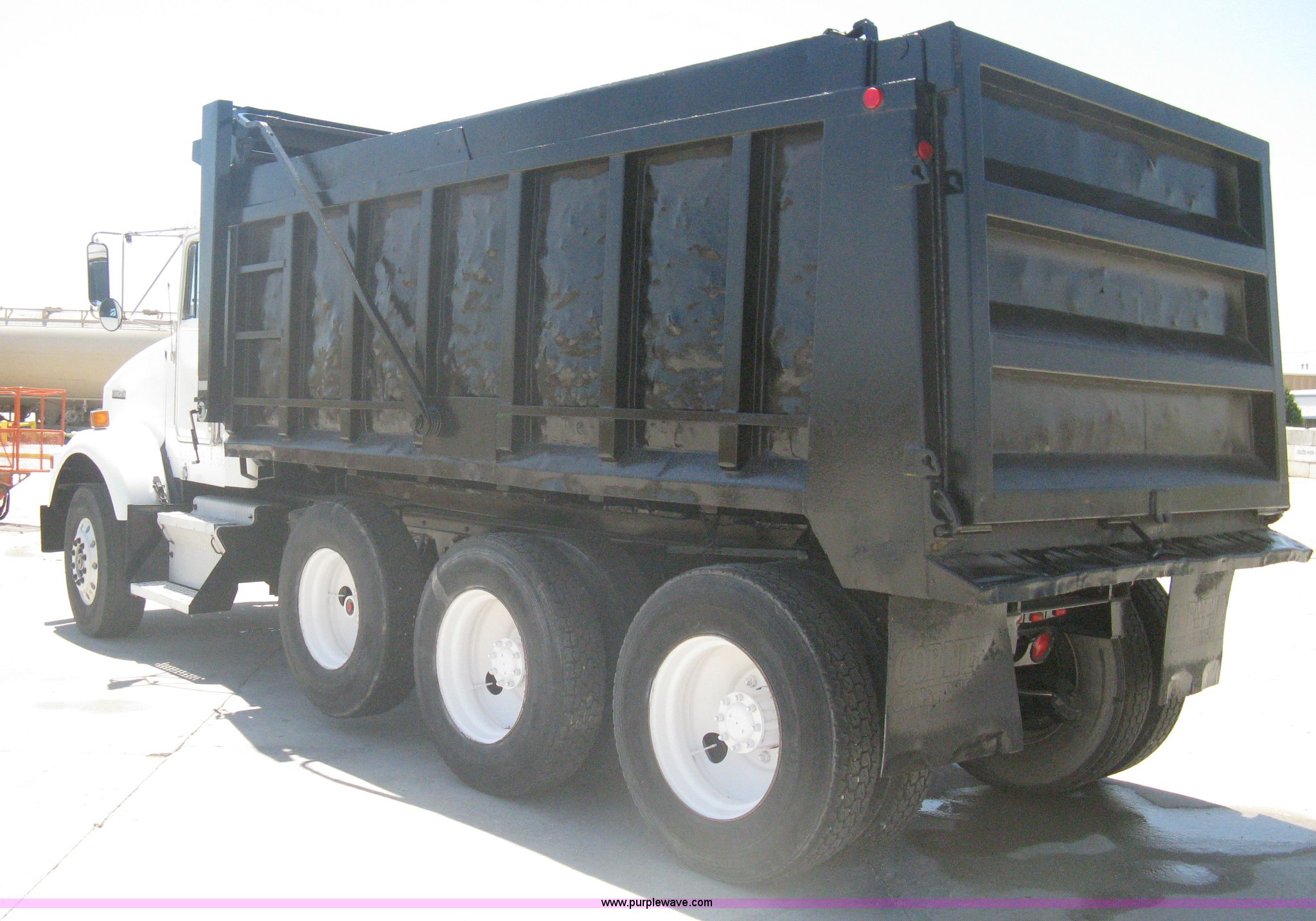 Purple Wave is selling a used Construction Dump Truck in Kansas. This item is a 1994 Kenworth T800B dump truck with the following: 500,673 miles on odometer, Caterpillar 3306 diesel engine, Eaton Fuller eight speed manual transmission, Twin screw, AC and heat, AM/FM/Cassette, Air suspension seat, Air horn, Exterior visor, Block heater, 16'L x 8'W dump bed, 52" side wall with top board, Air end gate, Roll over tarp, 100 gallon fuel tank, Spring suspension, PTO, Air brakes, Dual tandem axles, Third pusher axle, 3.70 gear ratio, 315/80R22.5 front tires, 11R24.5 rear tires, 315/80R22.5 pusher tires, GVWR 52,860 lbs, Minor pits in windshield