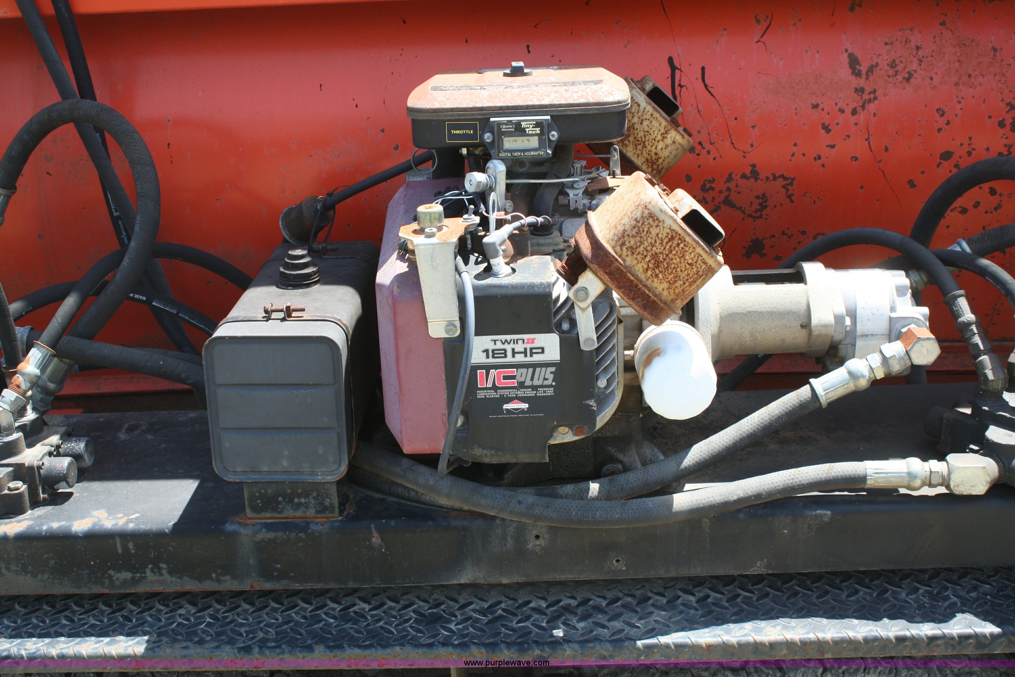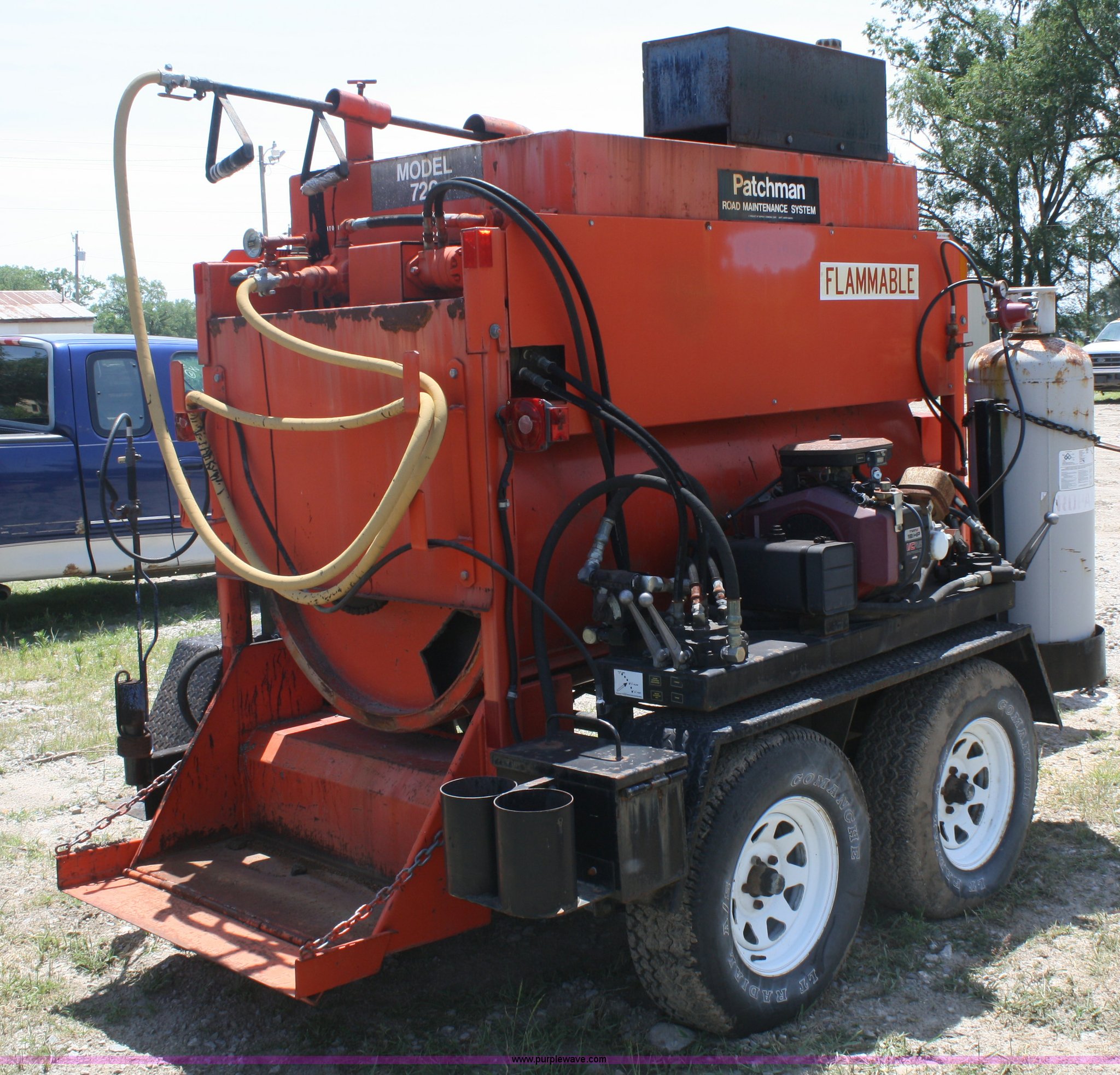 Purple Wave is selling a used Pot Hole Patcher in Kansas. This item is a Patchman 720 road maintenance system with the following: Briggs & Stratton 18 HP gas engine, Electric start, (2) propane bottles, Hydraulic tilt drum, Hand wand, Hand torch, Tandem axle, Pintle hitch, 235/75R15 tires, Non-operational, carburetor issues, Serial PM97328-7204