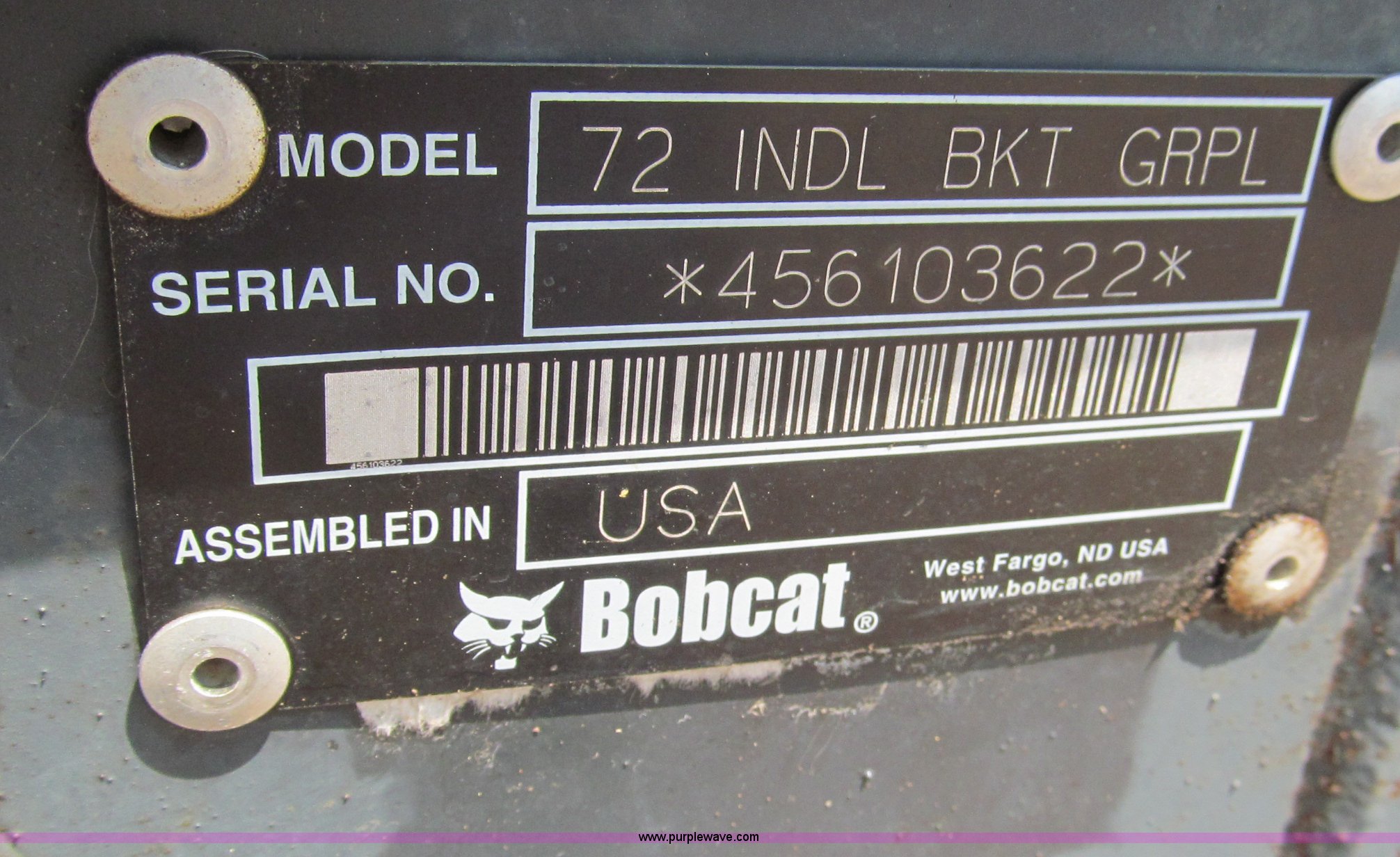 Bobcat skid steer grapple bucket. 72"W, Bolt-on cutting edge, Model 72INDLBCKGRPL, Serial 456103622. Shipping quotes available. Bowlen Construction, Inc.. 11709 E Lone Jack Lee's Summit Rd.. Lees Summit, MO 64086