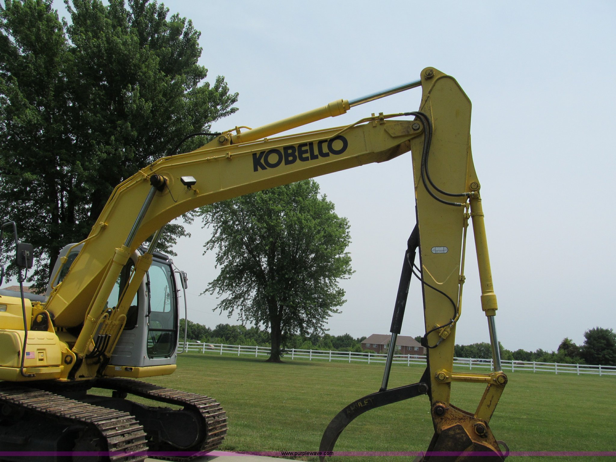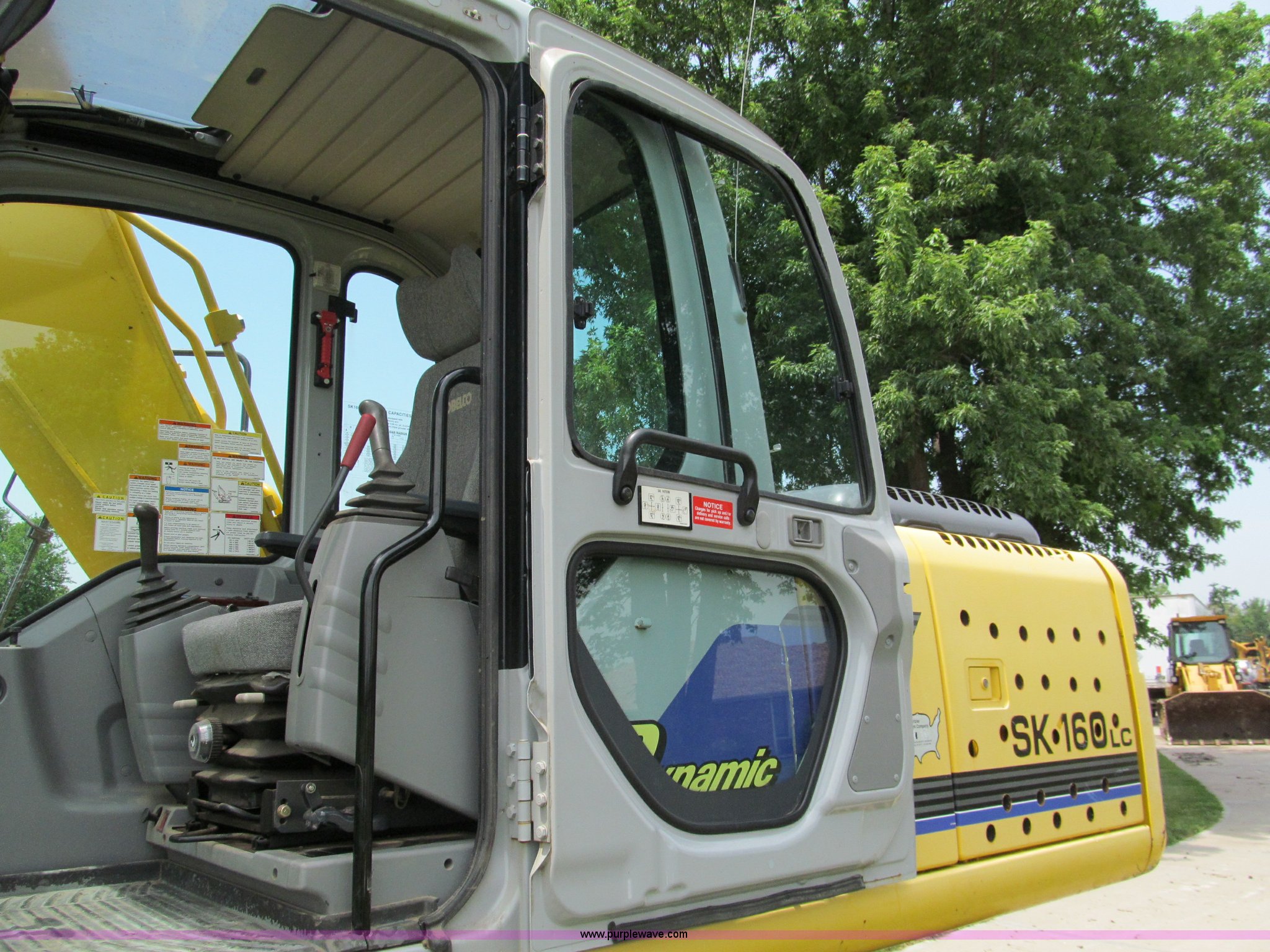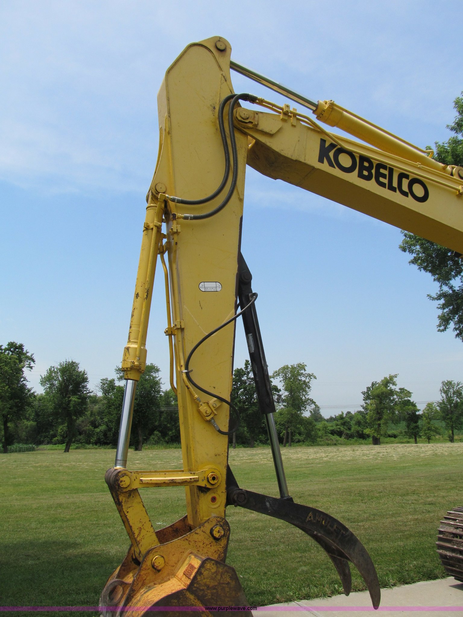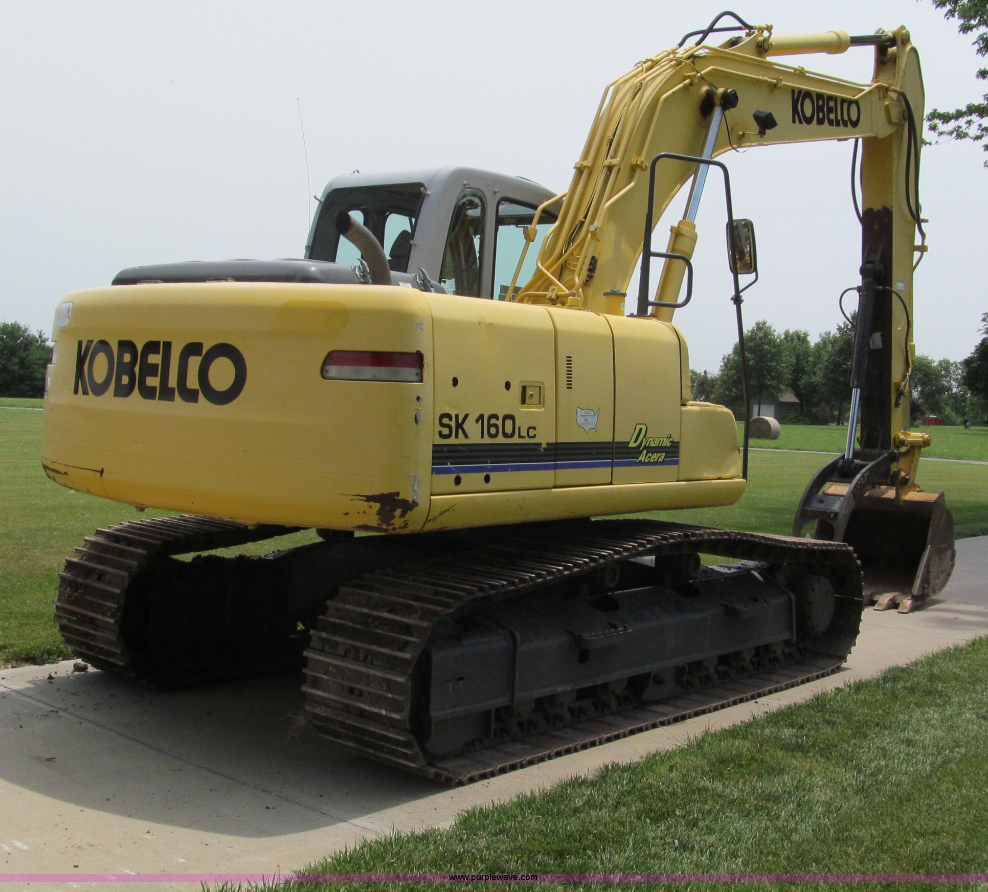 Purple Wave is selling a used Hydraulic Excavator in Missouri. This item is a 2003 Kobelco SK160LC excavator with the following: 847 hours on meter, Mitsubishi four cylinder turbo diesel engine, Enclosed cab, AC and heat, AM/FM, Digital display, Adjustable spring ride seat, 10' stick, Amulet hydraulic thumb, Model UH45, Serial 13049, Werk-Brau 42"W bucket, 1.01 cu. yd. capacity, (6) teeth with side cutters, Serial 92160, 24"W triple grouser pads, Serial YM02-U0370