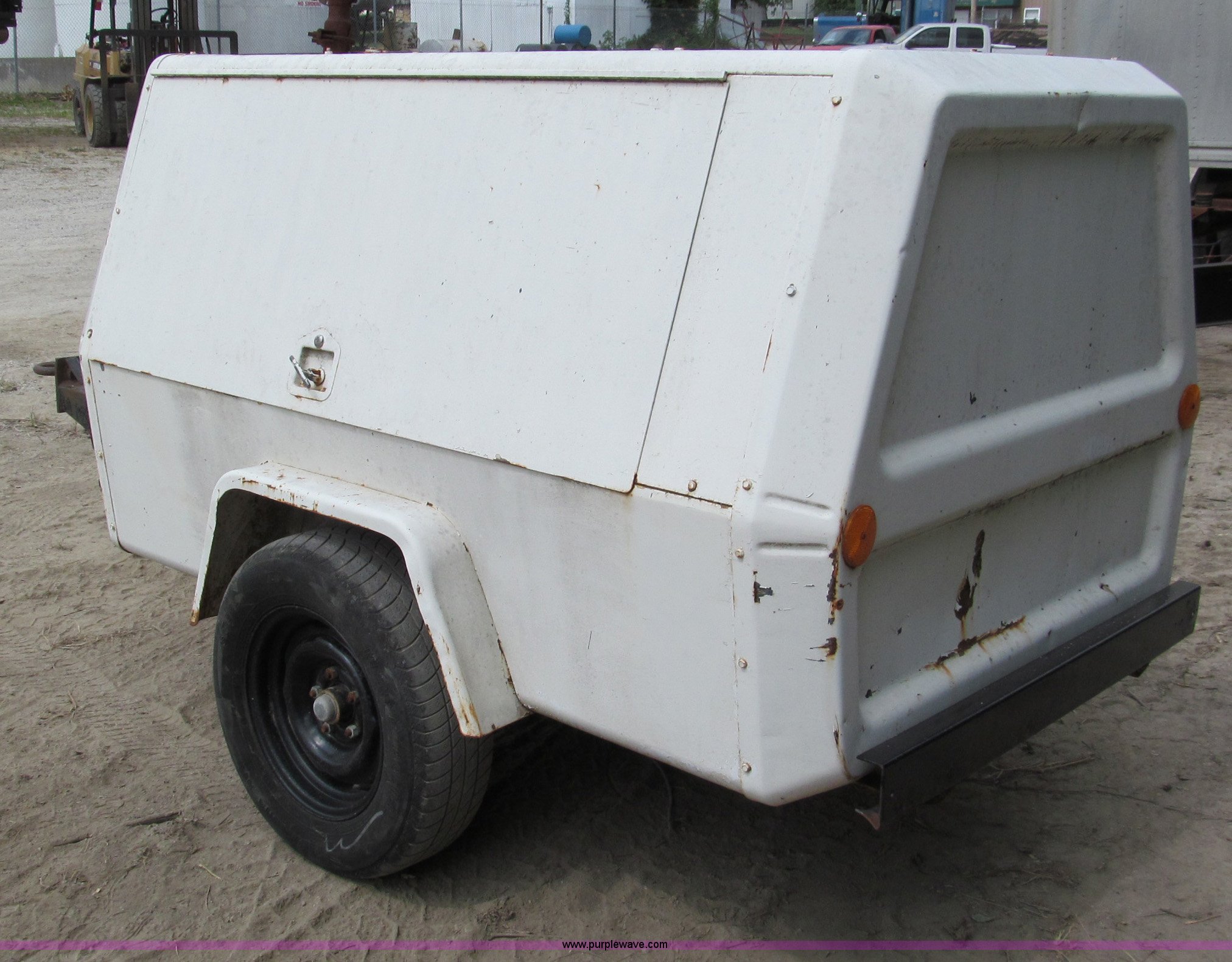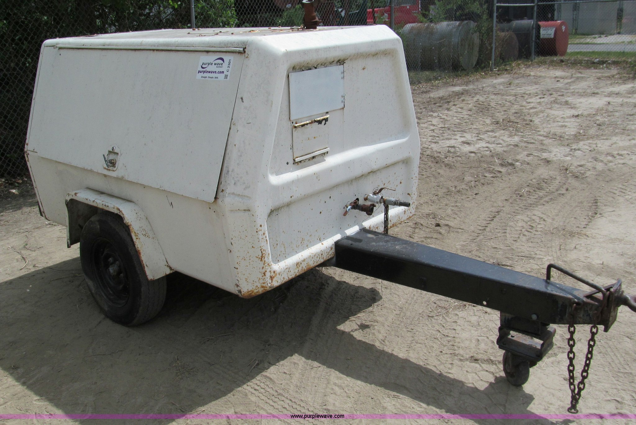 Purple Wave is selling a used Air Compressor in Missouri. This item is a Ingersoll Rand 185 CFM air compressor with the following: 99 hours on meter, Actual hours unknown, Four cylinder gas engine, (2) outlets, Pintle hitch, 165S13 tires, Rebuilt starter, Serial 107265-U79-901