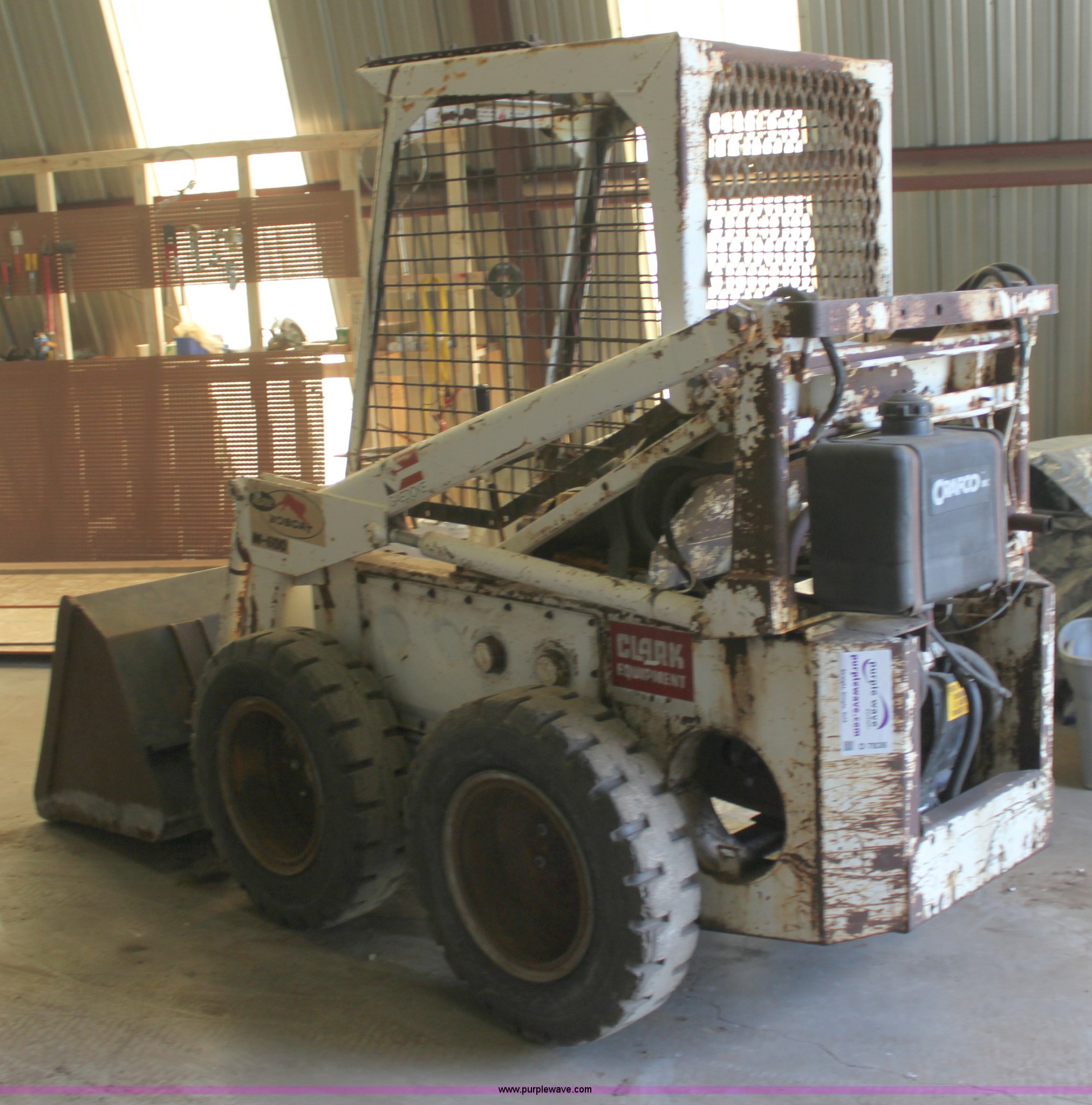 Purple Wave is selling a used Skid Steer Loader in Kansas. This item is a Melroe Bobcat M600 skid steer with the following: Onan 24 HP gas engine, Clutch drive transmission, Foot operated loader controls, 54" bucket, Auxiliary hydraulics, Rear weights, Front work lights, 6.50x16 solid tires