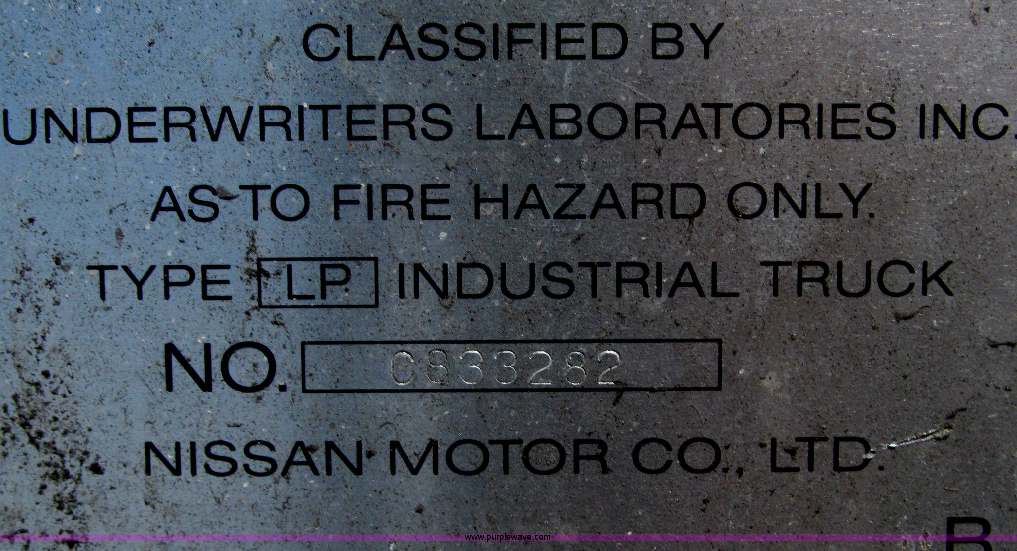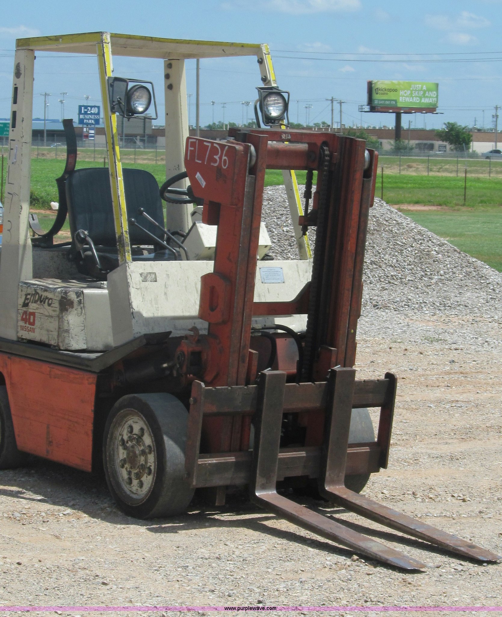 Purple Wave is selling a used Cushion Tire or Pneumatic Forklift in Oklahoma. This item is a 1996 Nissan Enduro 40 forklift with the following: 2,903 hours on meter, Four cylinder propane engine, Shuttle shift transmission, 1F-1R gears, 40"L forks, 82"H maximum lift, Hydraulic mast tilt, Work lights, 33.4 or 43.5 lb propane tank, 7,213 lbs. base operating weight, 5.33/178-381 front tires, 413/152-285 rear tires, Cushion tires, Propane tank not included, Serial KCPH02P907638, Unit# FL736