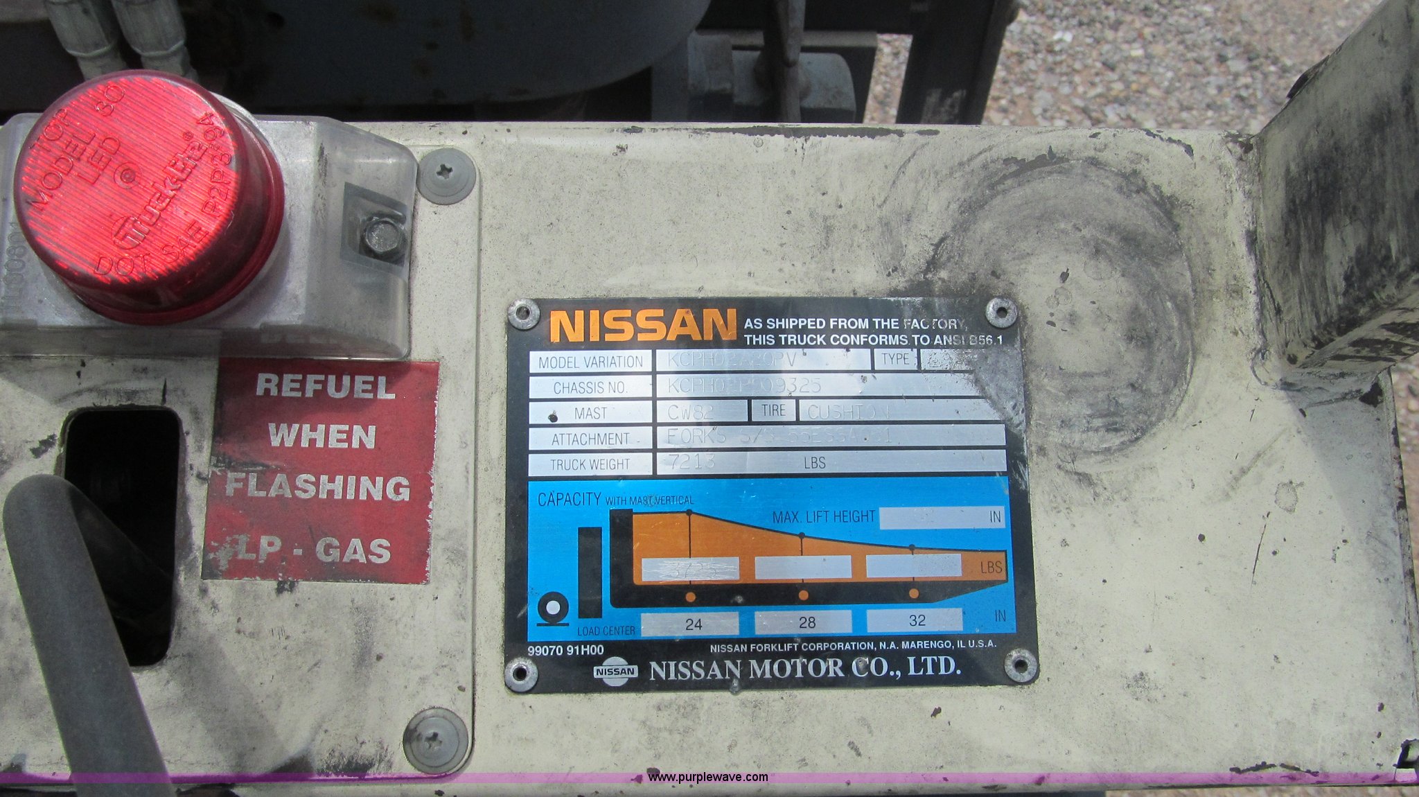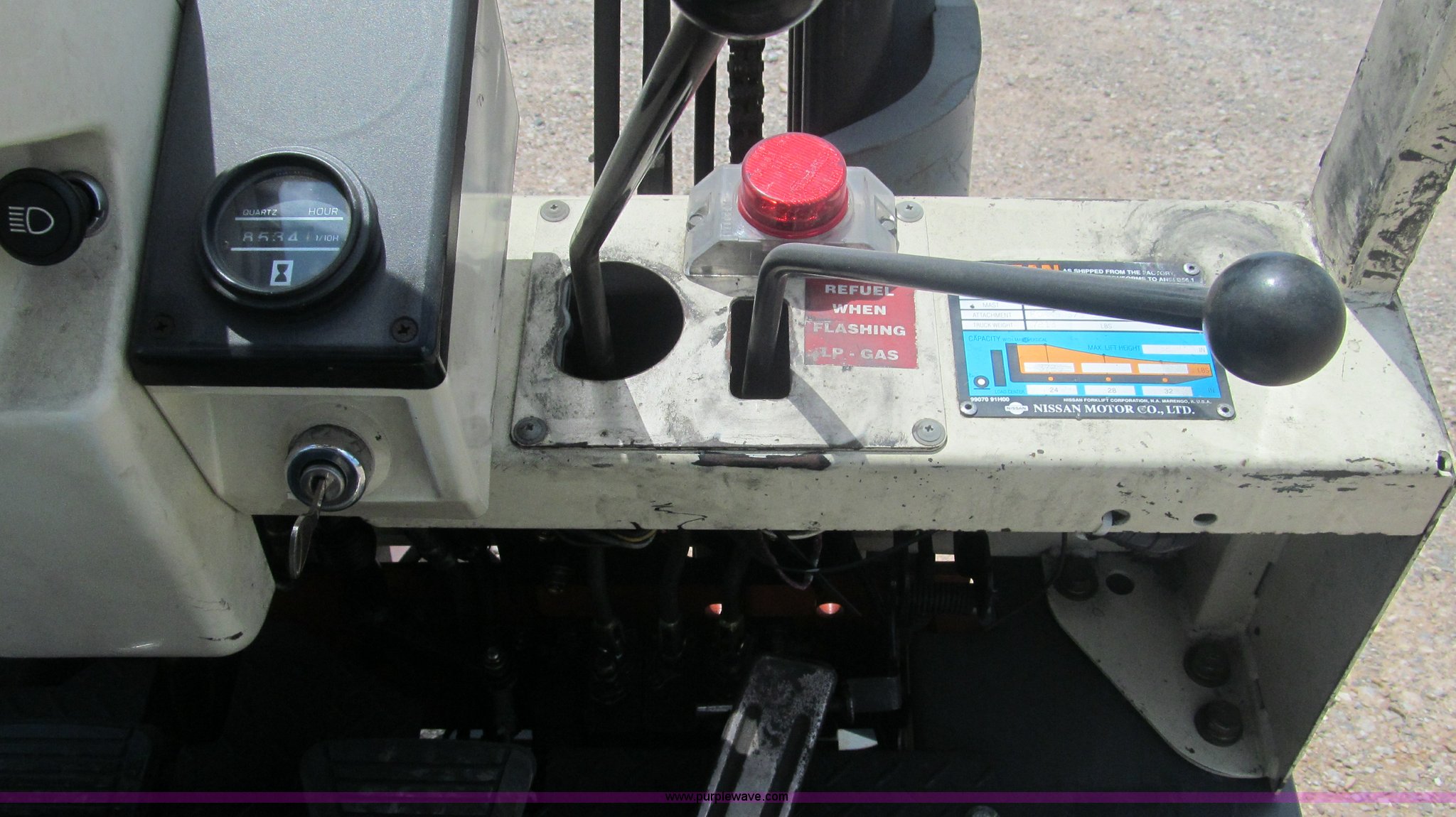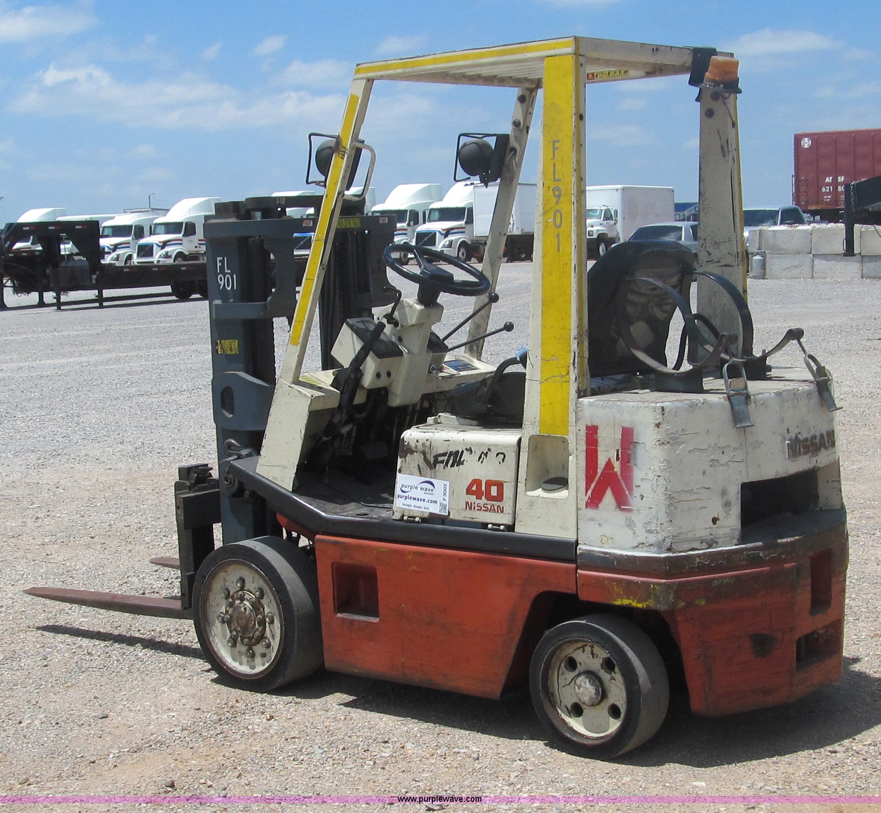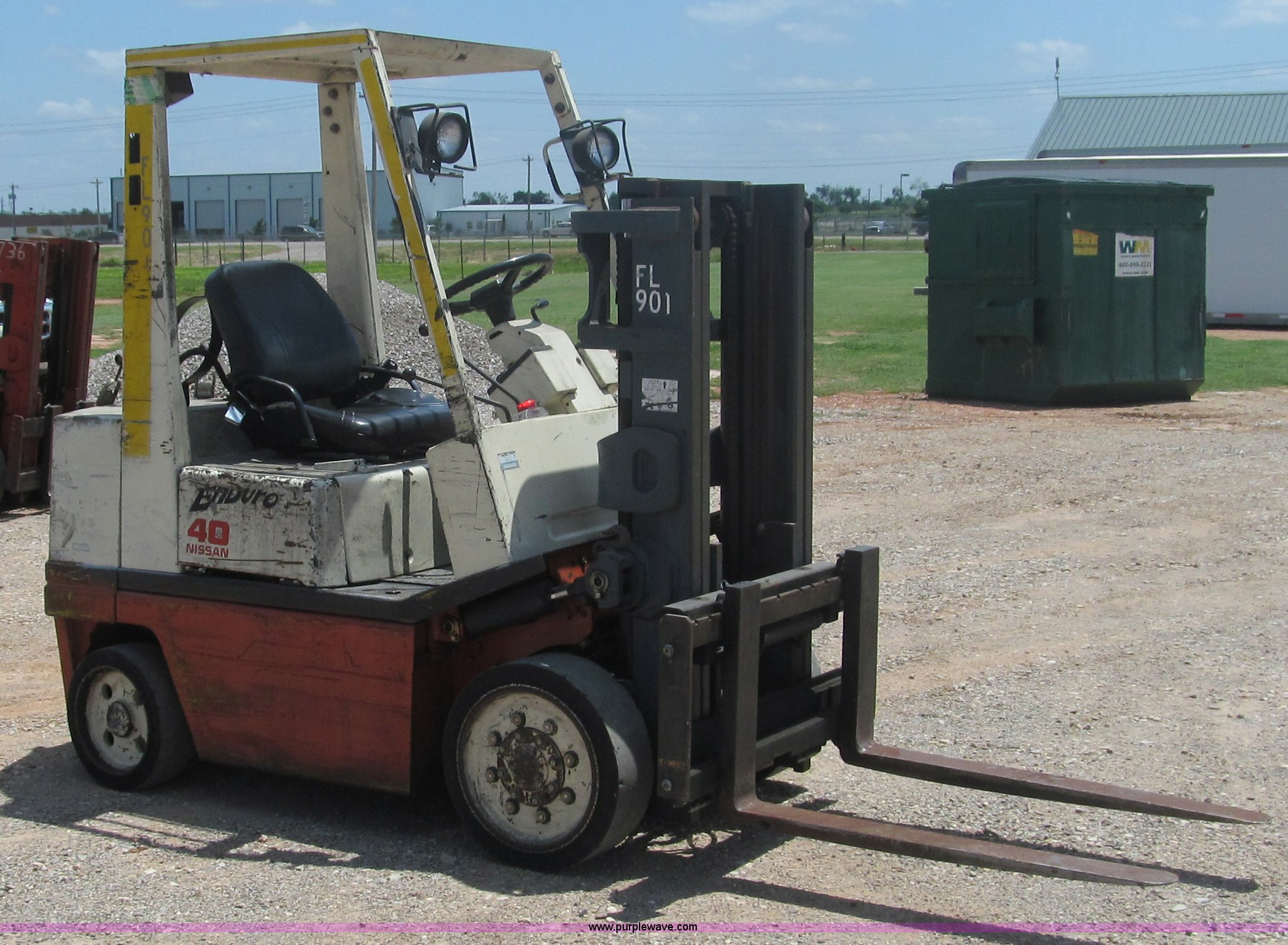 Purple Wave is selling a used Cushion Tire or Pneumatic Forklift in Oklahoma. This item is a 1997 Nissan Enduro 40 forklift with the following: 8,534 hours on meter, Four cylinder propane engine, Shuttle shift transmission, 1F-1R gears, 40"L forks, 82"H maximum lift, Hydraulic mast tilt, Side shift, Work lights, 7,213 lbs. base operating weight, 5.33/178-381 front tires, 413/152-285 rear tires, Cushion tires, Propane tank not included, Serial KCPH02P909325, Unit# FL901