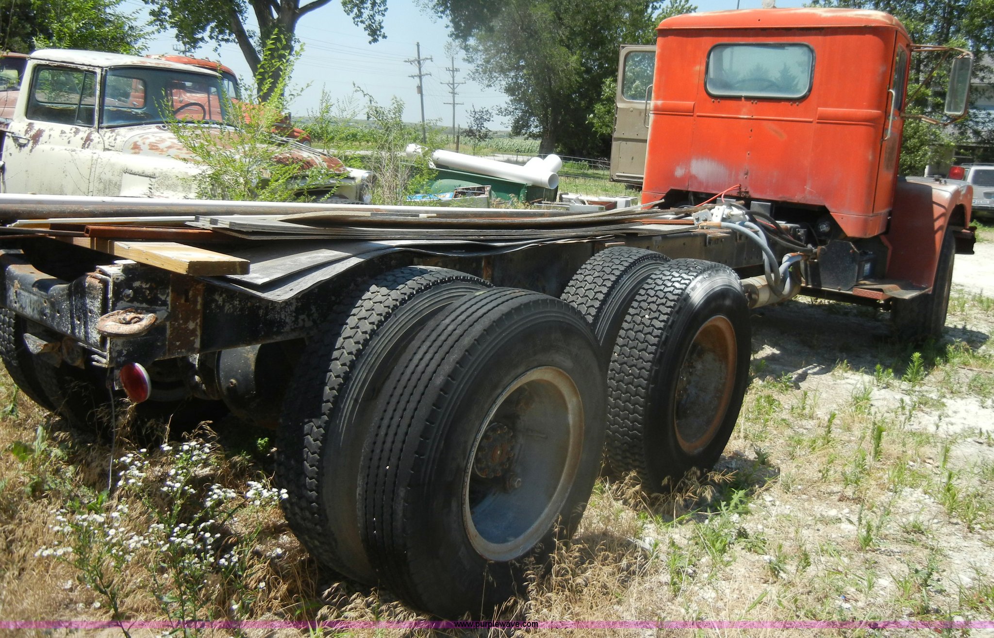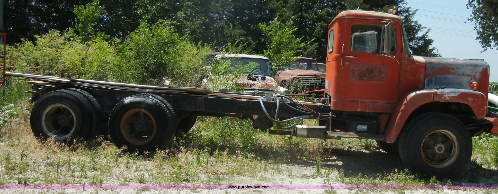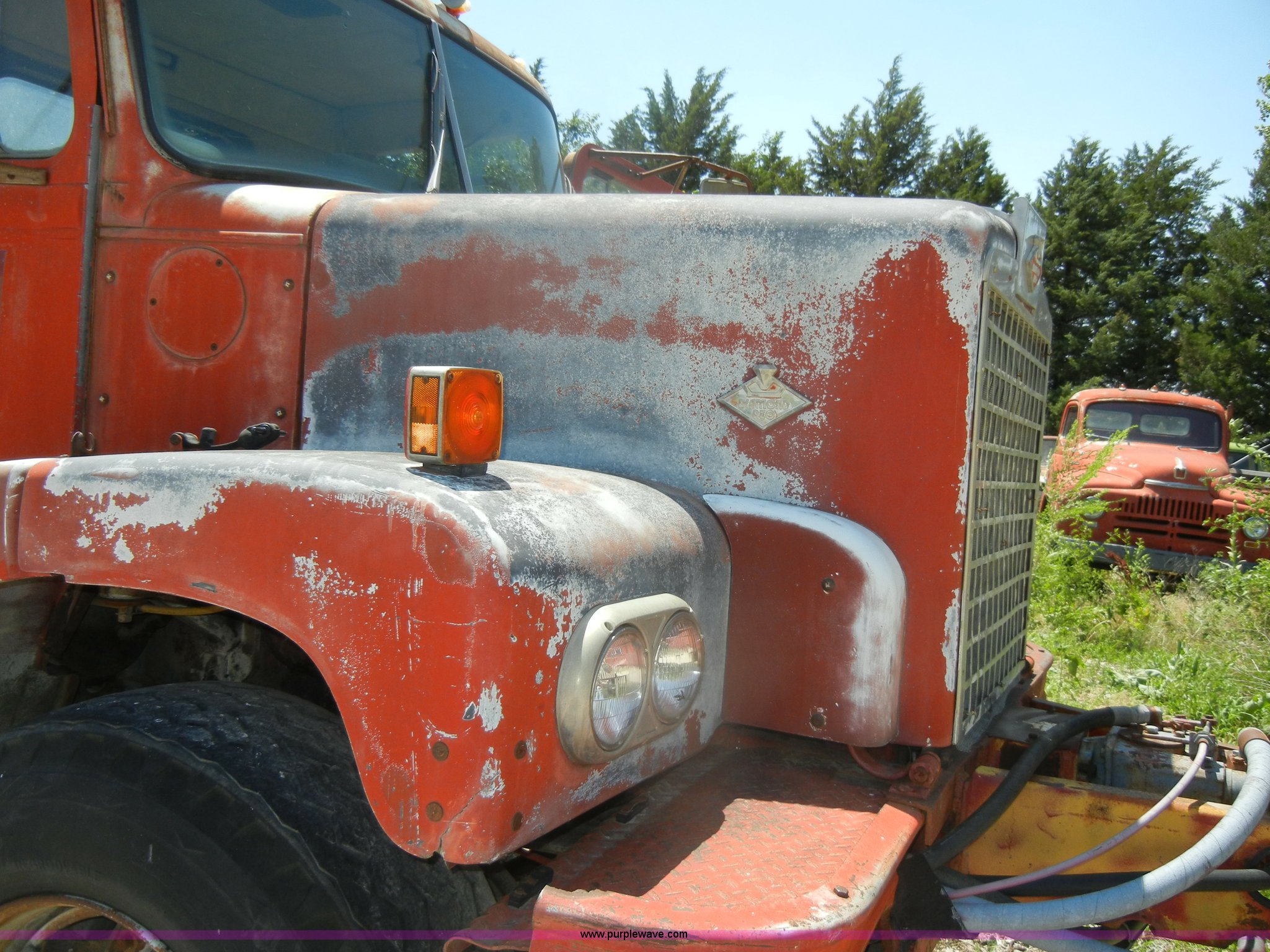 Purple Wave is selling a used Truck Chassis in Kansas. This item is a 1974 Diamond Reo DC10164 semi truck cab and chassis with the following: 81,153 miles on odometer, 790,550 hours on meter, Gas engine, 32 HP, Model 6-200, Five speed manual transmission, Manual windows and locks, Cloth air ride seats, 54 gallon fuel tank, Front and rear tow hooks, Air brakes, Air suspension, 204" bed base, 385/65R22.5 front tires, 9.00R20 rear tires, GVWR 48,320 lbs, Previously used as cement truck, Interior/exterior cosmetic damage, Dents and scratches, Wooden planks not included, Will be removed