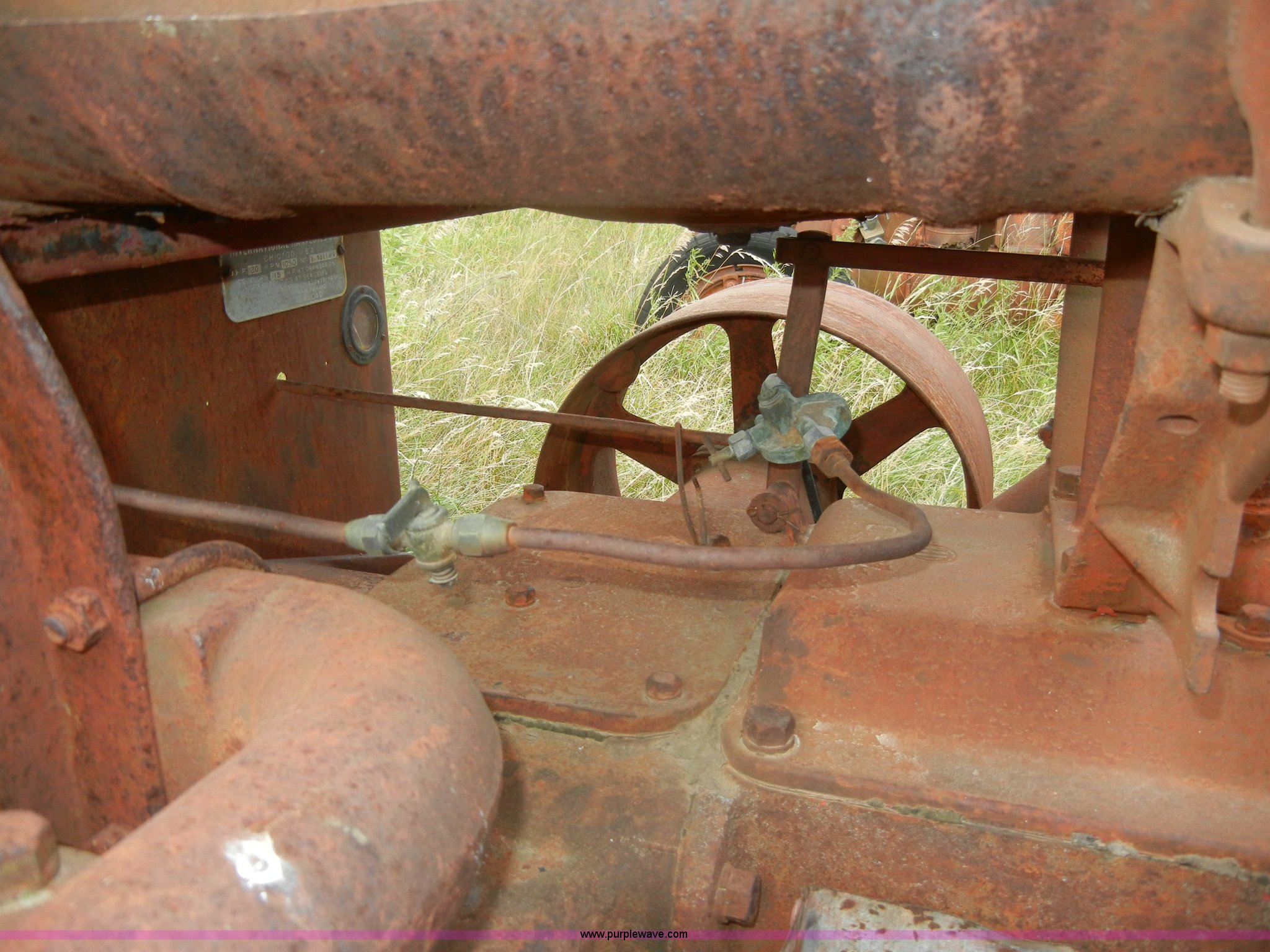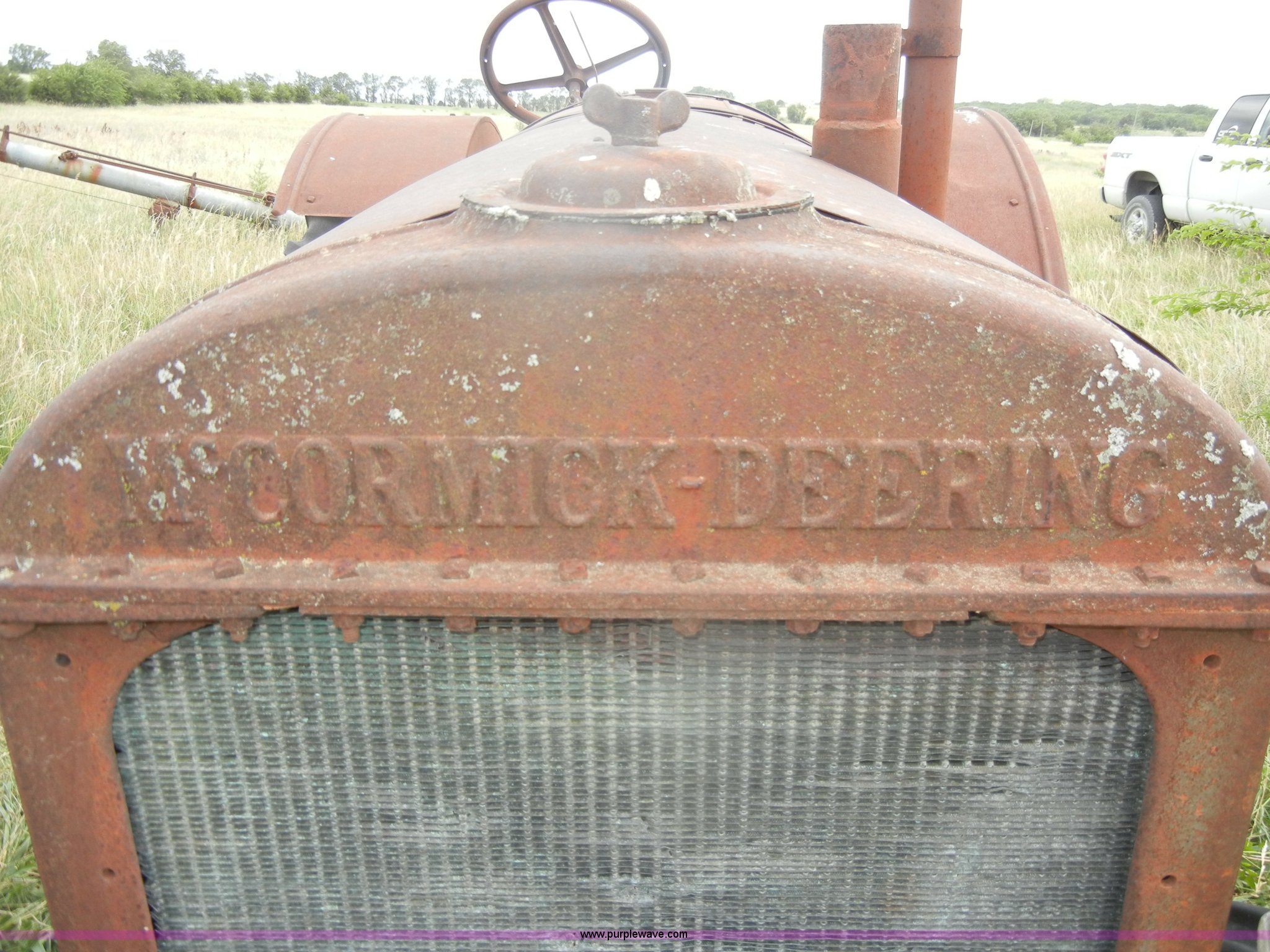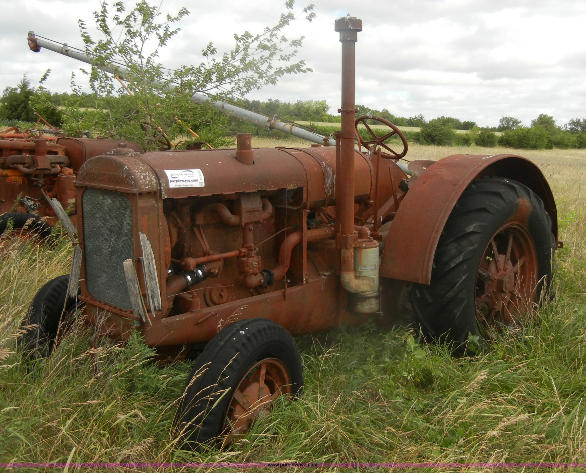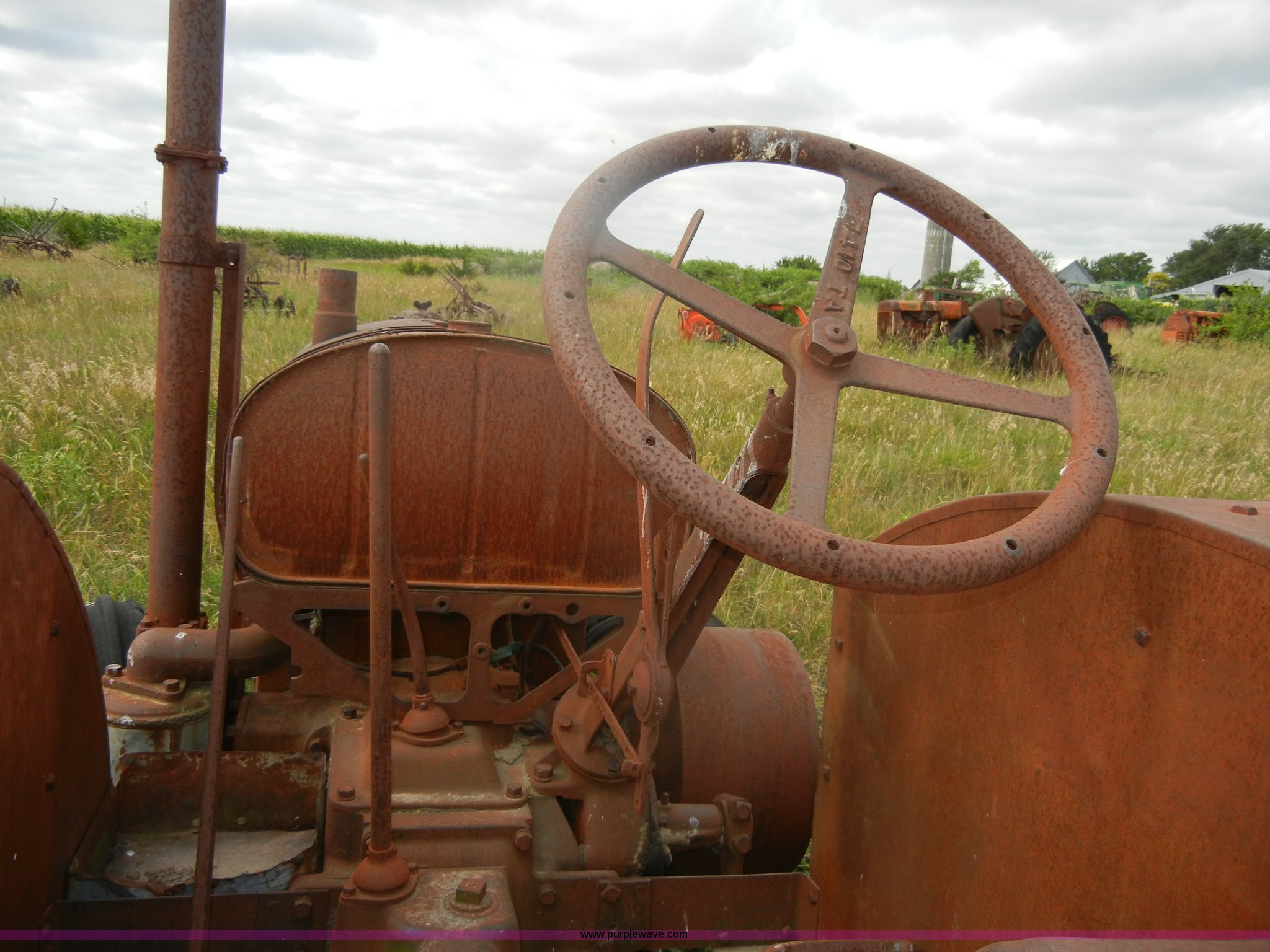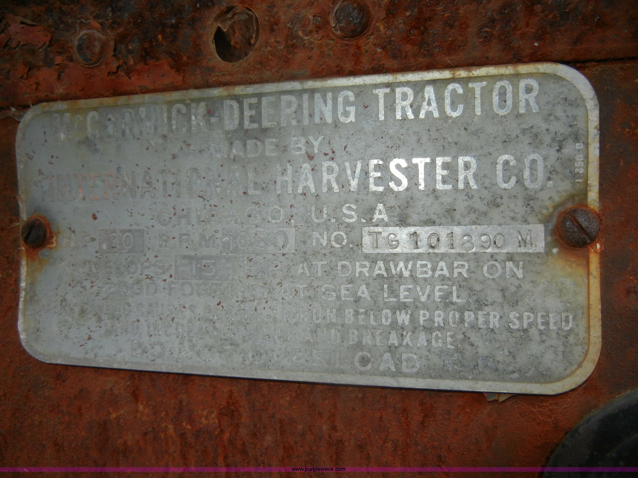 Purple Wave is selling a used Tractor in Kansas. This item is a McCormick-Deering 1530 tractor with the following: Four cycle kerosene engine, 30 HP, Manual transmission, 3F-1R gears, Crank start, Draw bar, Steel seat, Needs repaired, Unattached manifold and side vents included, 18.5 gallon fuel tank, 14-30 rear tires, Need replaced, Rear rims need repaired, Serial TG101890M
