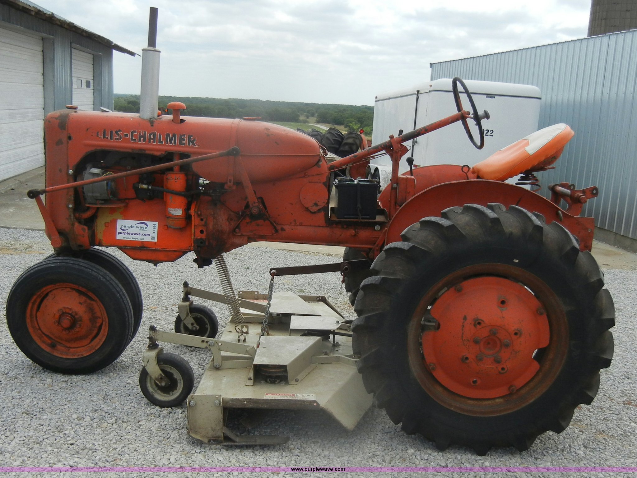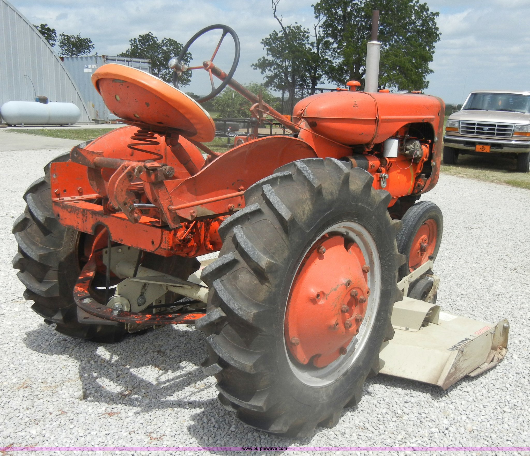 Purple Wave is selling a used Tractor in Kansas. This item is a 1949 Allis-Chalmers C tractor with the following: Four cylinder gas engine, Three speed transmission, 540 PTO, Wood L306 6' mower, Serial 493070, 5.00-15 front tires, 11.2-24 rear tires, Serial 72770