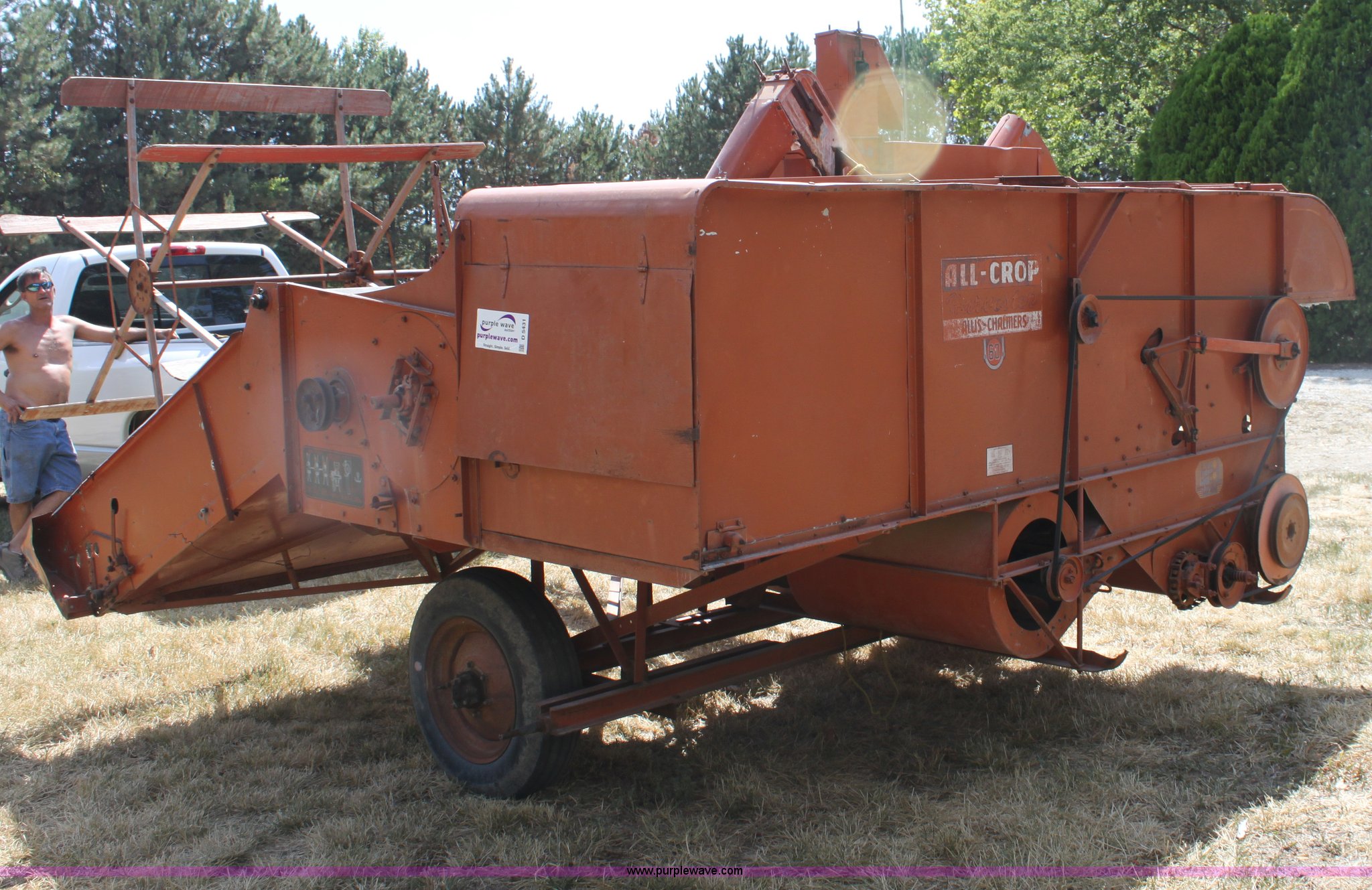 Purple Wave is selling a used Combine in Kansas. This item is a 1948 Allis-Chalmers 60 All-Crop harvester combine with the following: 5' sickle bar, Wood reel, 80"L x 5.5" diameter auger, 5' canvas conveyor, 18 bushel hopper, Ground driven reel, 540 PTO, PTO driven sickle bar and augers, Windrow attachment and straw spreaders, Auxiliary axles, Pin hitch, 6.00-16 tires, (3) tires recently replaced, Owners manual included, Original bill of sale, Used in 2011 for sunflowers, milo, and wheat