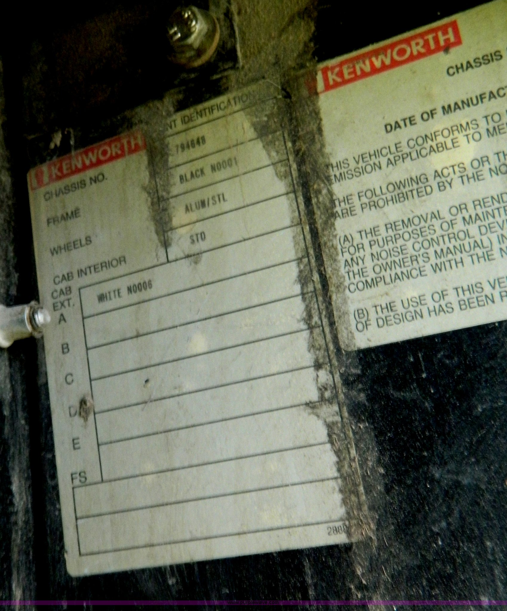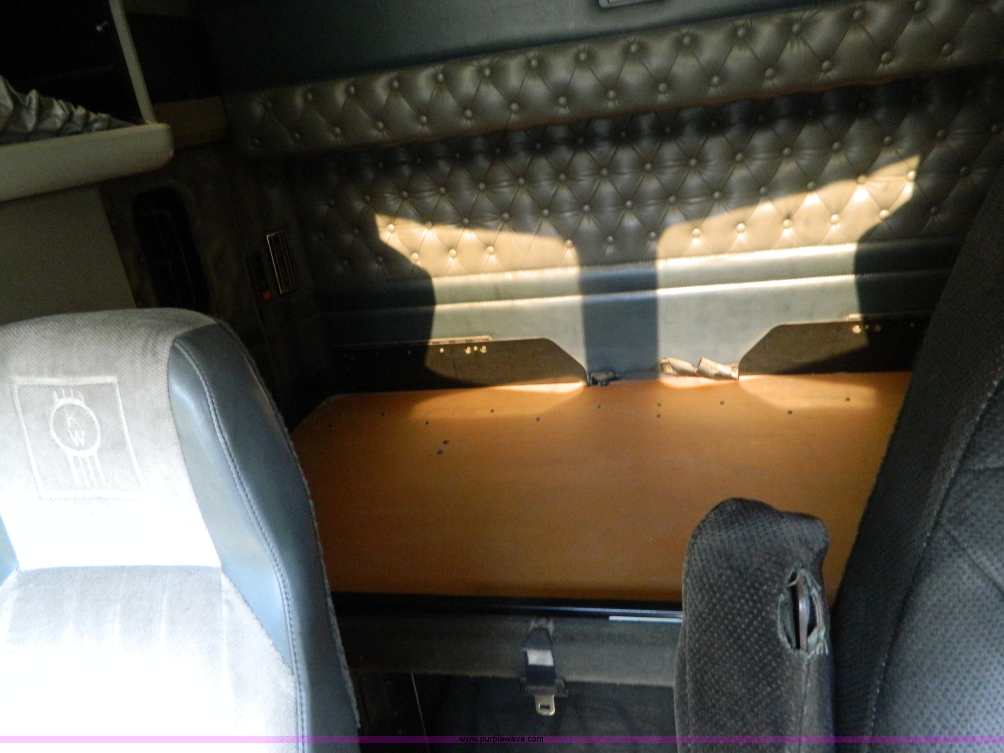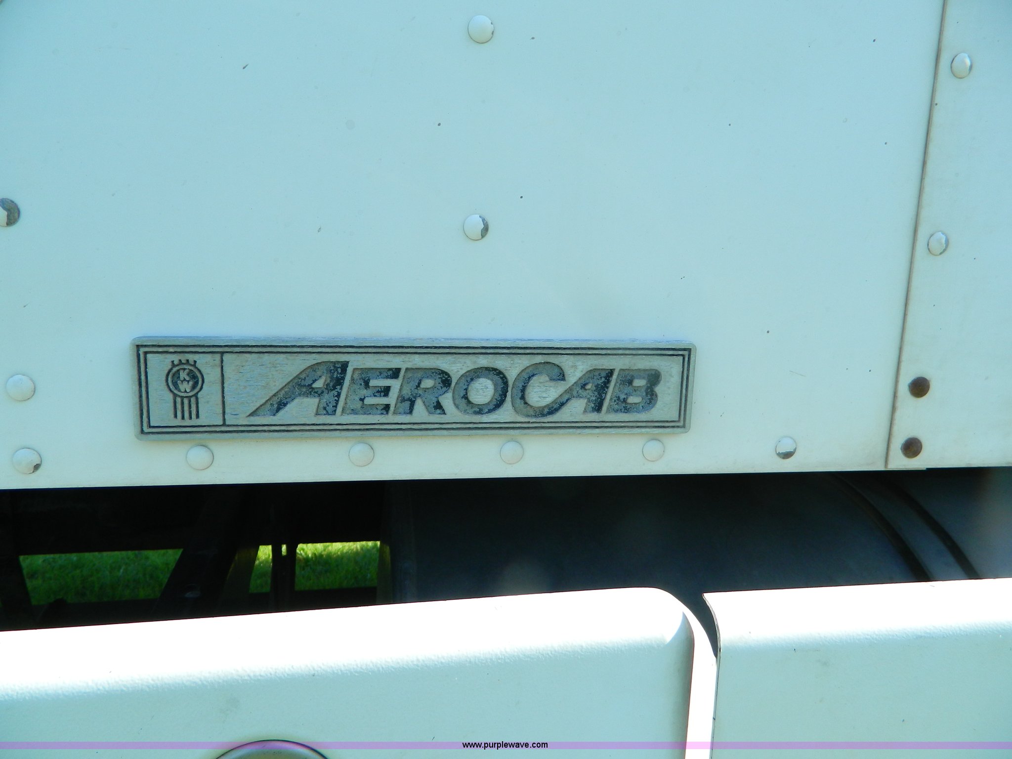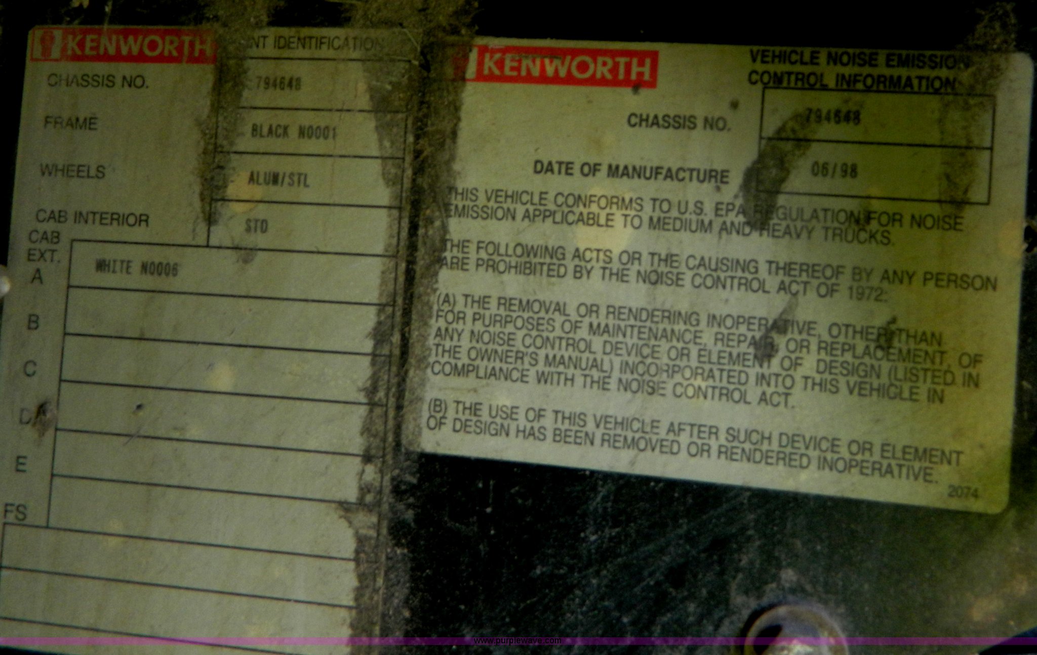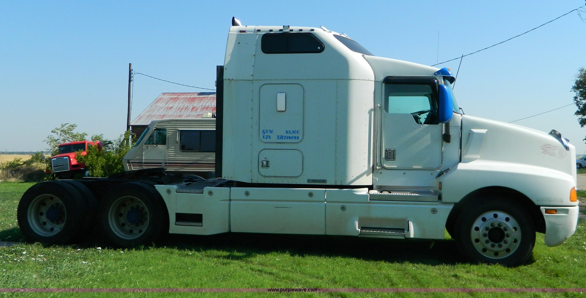 Purple Wave is selling a used Truck Tractor in Kansas. This item is a 1999 Kenworth T600 AeroCab semi truck with the following: 243,416 miles on odometer, Not actual mileage, Cummins N14 14.0L L6 diesel engine, Eaton Fuller 13 speed manual transmission, Twin screw, AC and heat, Tilt, Cruise, AM/FM/CD, Air ride seats, Power windows and mirrors, Air ride cab, 60" sleeper, Visor, Block heater, Dual 120 gallon fuel tanks, Aluminum deck plate, Dump valves, Air suspension, Air brakes, Jake brake, Engine brake, 3.70 gear ratio, 123" wheelbase, (6) aluminum wheels, (4) steel wheels, 285/75R24.5 tires, Chassis No. 794648, Interior/exterior cosmetic damage, Cracked mirror