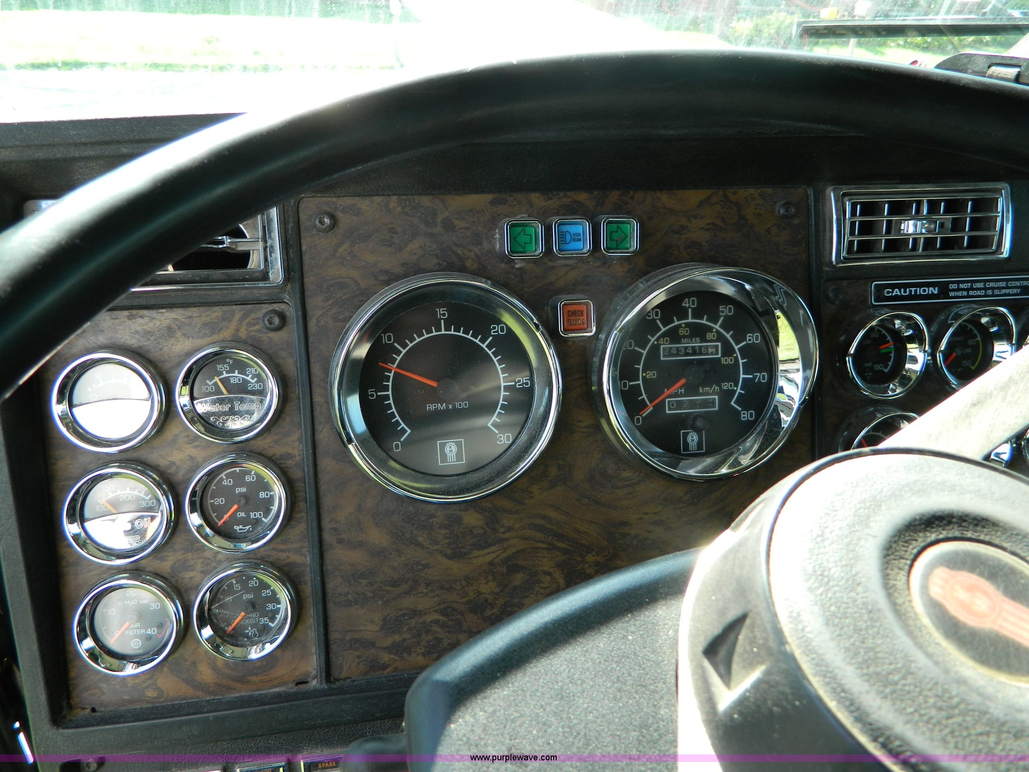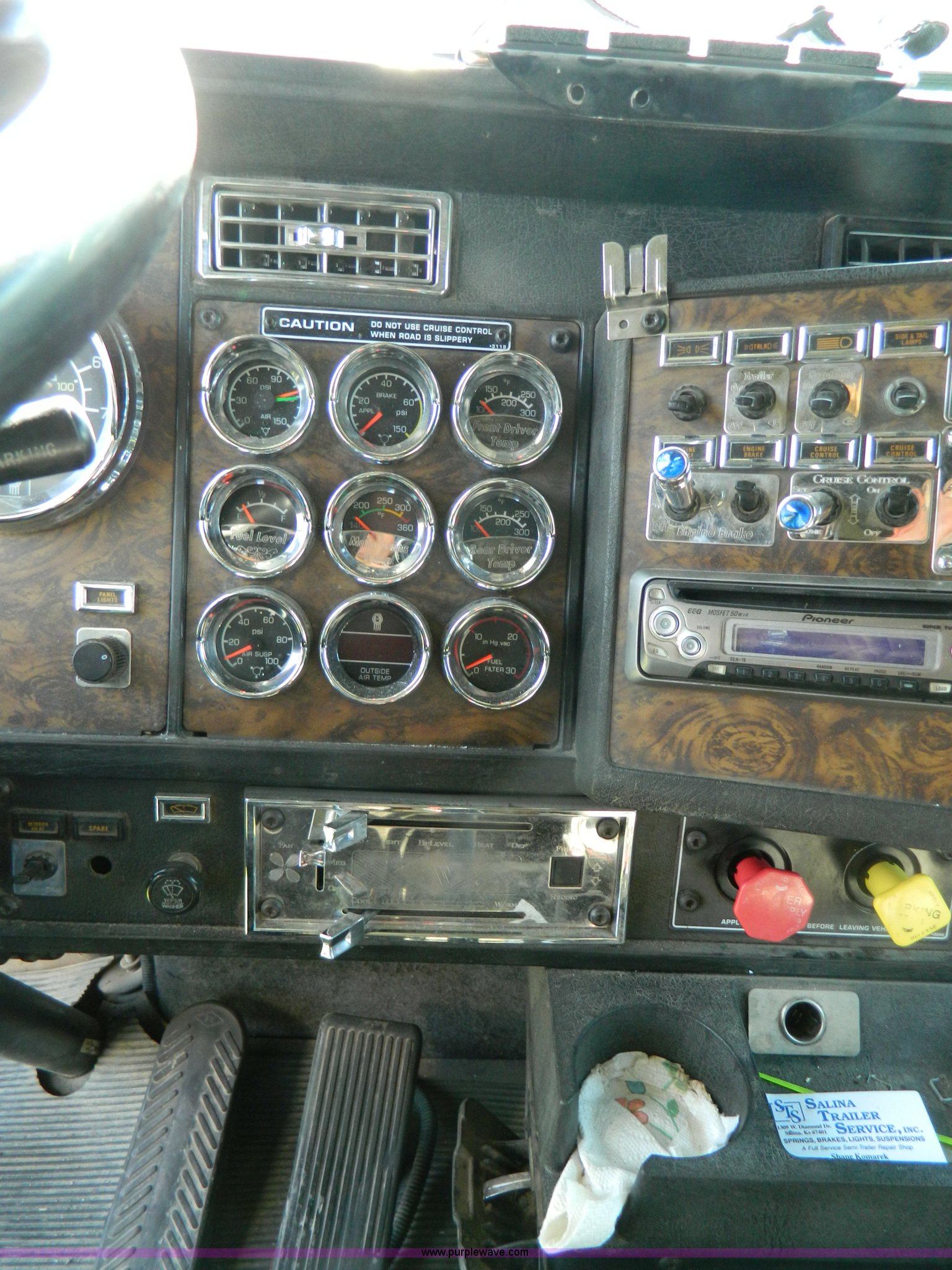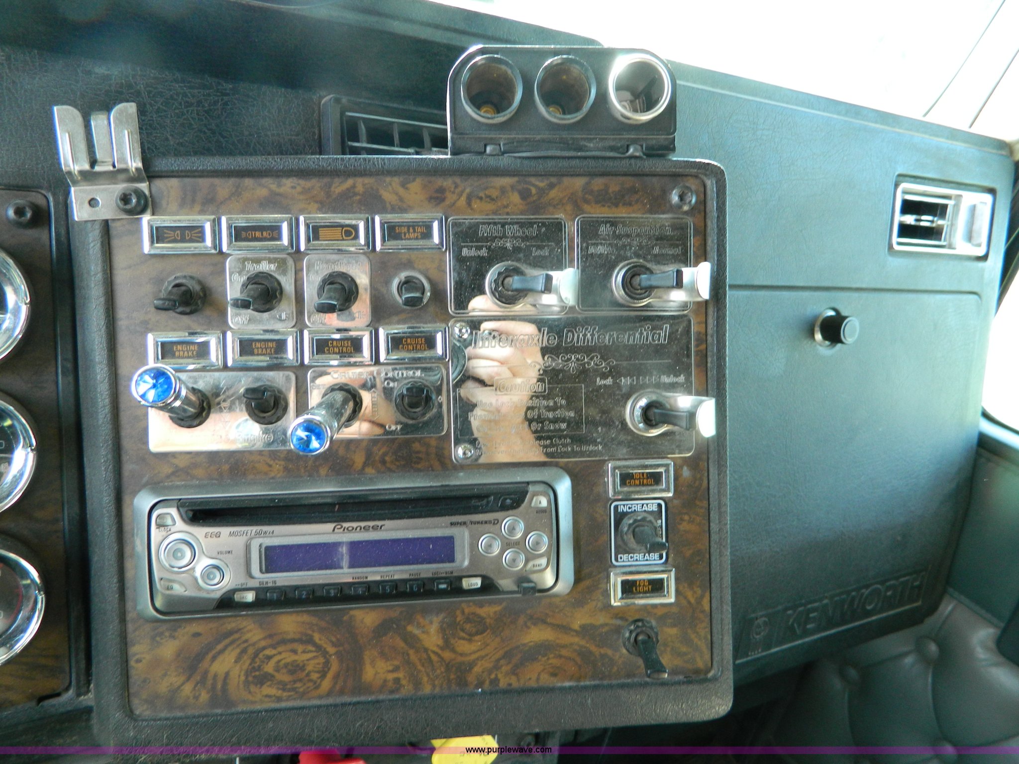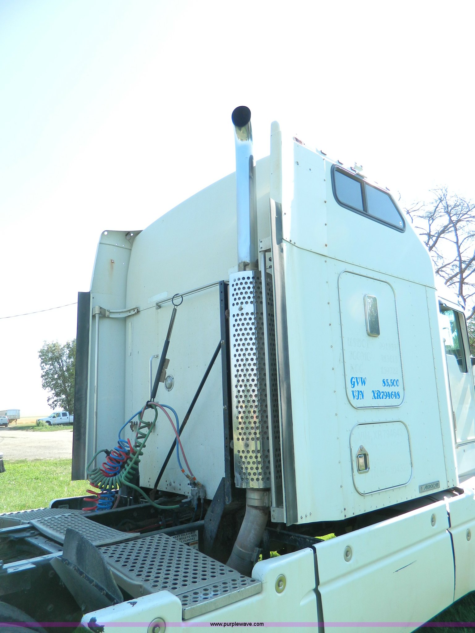 Purple Wave is selling a used Truck Tractor in Kansas. This item is a 1999 Kenworth T600 AeroCab semi truck with the following: 243,416 miles on odometer, Not actual mileage, Cummins N14 14.0L L6 diesel engine, Eaton Fuller 13 speed manual transmission, Twin screw, AC and heat, Tilt, Cruise, AM/FM/CD, Air ride seats, Power windows and mirrors, Air ride cab, 60" sleeper, Visor, Block heater, Dual 120 gallon fuel tanks, Aluminum deck plate, Dump valves, Air suspension, Air brakes, Jake brake, Engine brake, 3.70 gear ratio, 123" wheelbase, (6) aluminum wheels, (4) steel wheels, 285/75R24.5 tires, Chassis No. 794648, Interior/exterior cosmetic damage, Cracked mirror