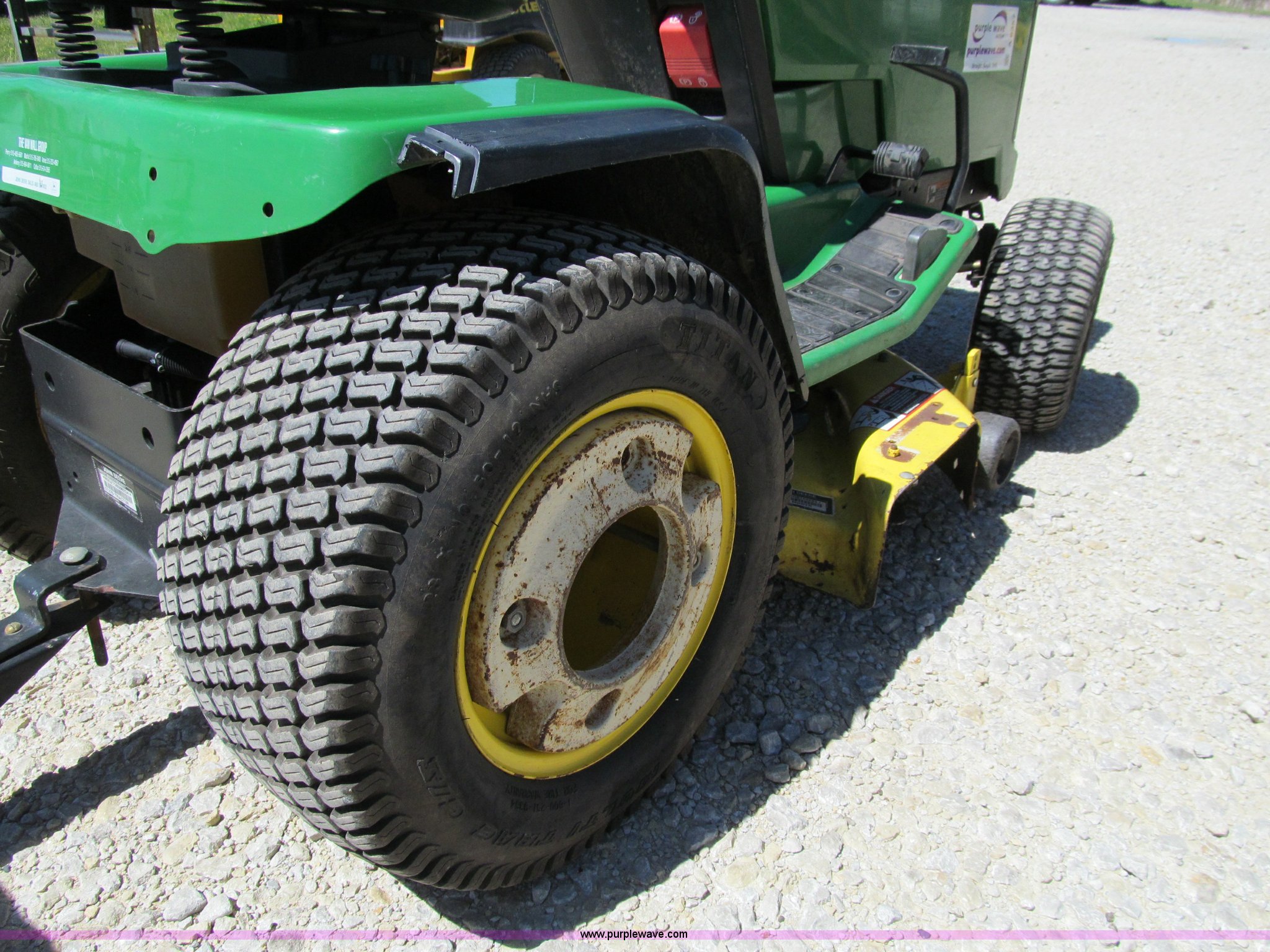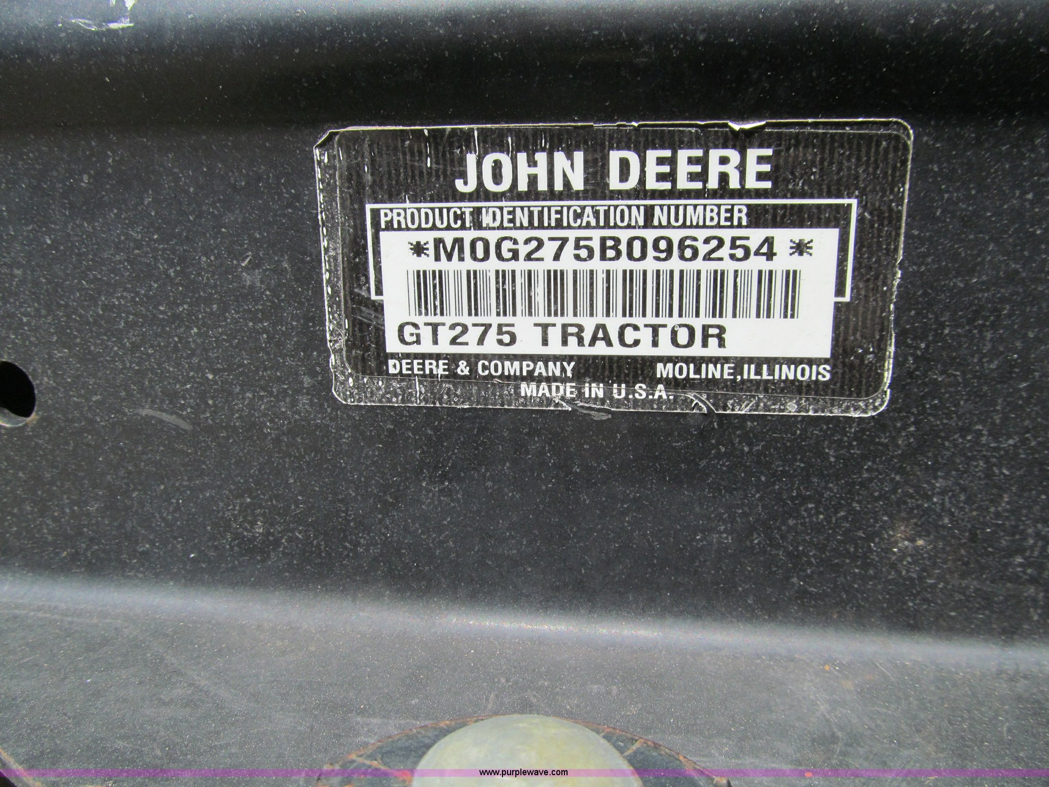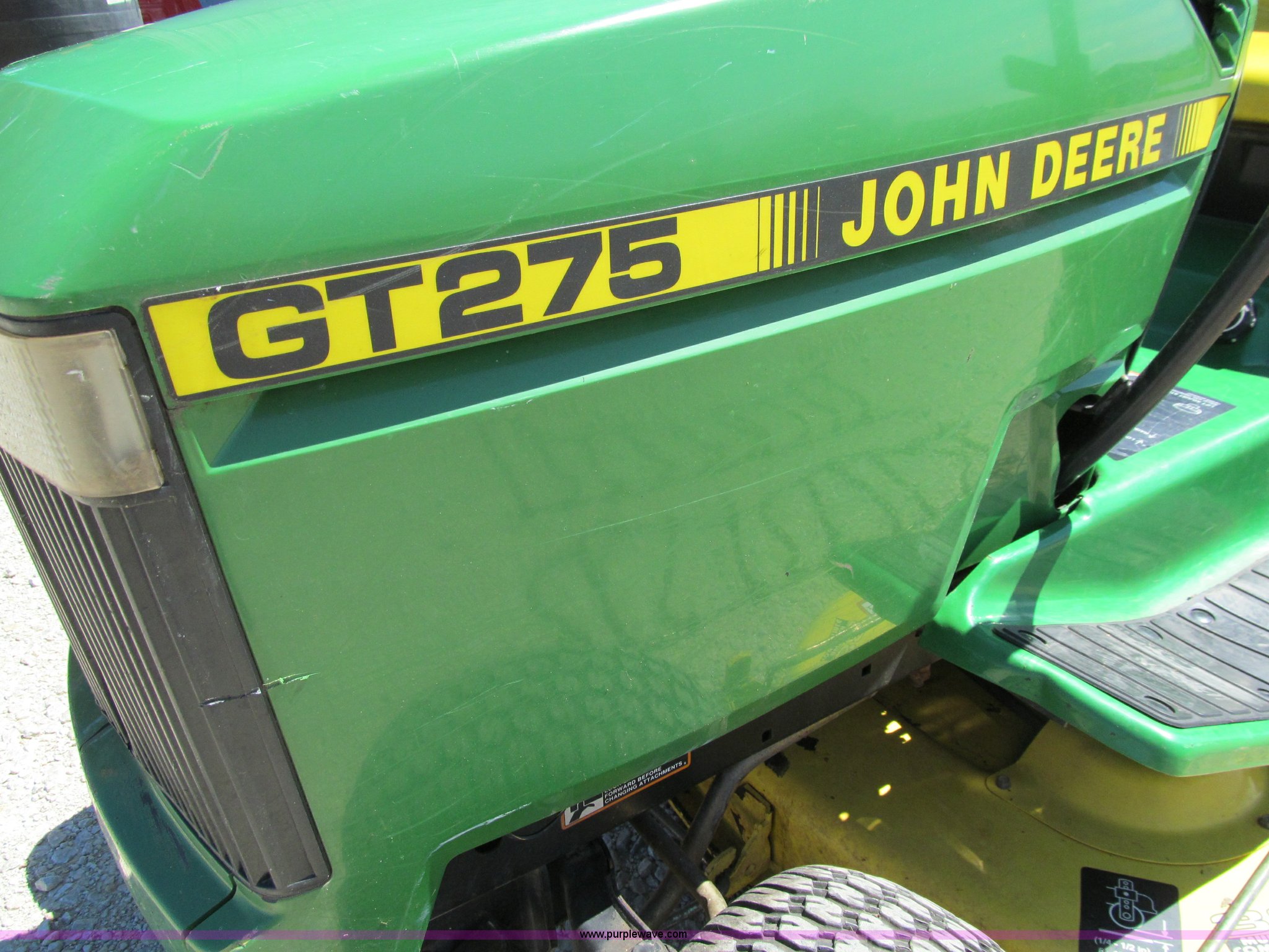 Purple Wave is selling a used Lawn and Garden in Iowa. This item is a John Deere GT275 lawn mower with the following: 38" cut, Kawasaki 17 HP gas engine, Hydrostatic transmission, Rear wheel weights, Rear tire chains, Lawn tender dump trailer, Single axle, 38"L x 27"W x 12"D, John Deere 42" front blade, 6.50-8 front tires, 23x10.5-12 rear tires, Front hood cracked with pieces missing, Serial M0G275B096254