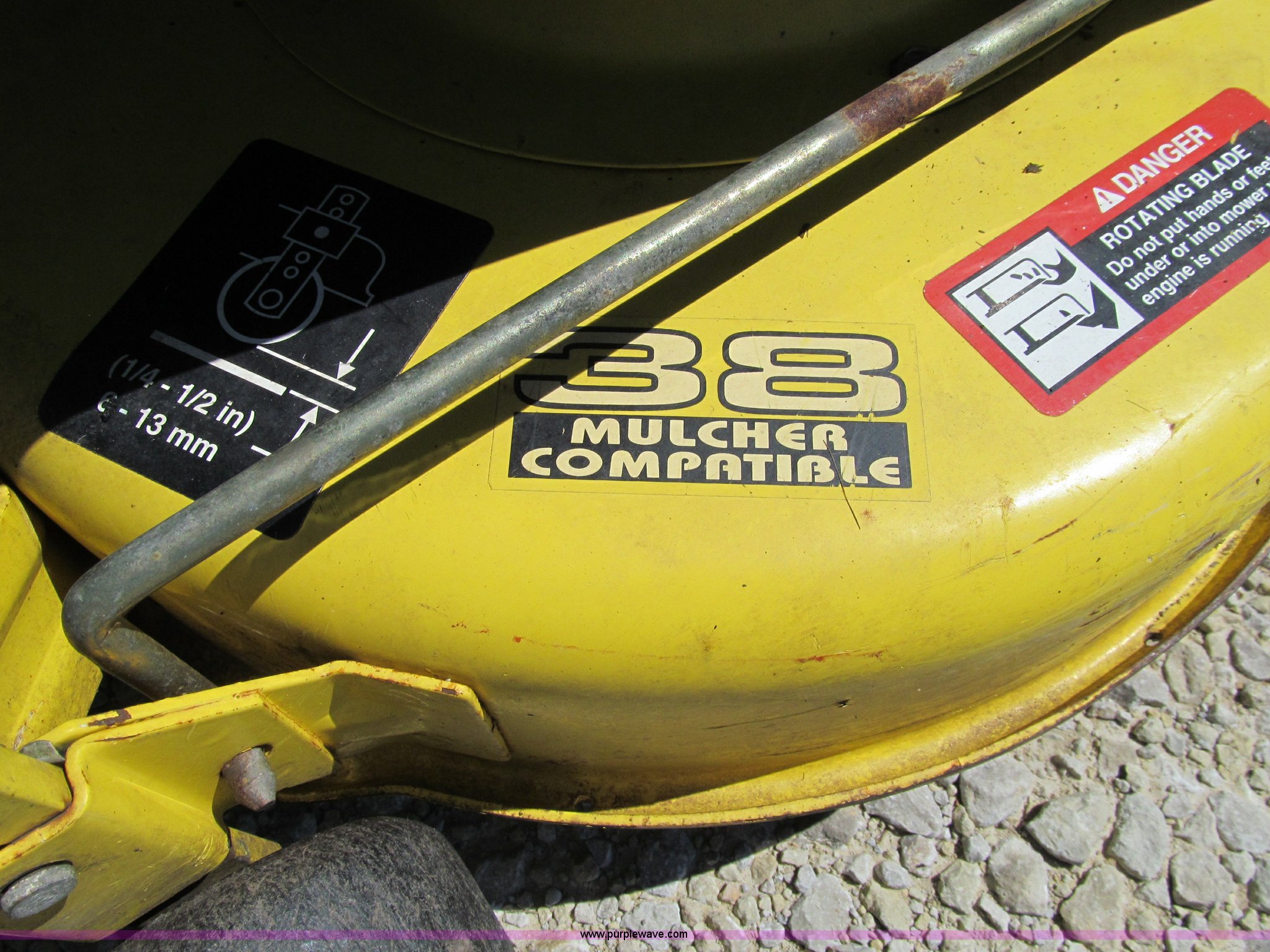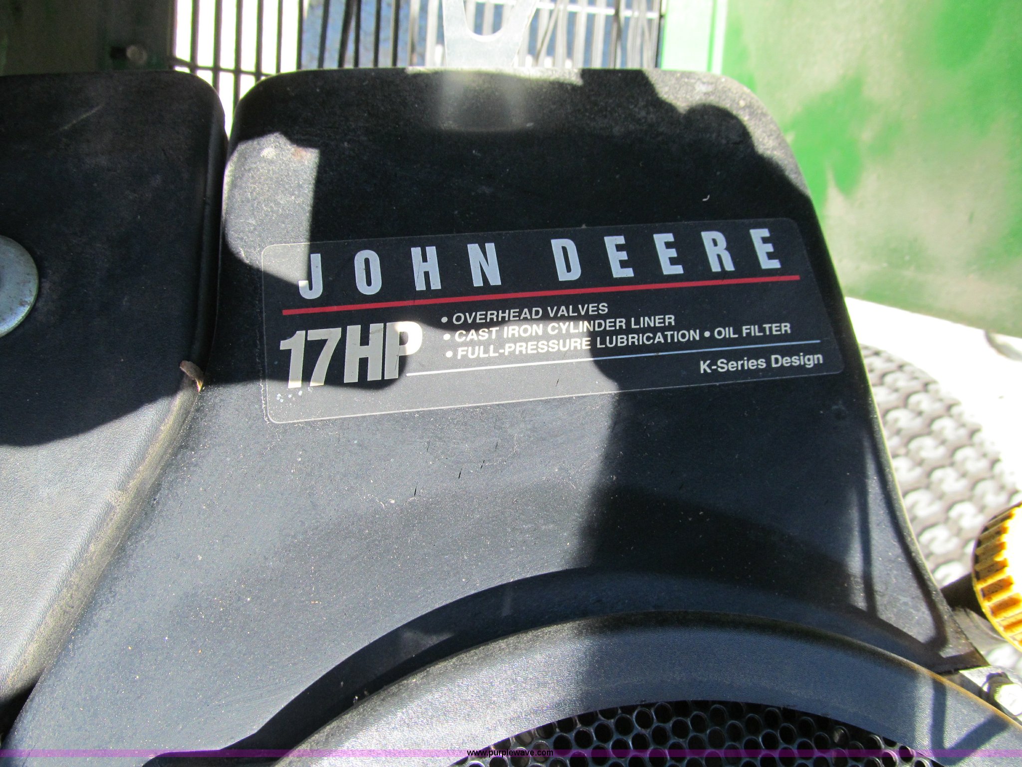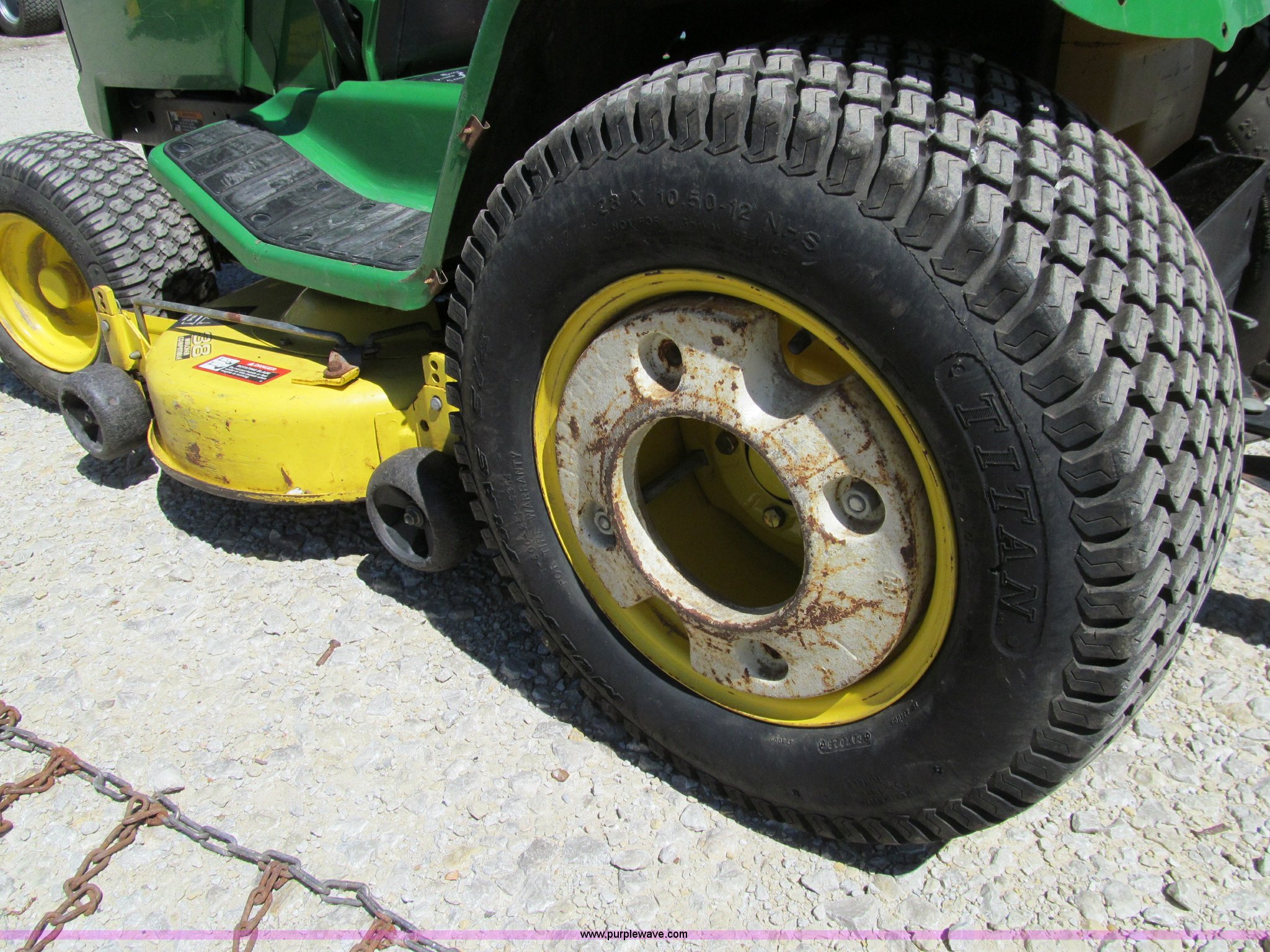Purple Wave is selling a used Lawn and Garden in Iowa. This item is a John Deere GT275 lawn mower with the following: 38" cut, Kawasaki 17 HP gas engine, Hydrostatic transmission, Rear wheel weights, Rear tire chains, Lawn tender dump trailer, Single axle, 38"L x 27"W x 12"D, John Deere 42" front blade, 6.50-8 front tires, 23x10.5-12 rear tires, Front hood cracked with pieces missing, Serial M0G275B096254