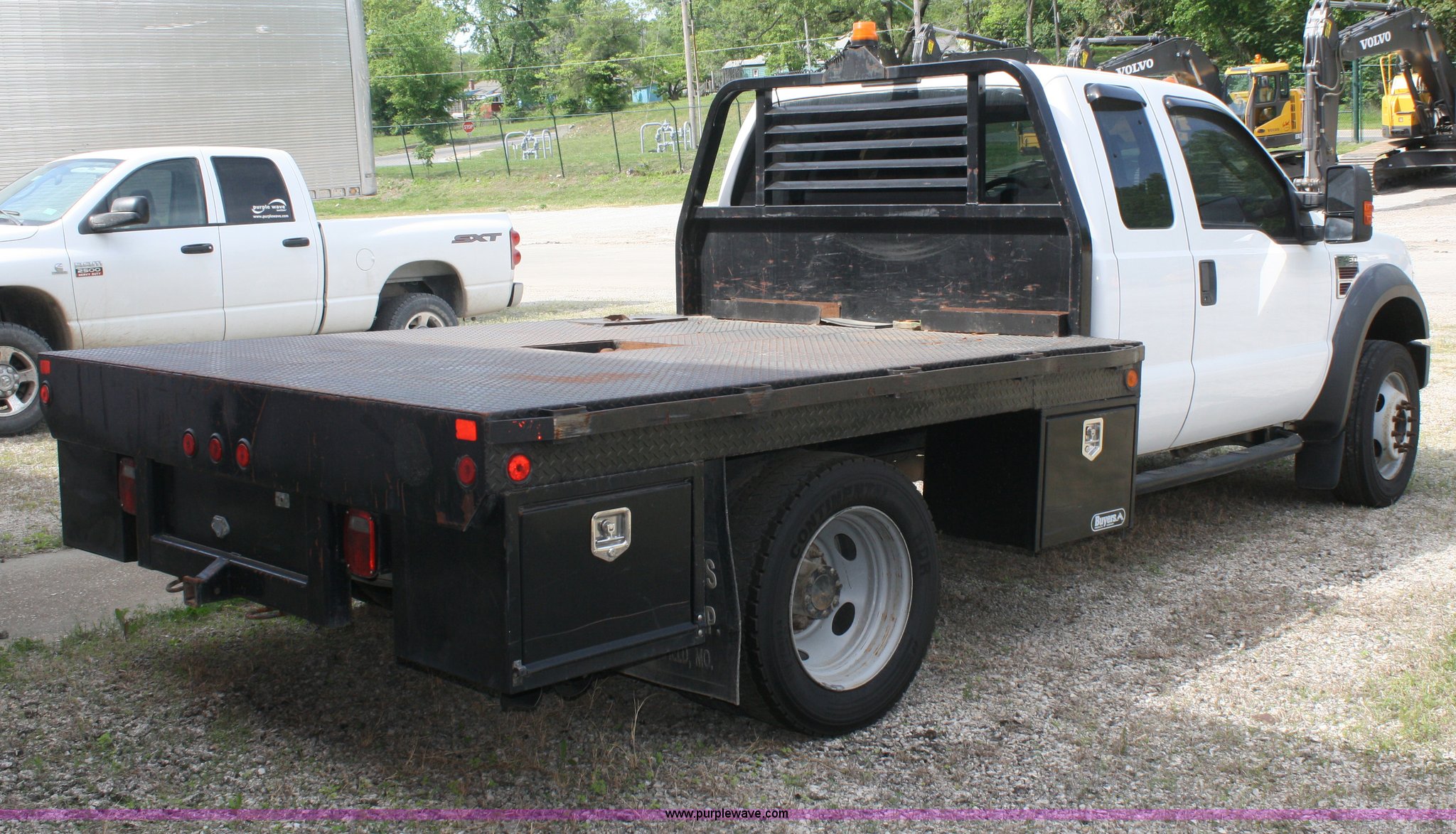 Purple Wave is selling a used Flat Bed Truck in Kansas. This item is a 2008 Ford F450 XLT flatbed pickup truck with the following: 253,016 miles on odometer, 6.4L diesel engine, Automatic transmission, AC and heat, Tilt, Cruise, AM/FM/CD, Power windows, locks, and mirrors, Cloth interior, 9'L x 99 1/2"W flatbed, Receiver hitch, Gooseneck ball, (4) under bed tool boxes, Brake controller, (4) auxiliary switches, Strobe light, 255/70R19.5