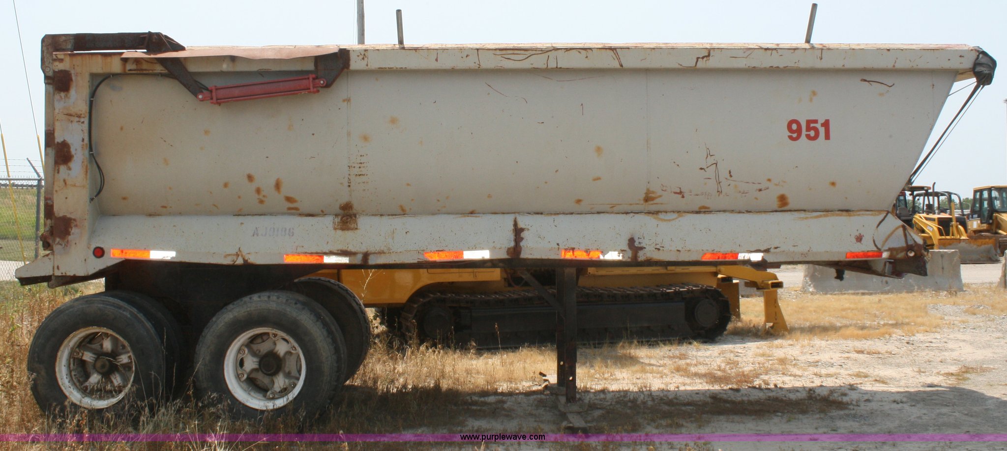 Purple Wave is selling a used End Dump Rock Trailer in Kansas. This item is a 1991 Hilbilt 21' end dump trailer with the following: Spring suspension, Air brakes, High lift end gate, Pneumatic cylinder, Pneumatic tailgate latch, Tarp, 11R22.5 tires, Hoist has been removed and is in the bed, Interior/exterior cosmetic damage