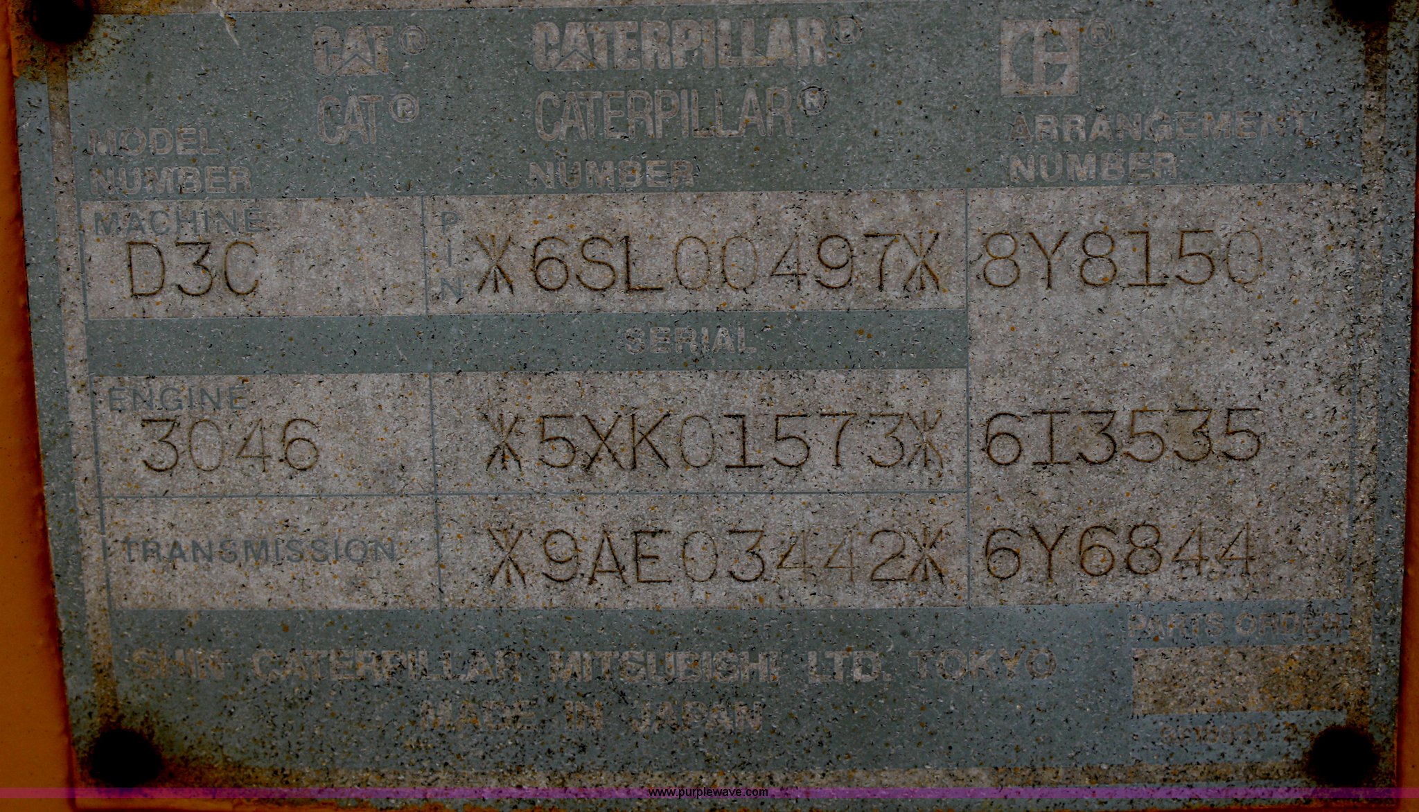 Purple Wave is selling a used Crawler Dozer in Kansas. This item is a 1994 Caterpillar D3C Series III dozer with the following: 386 hours on meter, Approx. 6,000 total hours, Caterpillar 3046 six cylinder diesel engine, 70 HP, Serial 5XK01573, Three speed powershift transmission, 8' six-way blade, Rear ripper, 16"W tracks, 386 hours on new transmission, Serial 6SL00497