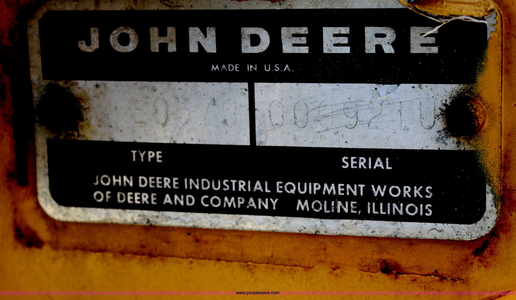Purple Wave is selling a used Motor Grader in Kansas. This item is a 1970 John Deere 570 motor grader with the following: 755 hours on meter, Six cylinder diesel engine, Eight speed transmission, 12' moldboard, Front mount scarifier with five shanks, 15.5-25 tires, Spare tire included, Serial 000921U
