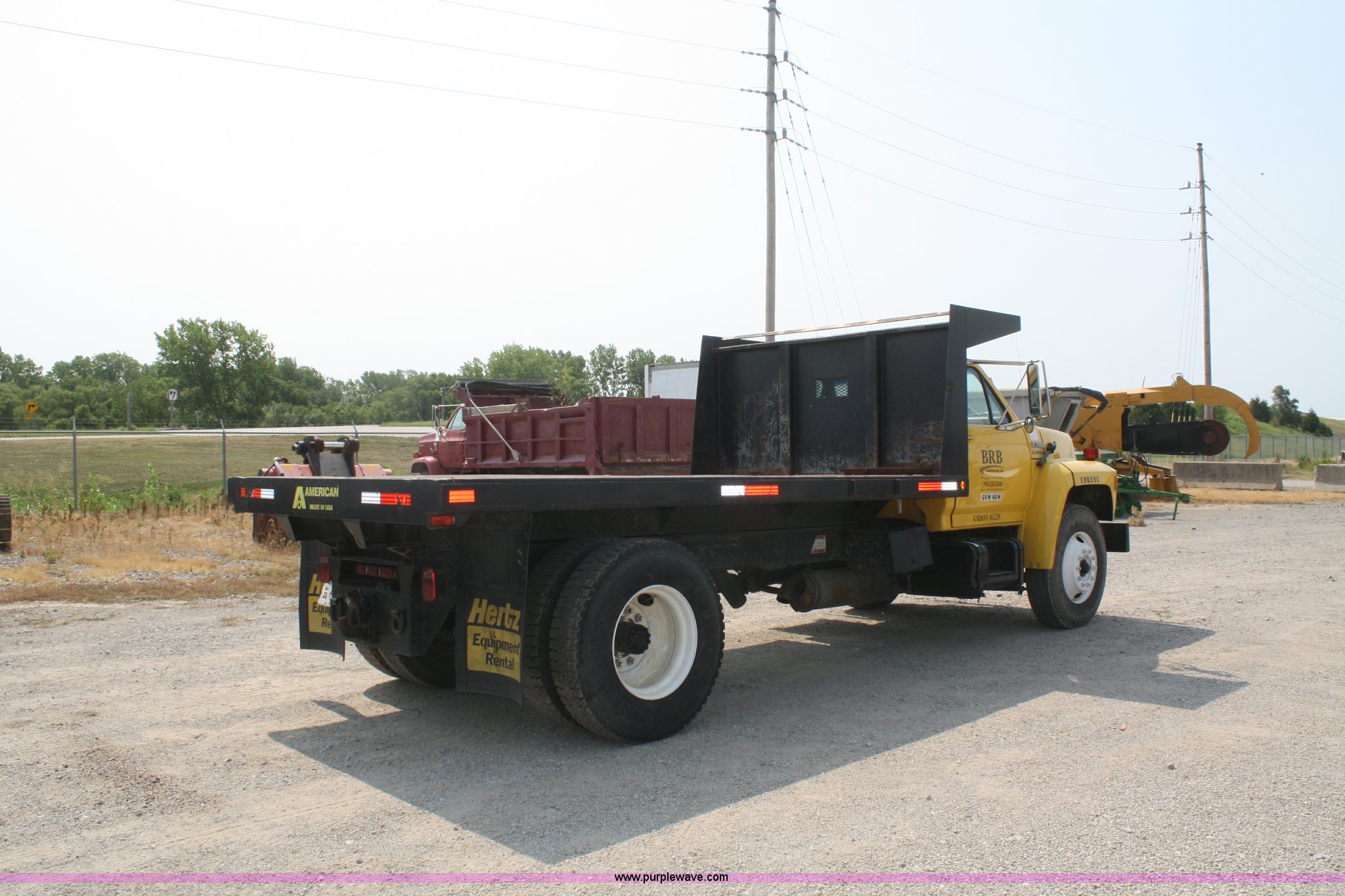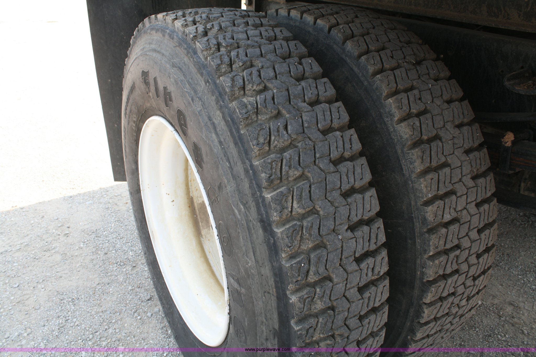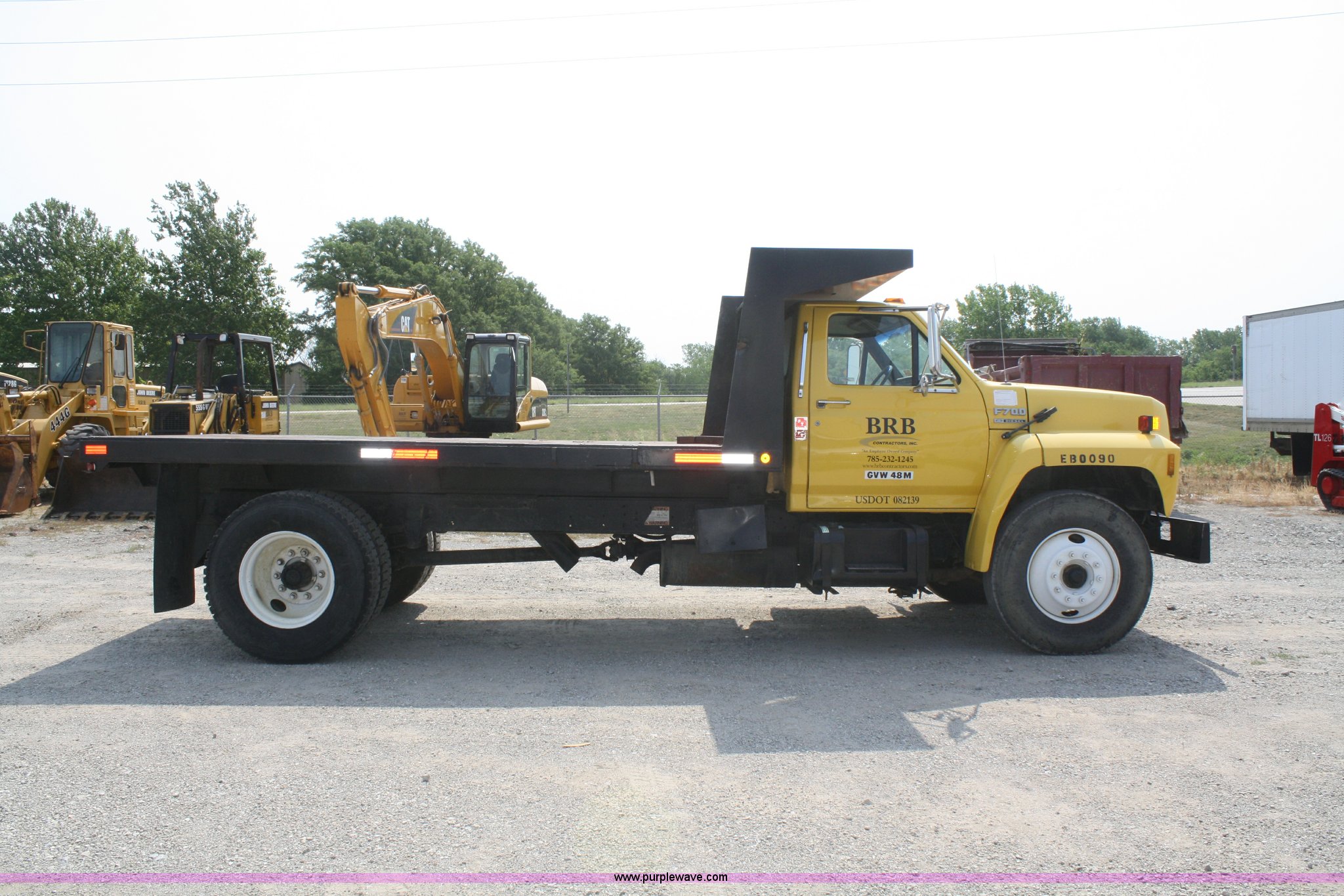 Purple Wave is selling a used Construction Dump Truck in Kansas. This item is a 1994 Ford F700 dump truck with the following: 90,397 miles on odometer, Cummins 5.9L L6 diesel engine, Six speed manual transmission, Heat, AM/FM, 14' x 8' flatbed with steel overlay, Two stage dual rams, Dual 35 gallon fuel tanks, Spring suspension, PTO, Pintle hitch, 11R22.5 tires, GVWR 28,000 lbs, Drivers side door handle and window handle broken