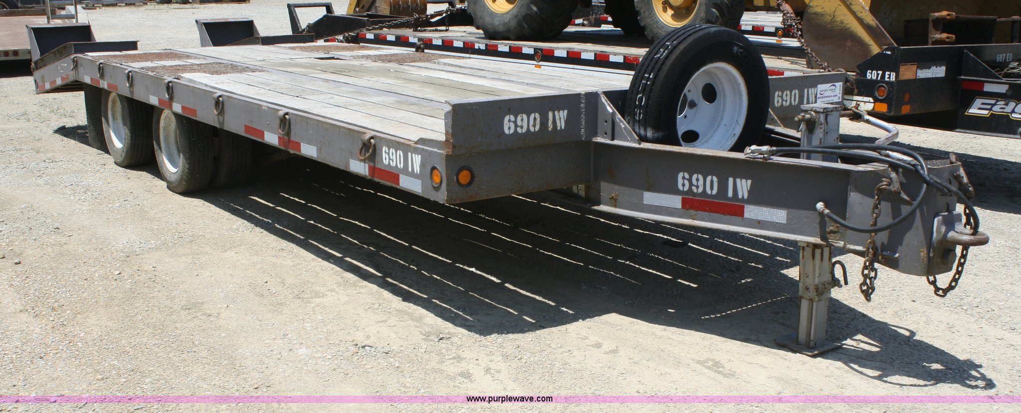 Purple Wave is selling a used Equip. Trailer in Kansas. This item is a 1990 Interstate double axle trailer with the following: 19'L x 8'W wood deck, 5' tail, 5' steel ramps, Spring suspension, Air brakes, Pintle hitch, 225/75R16 tires, Spare tire, GVWR 25,450 lbs