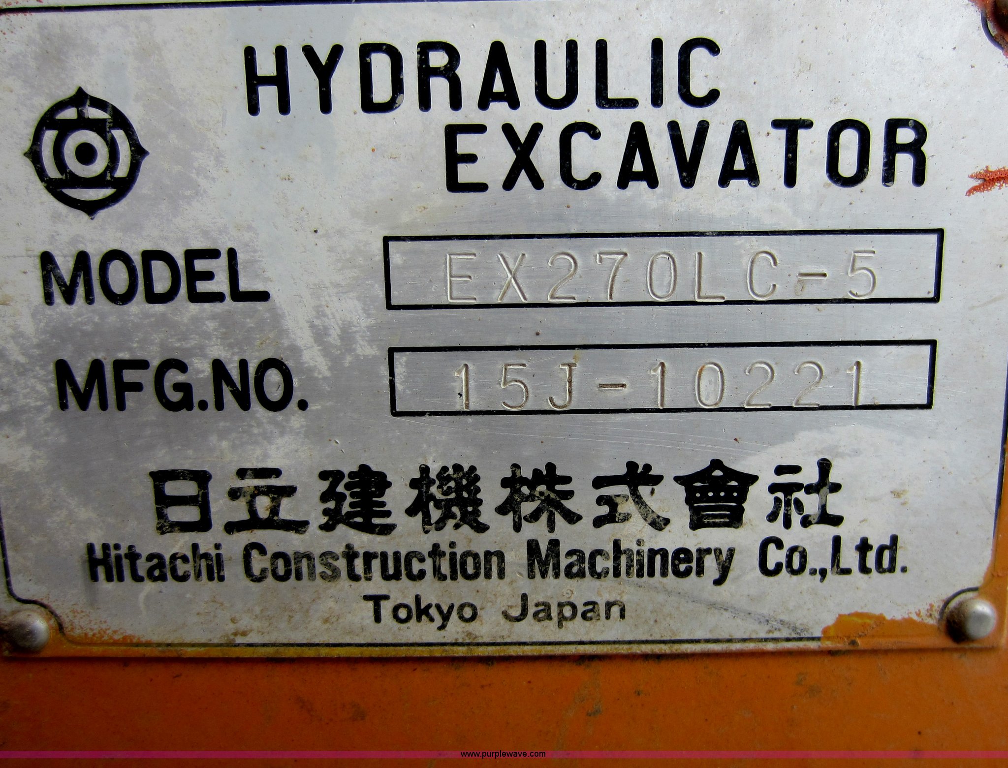 Purple Wave is selling a used Hydraulic Excavator in Kansas. This item is a 1997 Hitachi EX270 LC-5 excavator with the following: 6,601 hours on meter, Six cylinder turbo diesel engine, 168 HP, Joystick controls, AC and heat, 42" toothed bucket, 60,860 lbs. base operating weight, 32" triple grouser track pads, Serial 15J-10221
