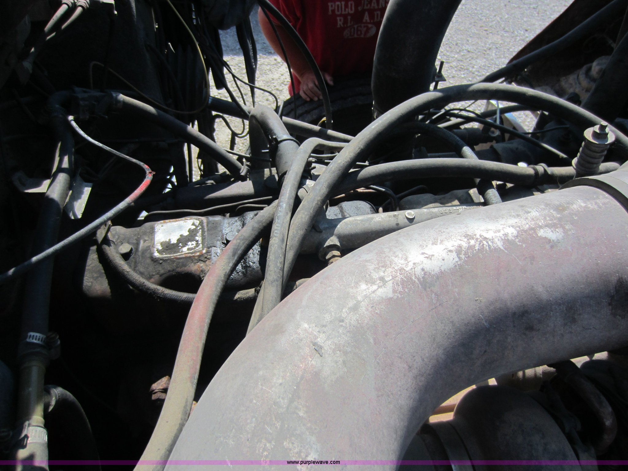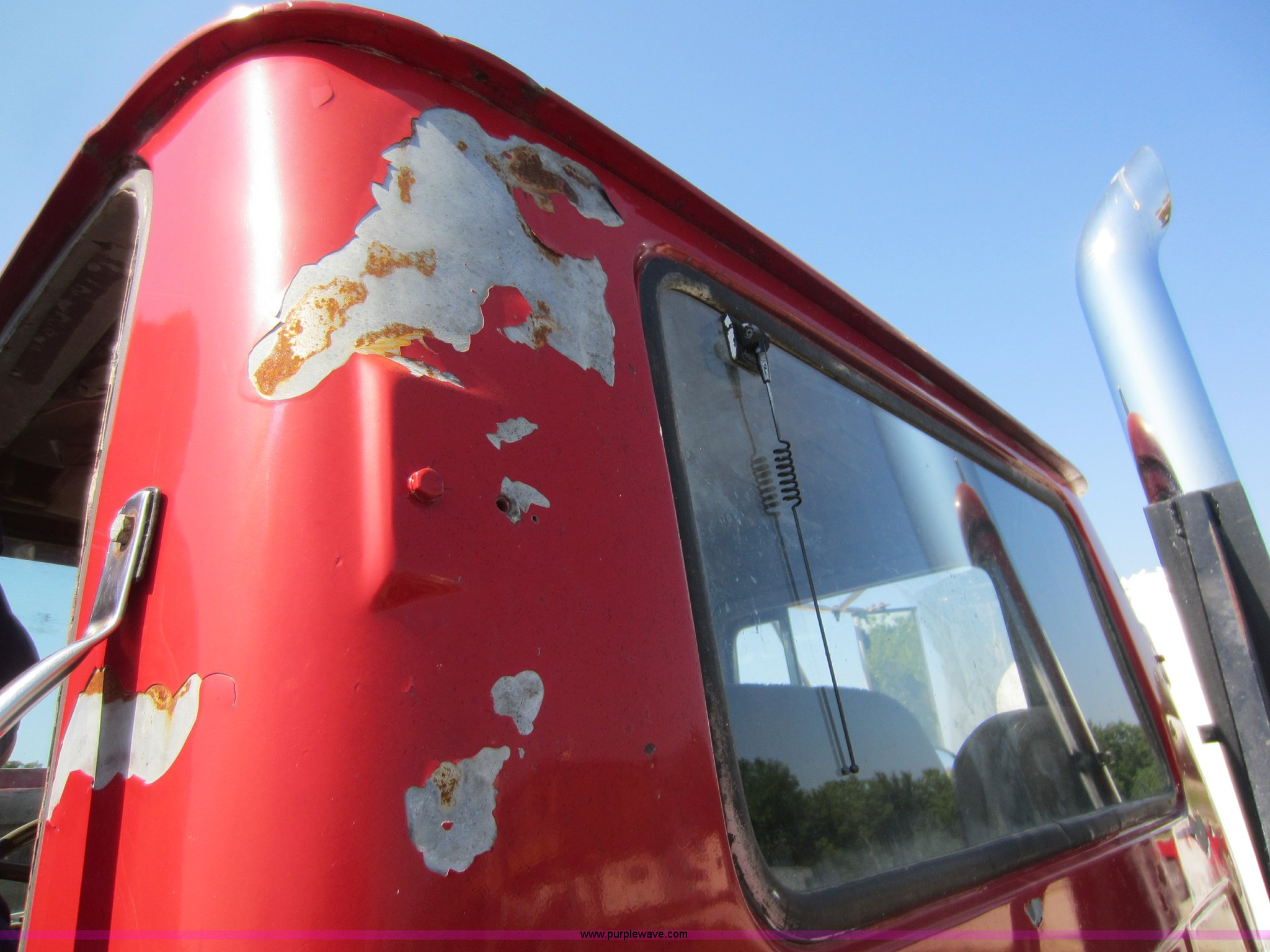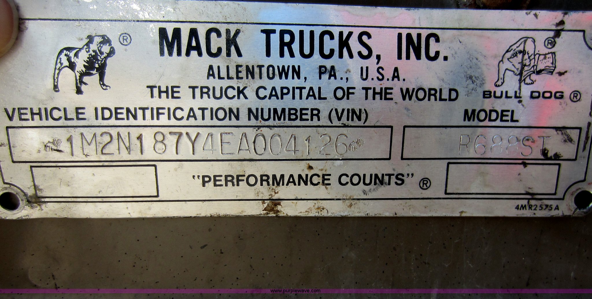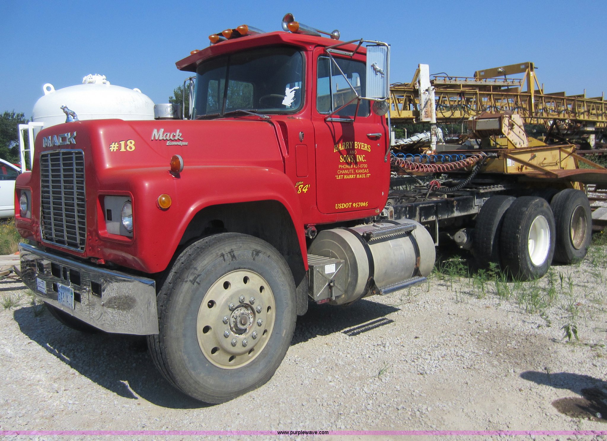 1984 Mack Econodyne R688ST semi truck. 398,656 miles on odometer Not actual mileage, 3,765 hours on meter, Mack E7 11.0L L6 turbo diesel engine 350 HP, Eaton Fuller 13 speed manual transmission, Heat, Air seats, Visor , Bumper, Block heater, Dual 80 gallon fuel tanks, Single rear exhaust stack, Sliding deck plate, Spring suspension Recently replaced camel back style, Air brakes, 198" wheelbase, Front aluminum rims, Rear steel rims, 11R24.5 front tires, 11R22.5 rear tires Worn, Exterior cosmetic damage, Paint peeling, Body rust, Dead battery. 1M2N187Y4EA004126. Shipping quotes available. Harry Byers & Sons, Inc.. 5th St and HWY 47. St. Paul, KS 66771