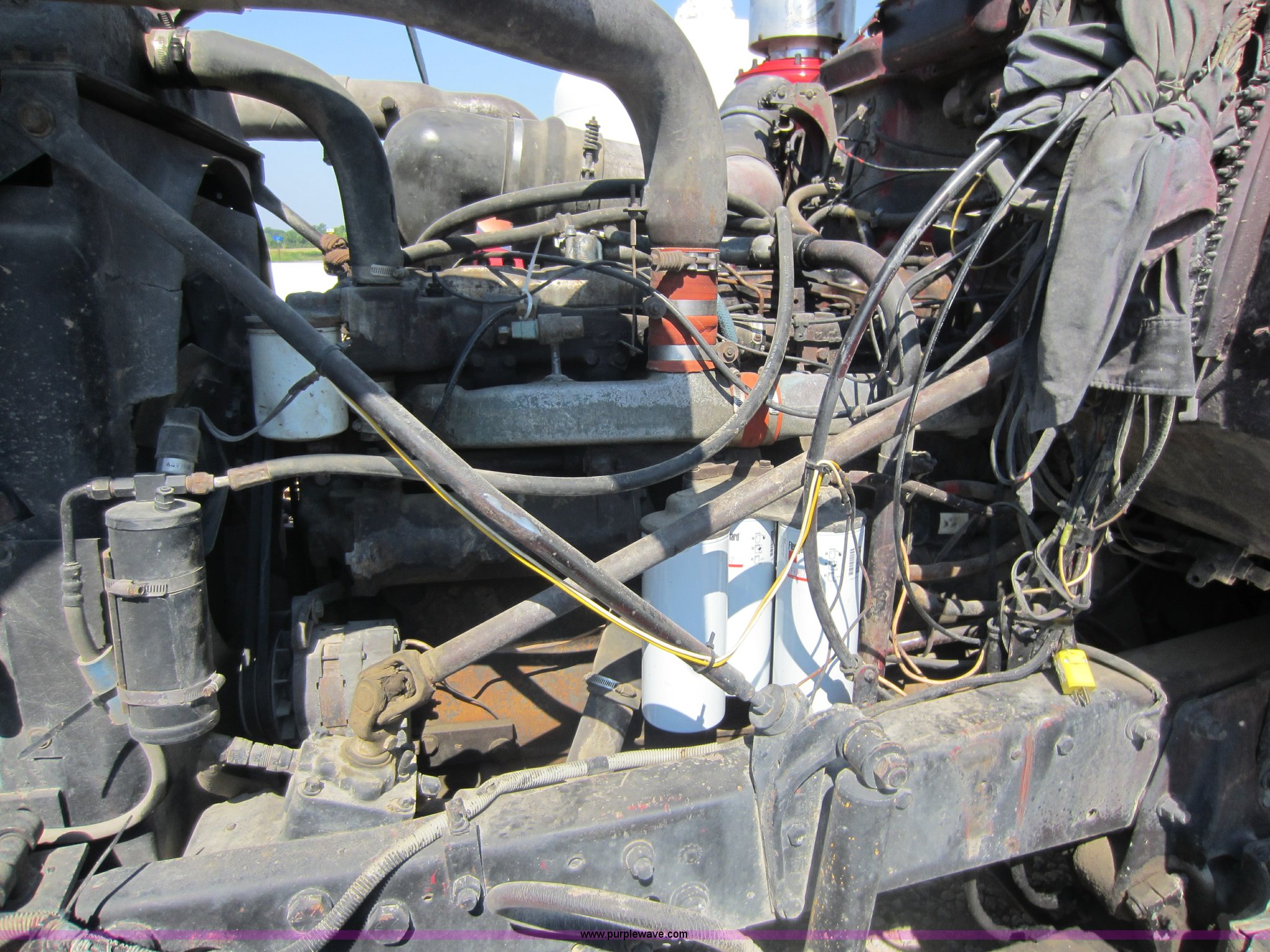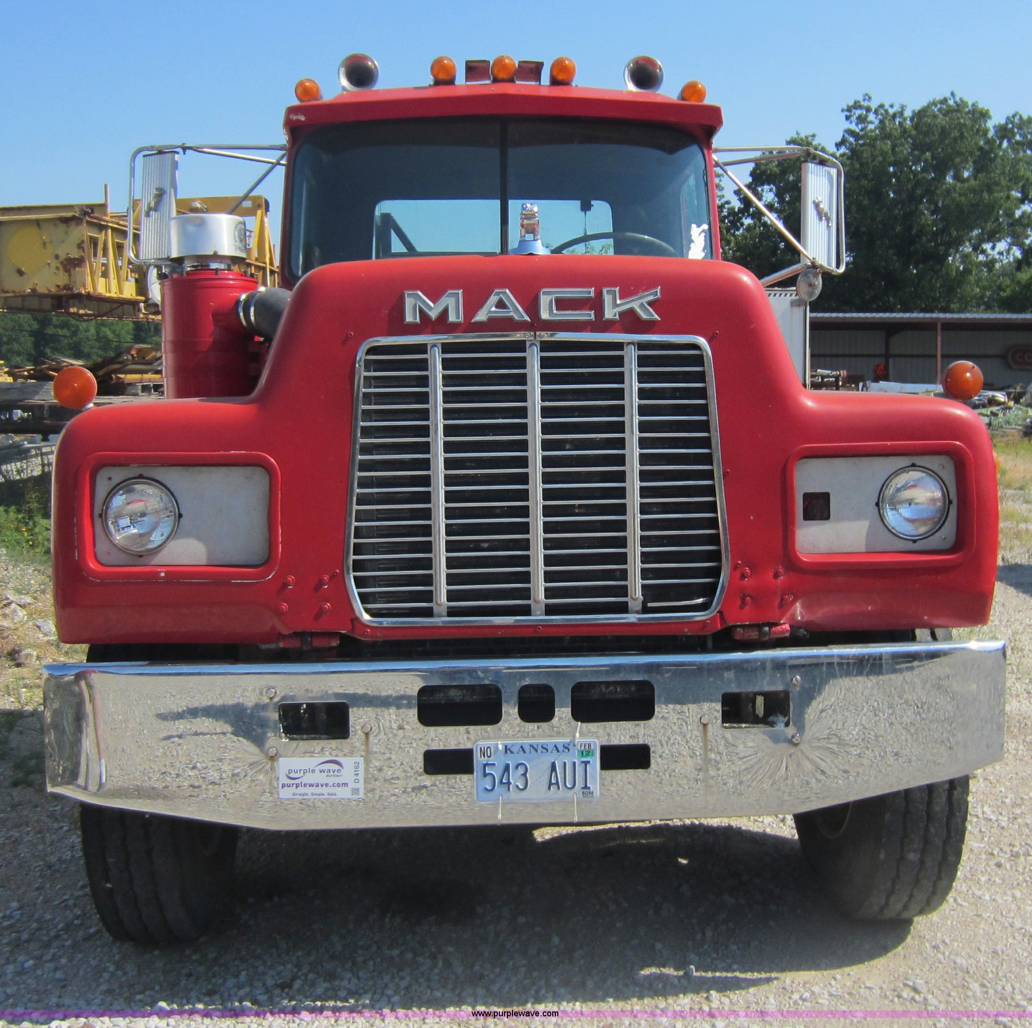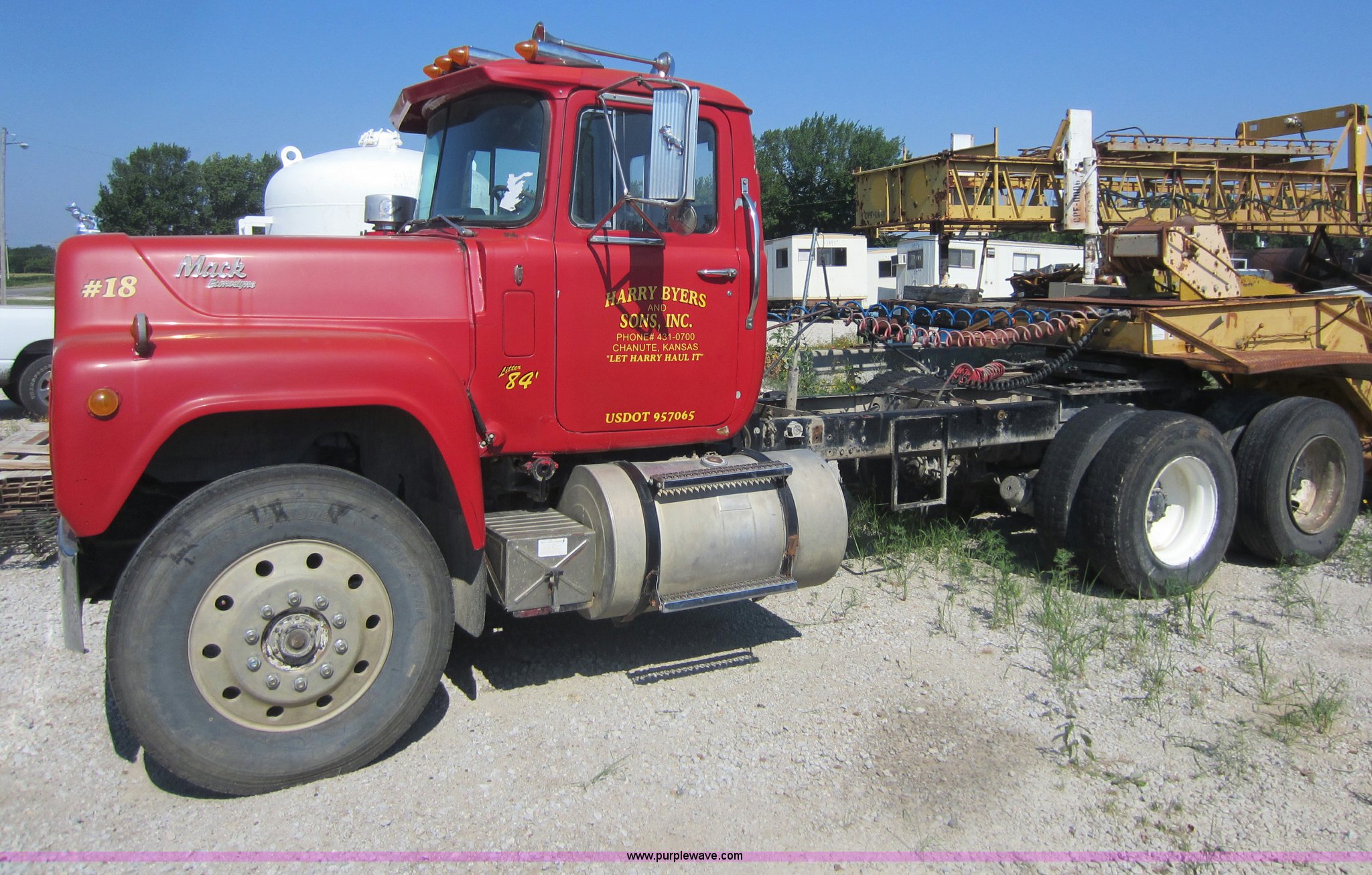 Purple Wave is selling a used Truck Tractor in Kansas. This item is a 1984 Mack Econodyne R688ST semi truck with the following: 398,656 miles on odometer, Not actual mileage, 3,765 hours on meter, Mack E7 11.0L L6 turbo diesel engine, 350 HP, Eaton Fuller 13 speed manual transmission, Heat, Air seats, Visor, Bumper, Block heater, Dual 80 gallon fuel tanks, Single rear exhaust stack, Sliding deck plate, Spring suspension, Recently replaced camel back style, Air brakes, 198" wheelbase, Front aluminum rims, Rear steel rims, 11R24.5 front tires, 11R22.5 rear tires, Worn, Exterior cosmetic damage, Paint peeling, Body rust, Dead battery