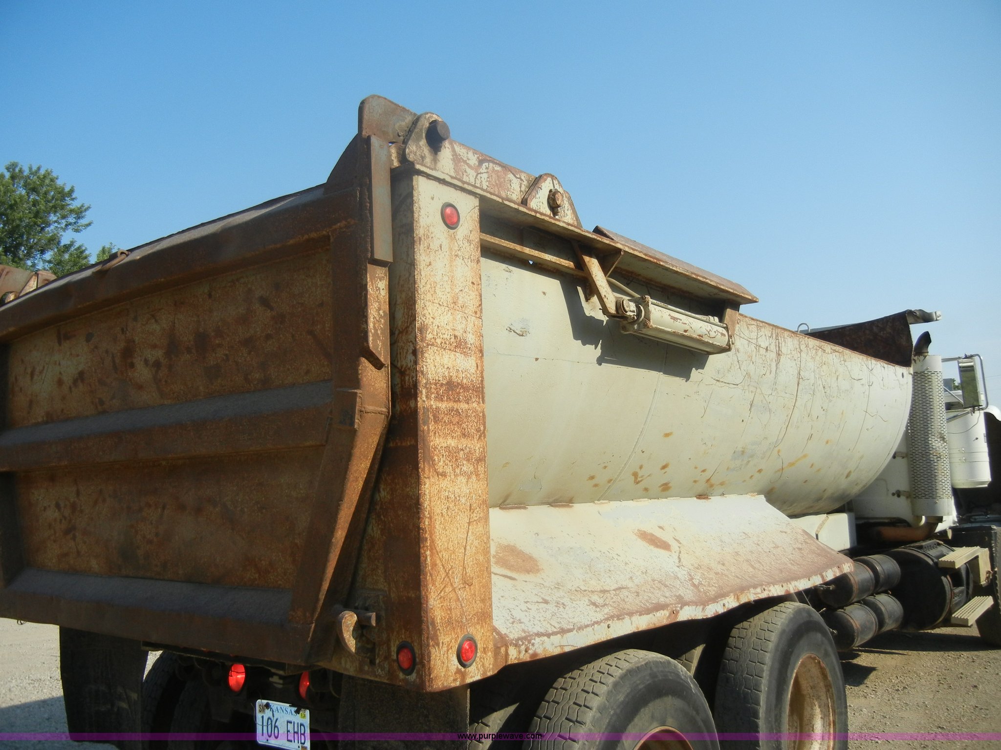 1986 Mack RS686LS barrel dump truck. 486,865 miles on odometer, 7,521 hours on meter, Mack E6 11.0L L6 diesel engine 300 HP, Maxi Torque Xtend Range five speed manual transmission Two speed Hi/Lo, Power divider lock, Heater, AM/FM/CD, Heated mirrors, Cloth air seats, 19' x 8' bed Hydraulic end dump, Dual three stage rams, Chrome bumper, Dual 50 gallon fuel tanks, Camel back spring suspension, Front tow hooks, Air brakes, 11R24.5 tires, Service records available. 1M2T152C1GM002949. View equipment video. Shipping quotes available. Herrman Excavating, Inc.. 1459 SE Jefferson. Topeka, KS 66607