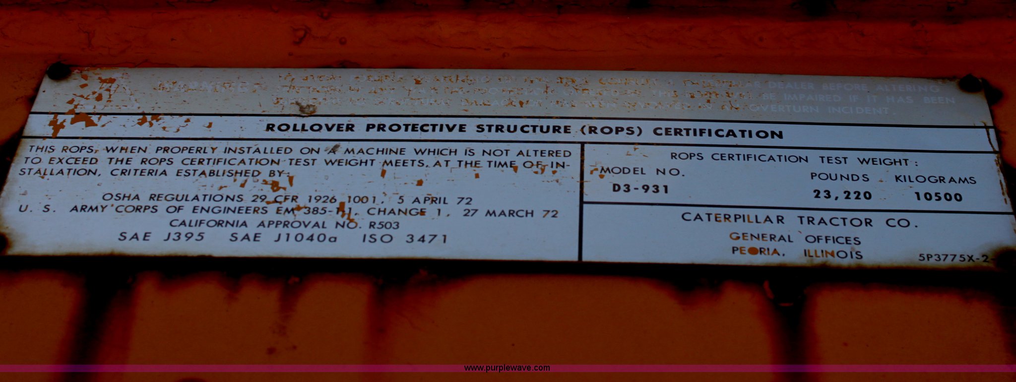Purple Wave is selling a used Crawler Dozer in Kansas. This item is a 1978 Caterpillar D3 dozer with the following: 577 hours on meter, Caterpillar 3204 diesel engine, 62 HP, Serial 45V18330, Three speed transmission, OROPS, Model D3-931, Spring suspension seat, 95" six-way blade, Two stick blade control, Rear pin hitch, 16" tracks, 1 5/8" tall, 10,610 lbs. base operating weight, Recently replaced under carriage, Arrangement No. 5G0520, Serial 79U5000