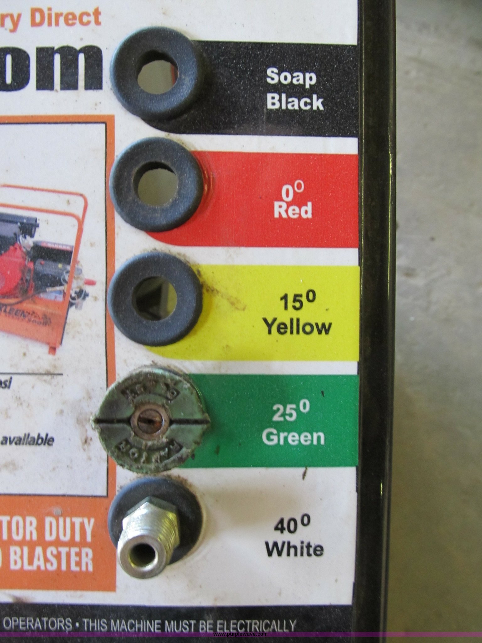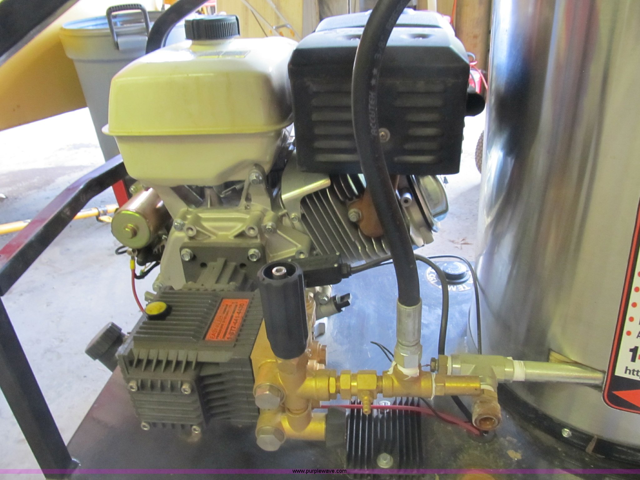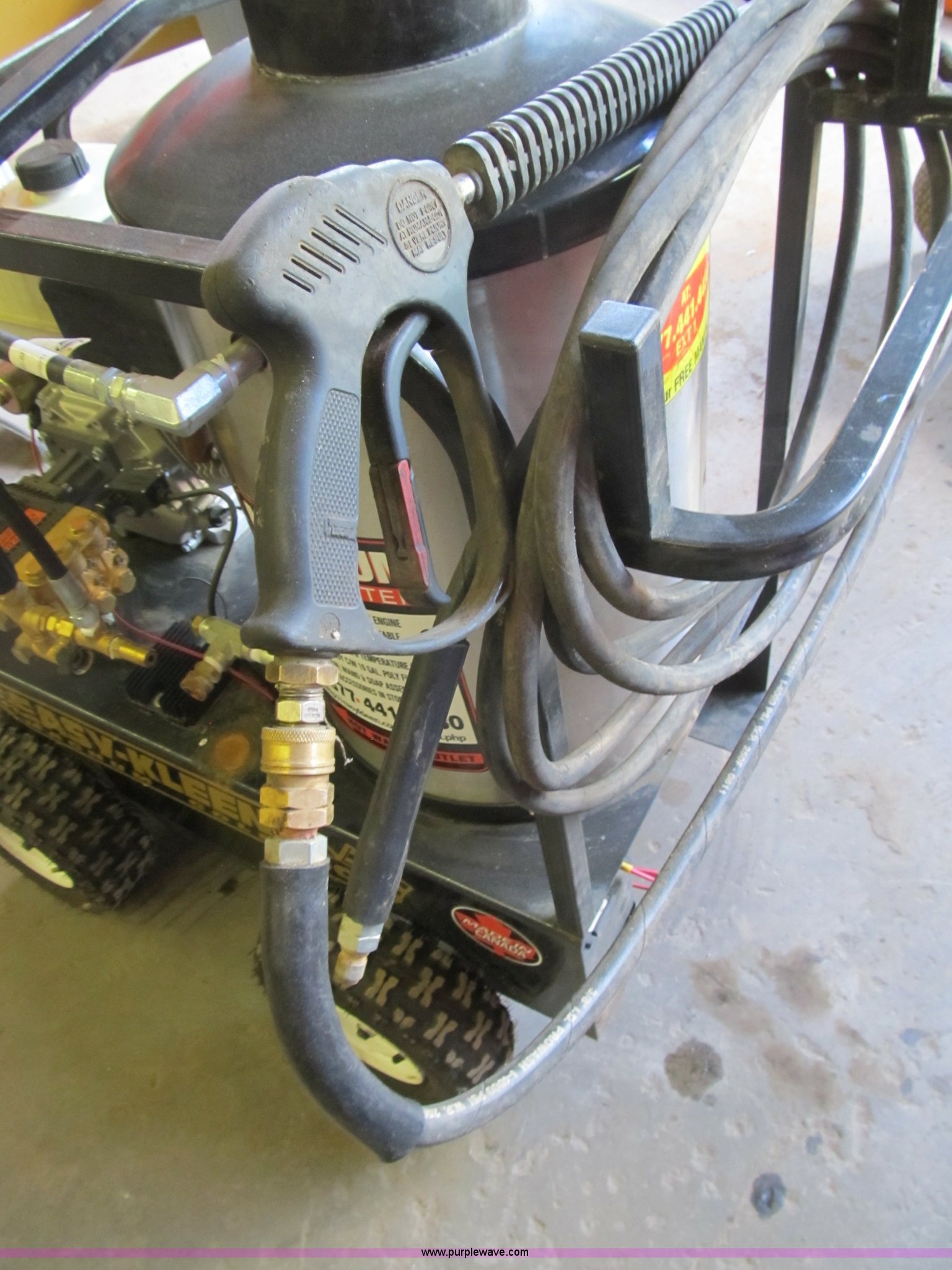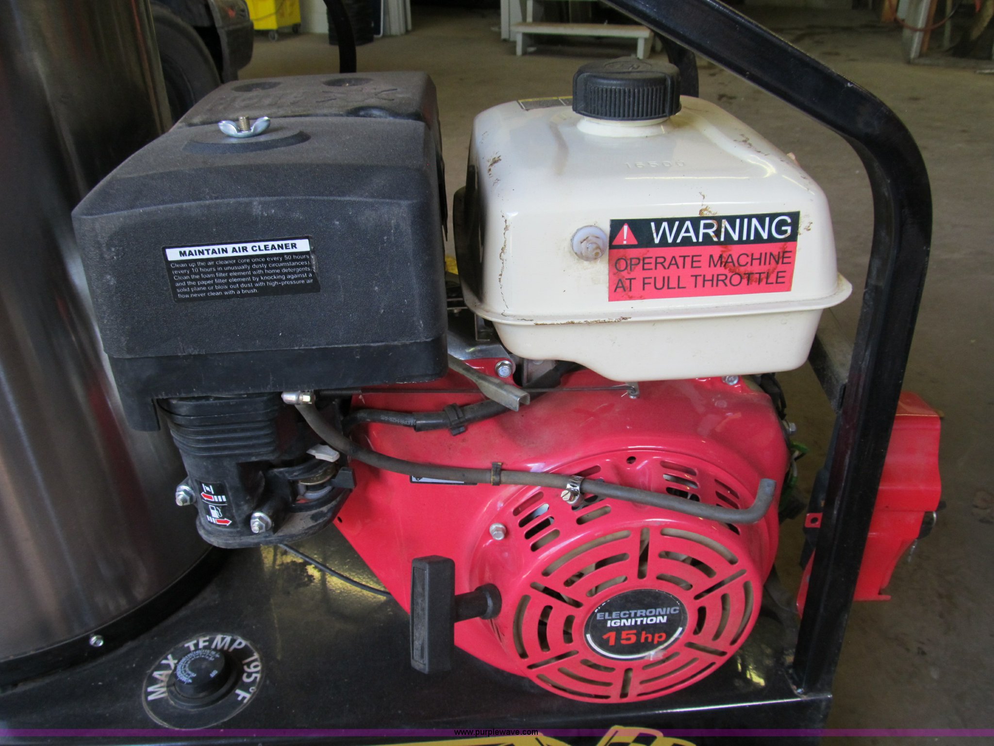 Purple Wave is selling a used Tools in Missouri. This item is a Easy Kleen Magnum Gold 4000 hot water pressure washer with the following: 15 HP gas engine, Electronic ignition, 3.5 gpm with 4,000 PSI adjustable pressure, Diesel fired burner, 190 degrees Fahrenheit maximum temperature, Adjustable temperature, Hi-pressure hose, gun, wand, and soap assembly, (2) fittings included, Self contained 12V battery to power diesel burner