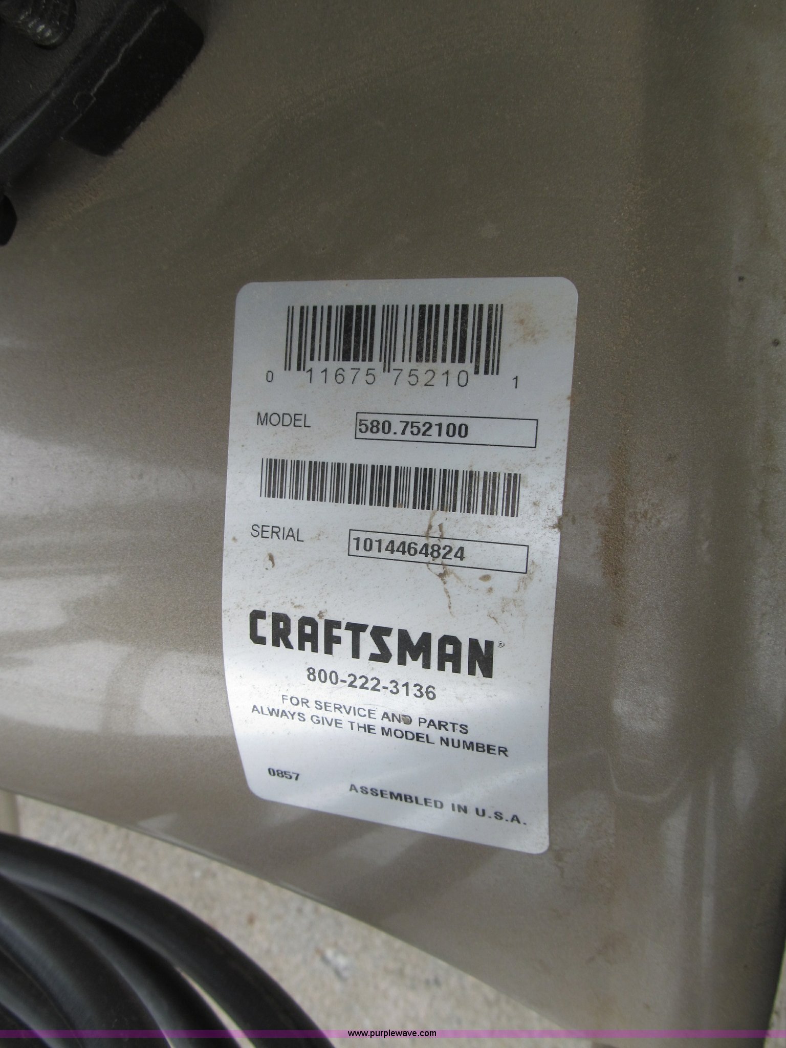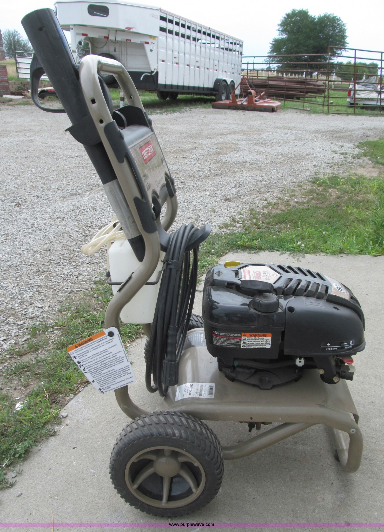 Purple Wave is selling a used Tools in Nebraska. This item is a Craftsman 2,700 PSI gas powered pressure washer with the following: Briggs & Stratton 850 Special Edition gas engine, 190 cc OHV, 25"L x 21"W x 38"H, 2-in-1 detergent system, 3,000 PSI hose with threaded ends, Approx. 25', Two-piece wand with safety and safety trigger, Removable Project Pro wand end, Adjustable output, Rear mounted detergent tank with shut-off valve, Craftsman rotating brush kit, Cart with removable handle, Two wheel roll-around, 10" rubber tires on plastic rims, Owners manual, Model 580.752100, Serial 1014464824