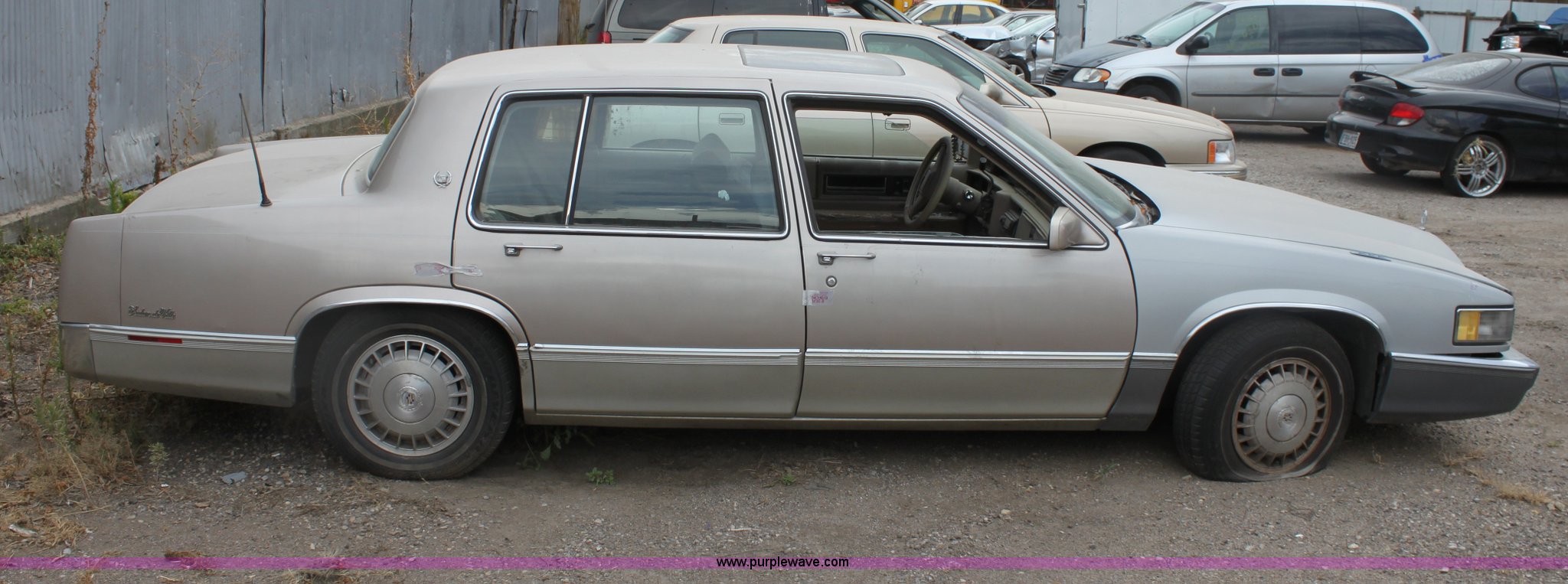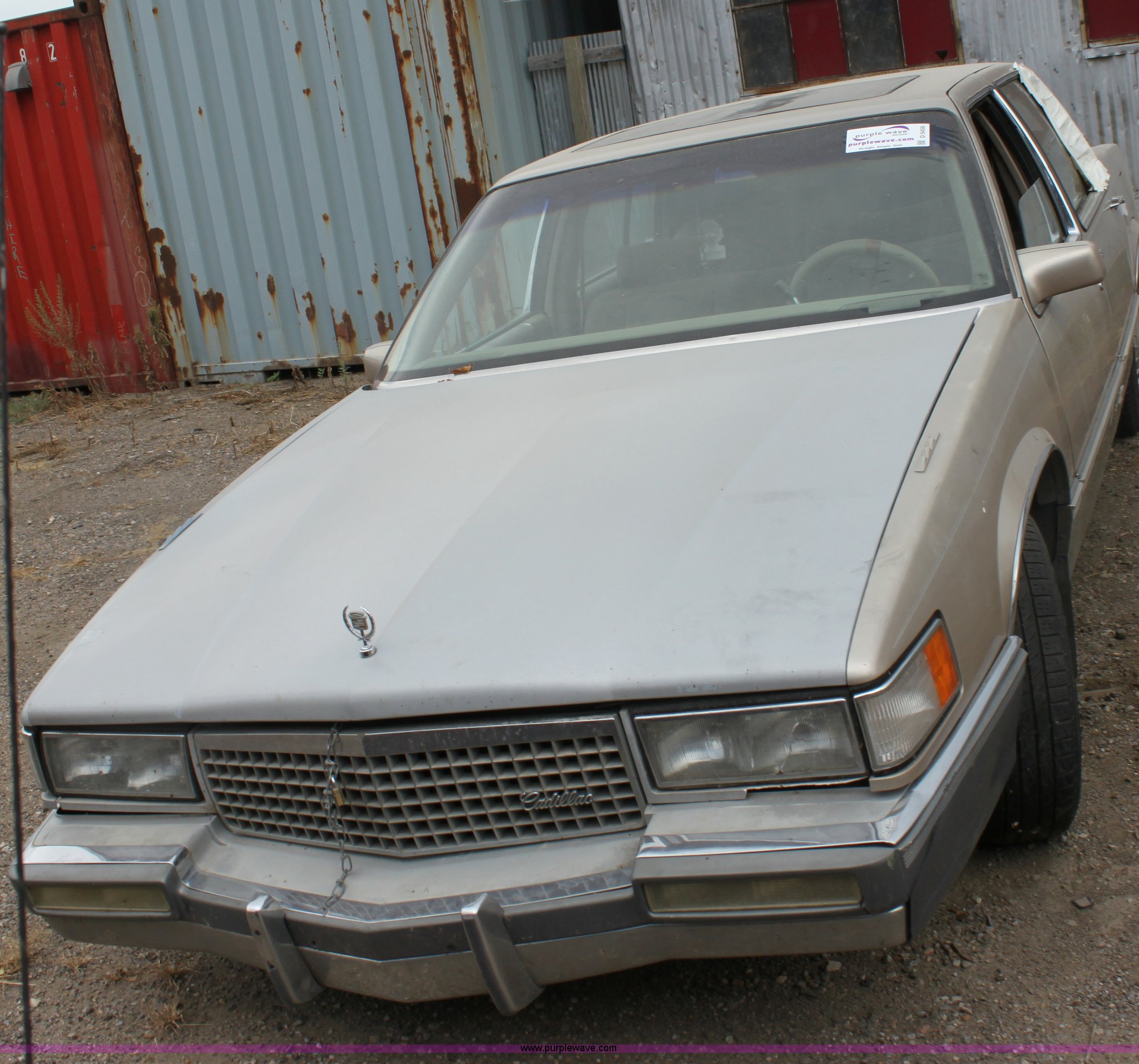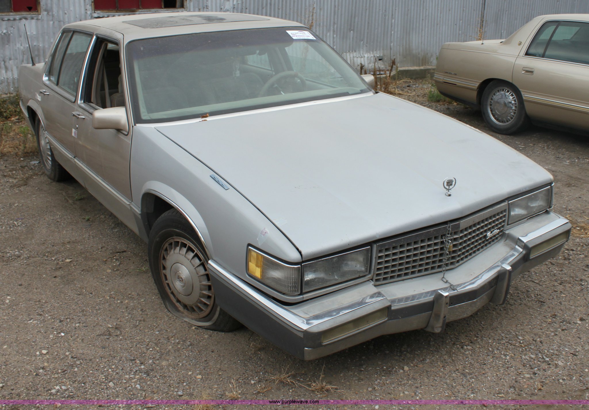 Purple Wave is selling a used Wrecked and Abandoned in Kansas. This item is a 1989 Cadillac DeVille with the following: Mileage unknown, 4.5L V8 DI gas engine, Automatic transmission, AC and heat, Tilt, Cruise, AM/FM/CD, Power windows, locks, and mirrors, Cloth interior, Sunroof, 205/70R15 tires, Flat tire, Interior/exterior cosmetic damage, Side window broken, Hood is chained shut, Vehicle does not have keys, Item must be removed by 7 p.m. August 7th or additional charges will be incurred., Case# 12C034639