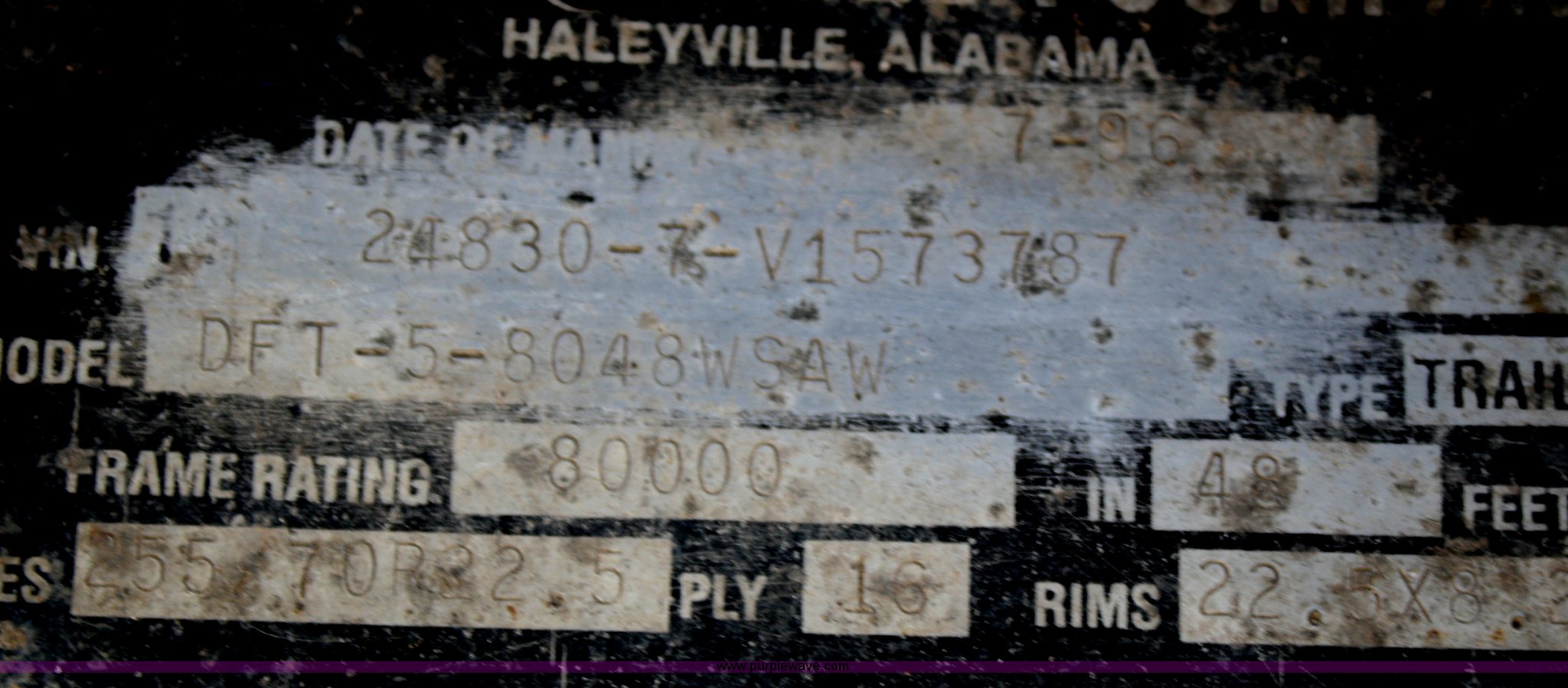 Purple Wave is selling a used Flat or Drop Deck Trailer in Kansas. This item is a 1996 Fontaine drop deck trailer with the following: 48'L x 102"W, 11'L upper deck, Air suspension, Air brakes, (8) boomers, (8) assorted chains, 275/70R22.5 tires, 80,000 lb frame rating, GAWR 20,000 lbs, Model DFT-58048WSAW