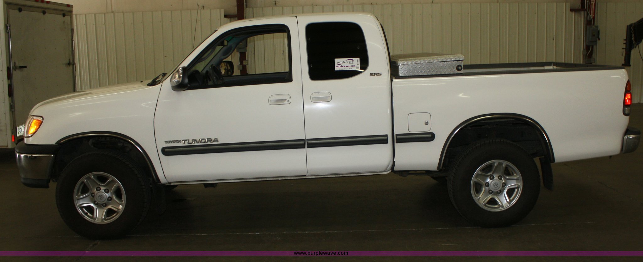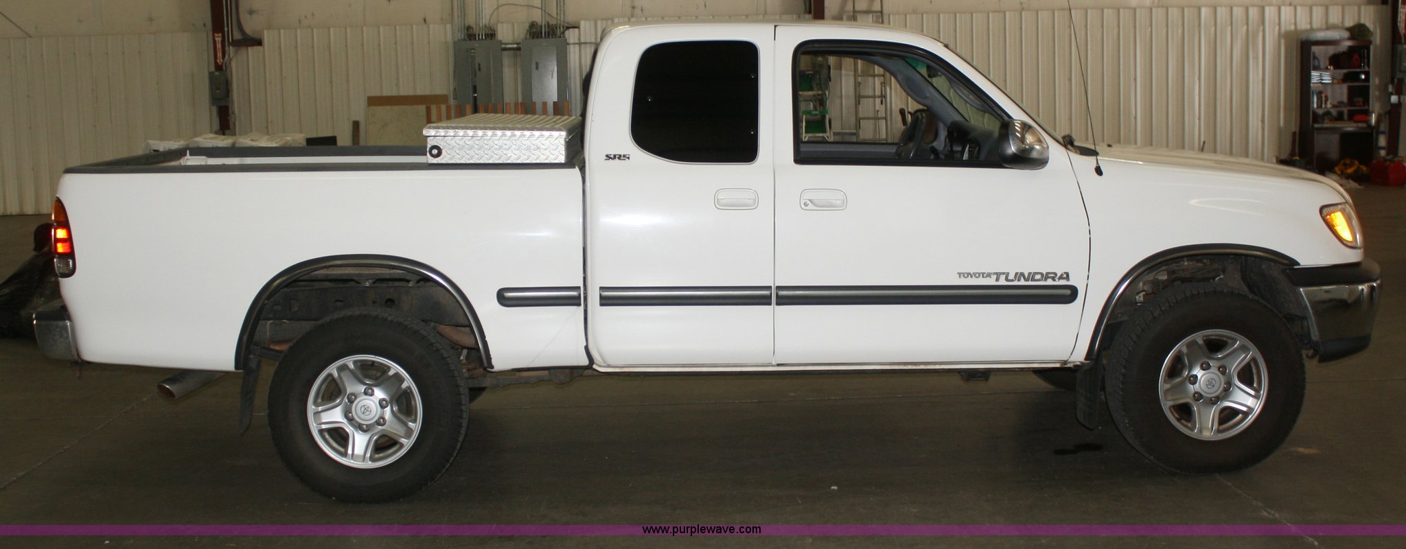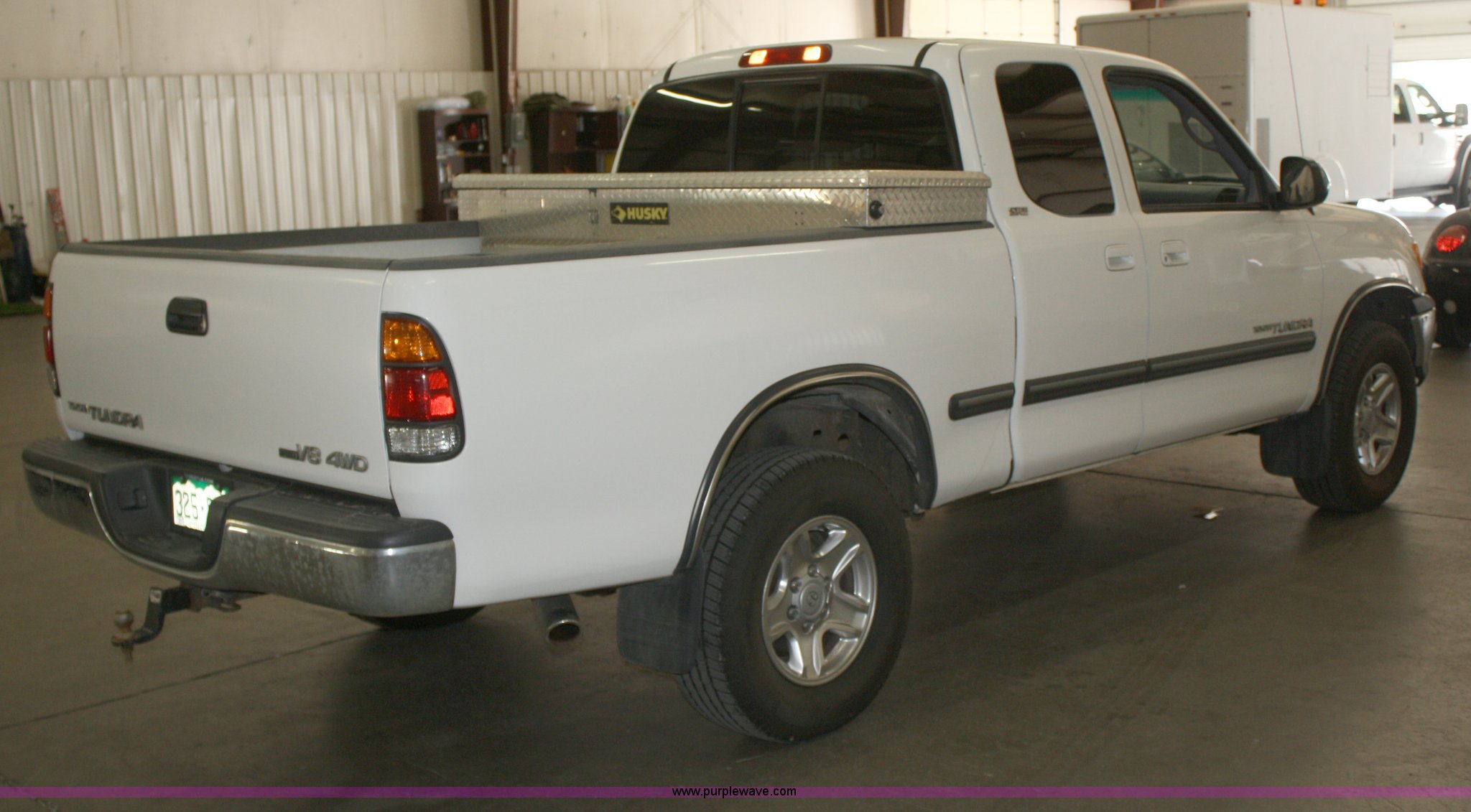 Purple Wave is selling a used Compact Pickup or Van in Kansas. This item is a 2002 Toyota Tundra SR5 Access Cab pickup truck with the following: 245,095 miles on odometer, 4.7L V8 EFI gas engine, Automatic transmission, Four wheel drive, AC and heat, Tilt, Cruise, AM/FM/Cassette, Power windows, locks, and mirrors, Cloth interior, Husky toolbox, Receiver hitch, 255/70R16 tires, Cracked windshield