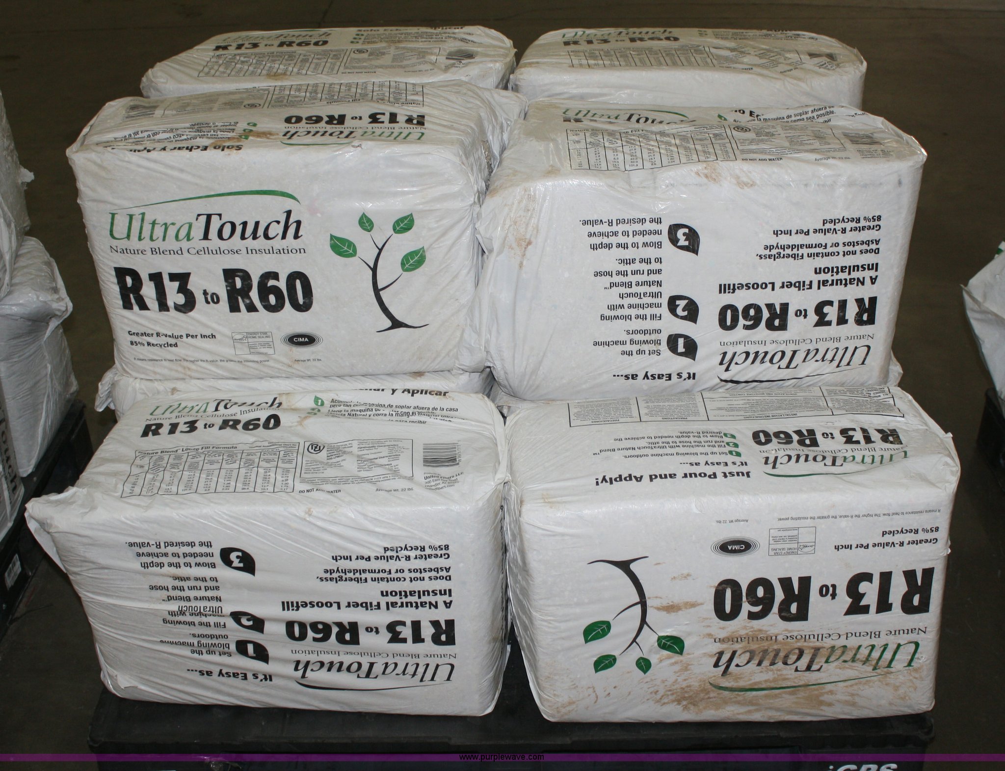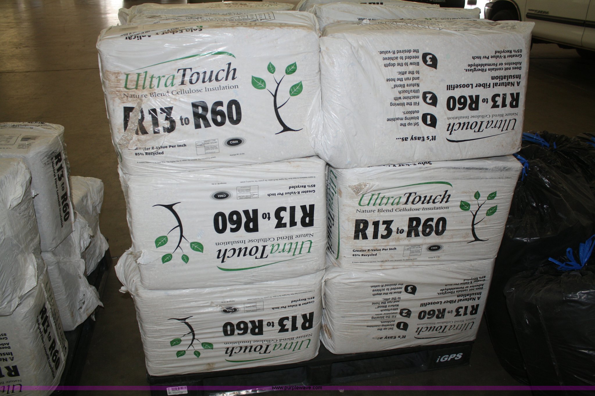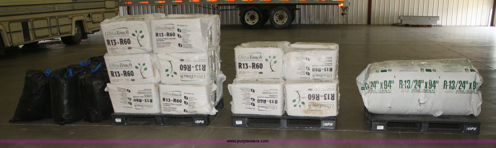Purple Wave is selling a used Home Improvement in Kansas. This item is a Assorted insulation with the following: (8) R13, 24" x 94", 126.63 sq. ft., (28) Ultra Touch cellulose insulation, R13 to R60, 22 lb bags, (8) bags of unknown insulation